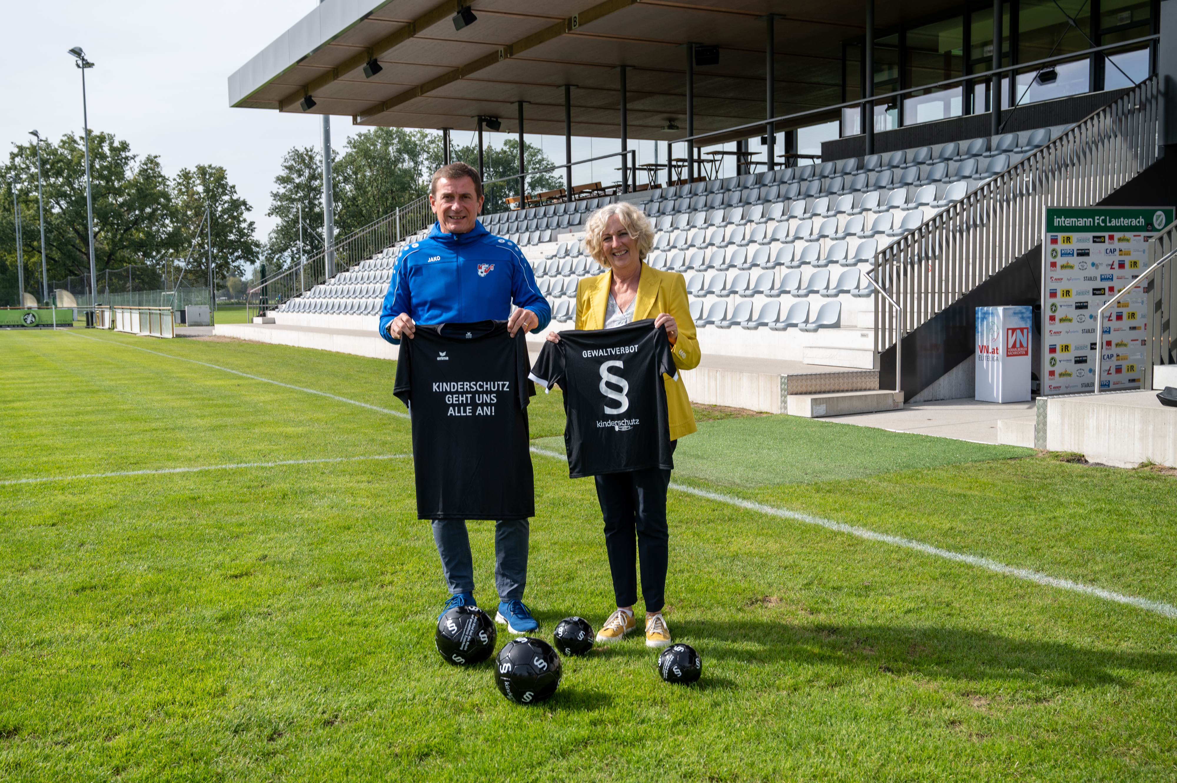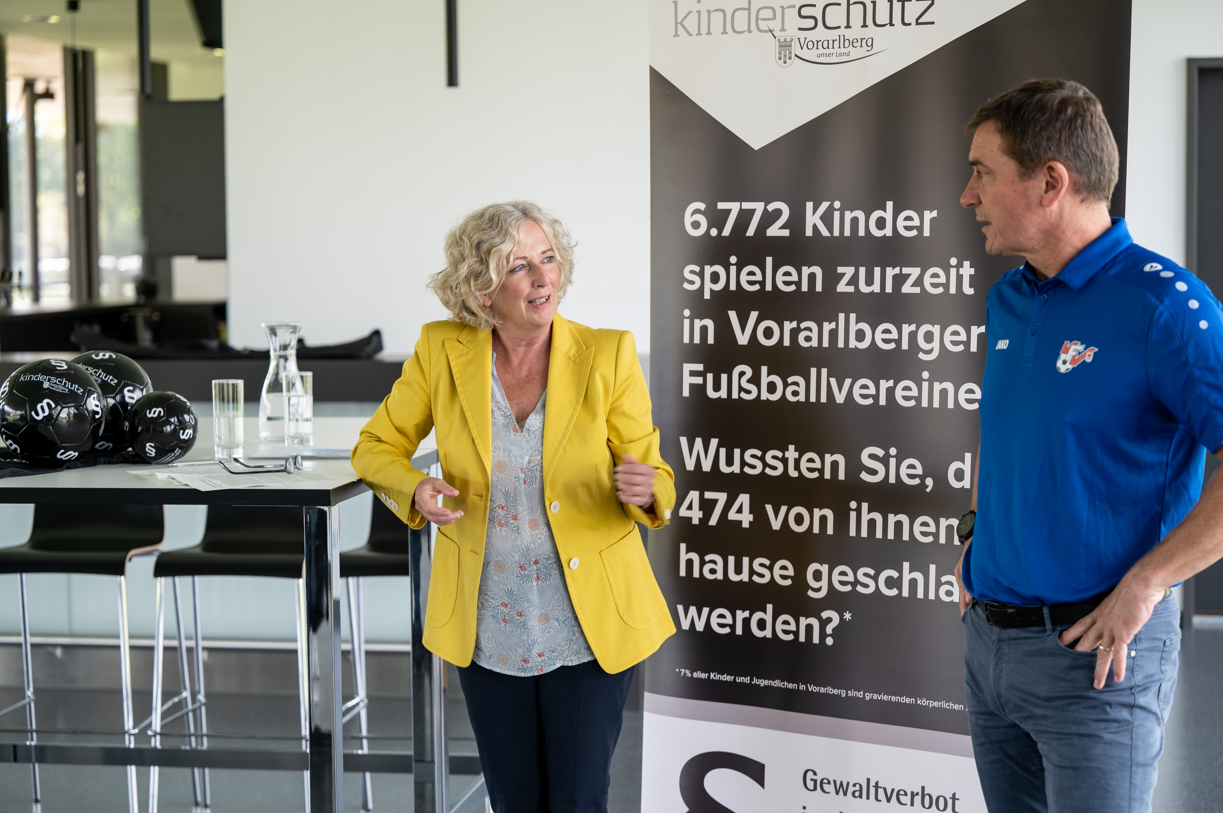 Lauterach (VLK) – Kinderschutz geht uns alle an! Kinder und Jugendliche haben das Recht auf ein gewaltfreies Leben. Diese klare Botschaft steht im Zentrum einer Sensibilisierungskampagne des Sozialfonds Vorarlberg (Land und Gemeinden), um das Gewaltverbot in der Erziehung verstärkt ins Bewusstsein der Öffentlichkeit zu rufen. Im Beisein von Soziallandesrätin Katharina Wiesflecker und Sportdirektor des Vorarlberger Fußballverbands (VFV) Andreas Kopf wurde die Kampagne bei der heutigen Pressekonferenz im Klubheim des FC Lauterach vorgestellt. „Kindern darf keine Gewalt angetan und weder körperliches noch seelisches Leid zugefügt werden – nicht in der Schule, nicht in der Familie und auch nicht sonstwo. Auch die Unterstützung durch den Vorarlberger Fußballverband und deren Engagement für den Kinderschutz bringt uns als Gesellschaft weiter“, betont Wiesflecker.