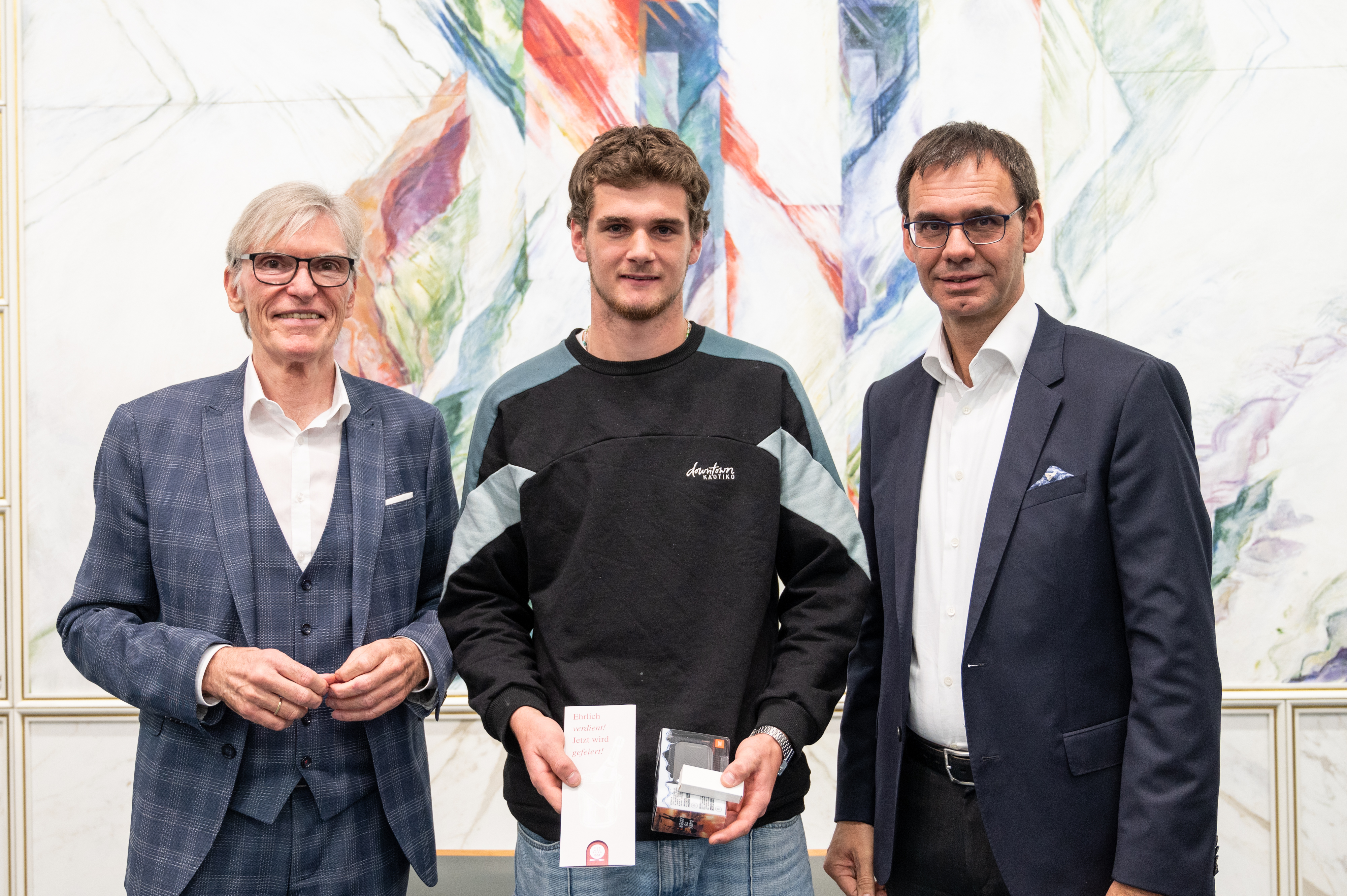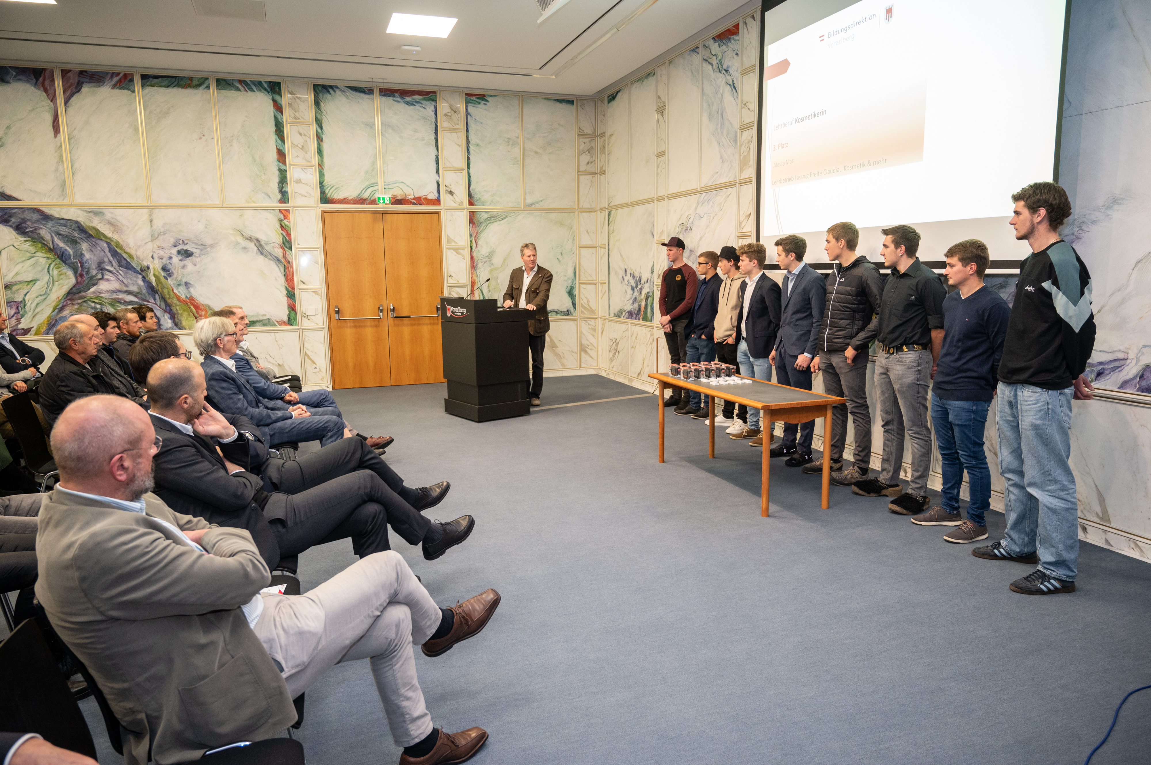 Am Montagabend (21. November) sind insgesamt zehn Lehrlinge von Landeshauptmann Markus Wallner, Wirtschaftslandesrat Marco Tittler und Wirtschaftskammerpräsident Wilfried Hopfner für ihren Erfolg bei bundesweiten Lehrlingswettbewerben gewürdigt worden. Zwei erste, vier zweite und vier dritte Plätze konnten die Jugendlichen belegen. Hinter diesen herausragenden Leistungen stecke viel Selbstdisziplin und Leistungsbereitschaft, wie Wallner in seinen Gratulationsworten betonte: „Wir sind sehr stolz auf euch!“