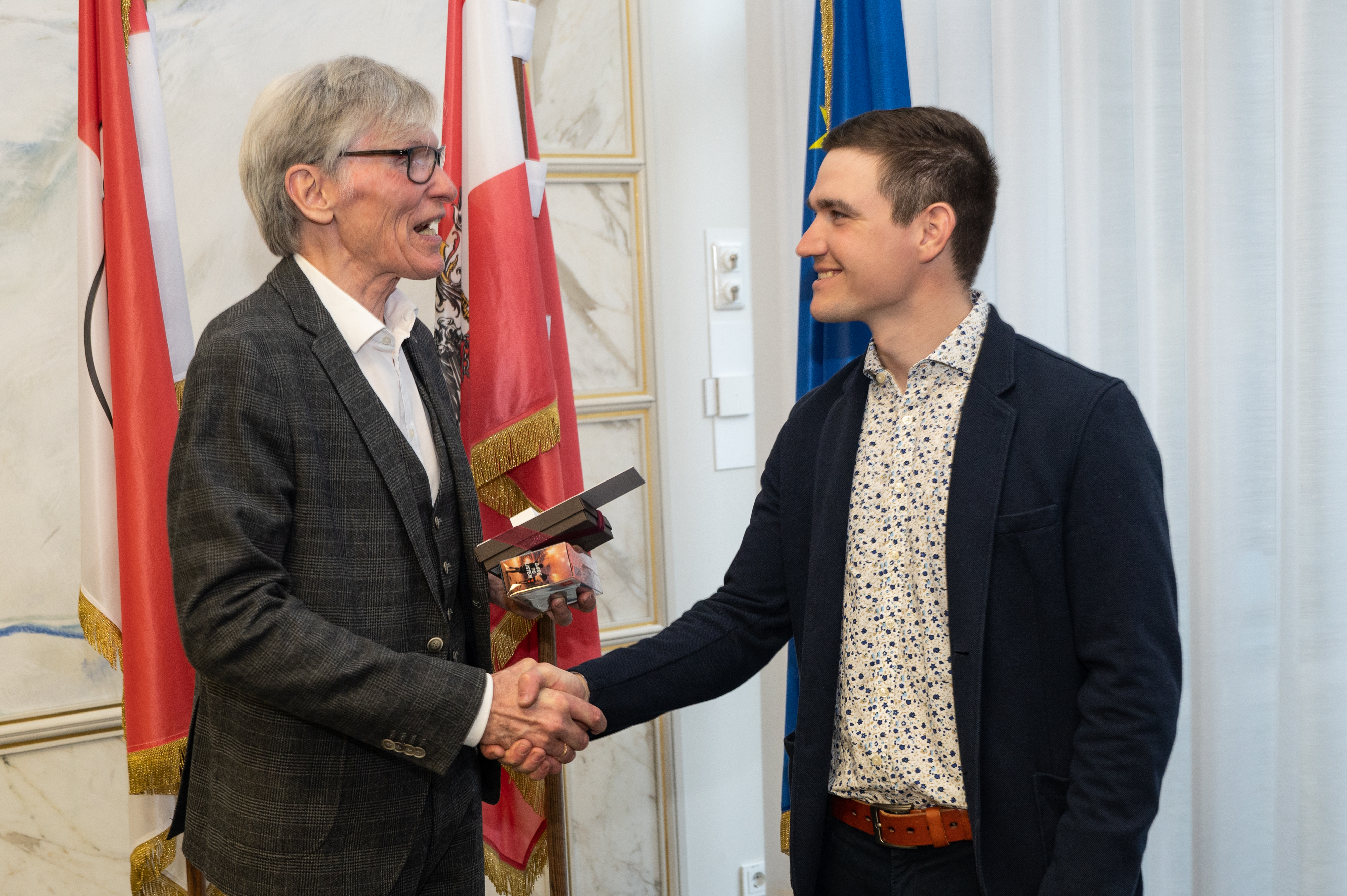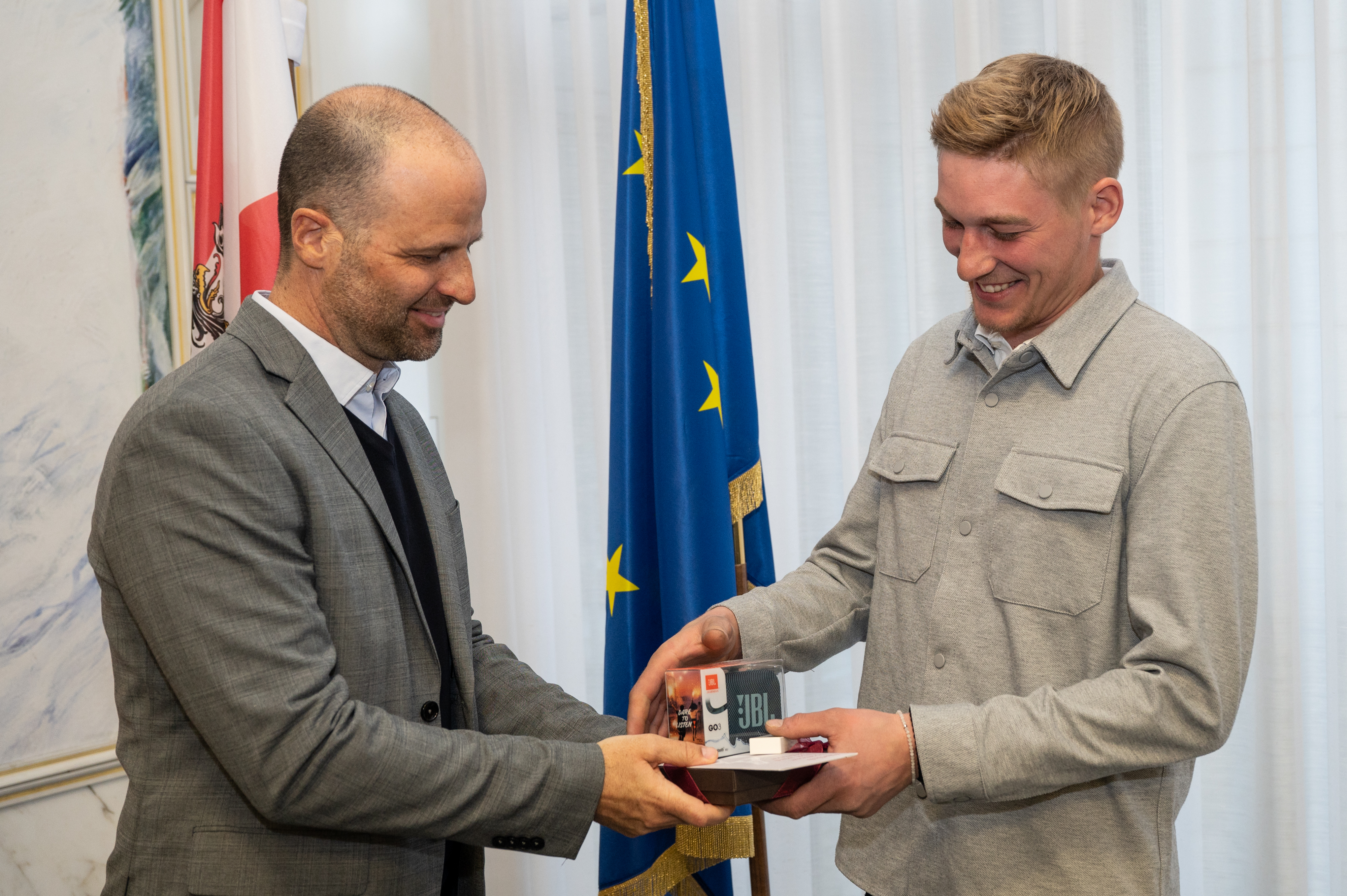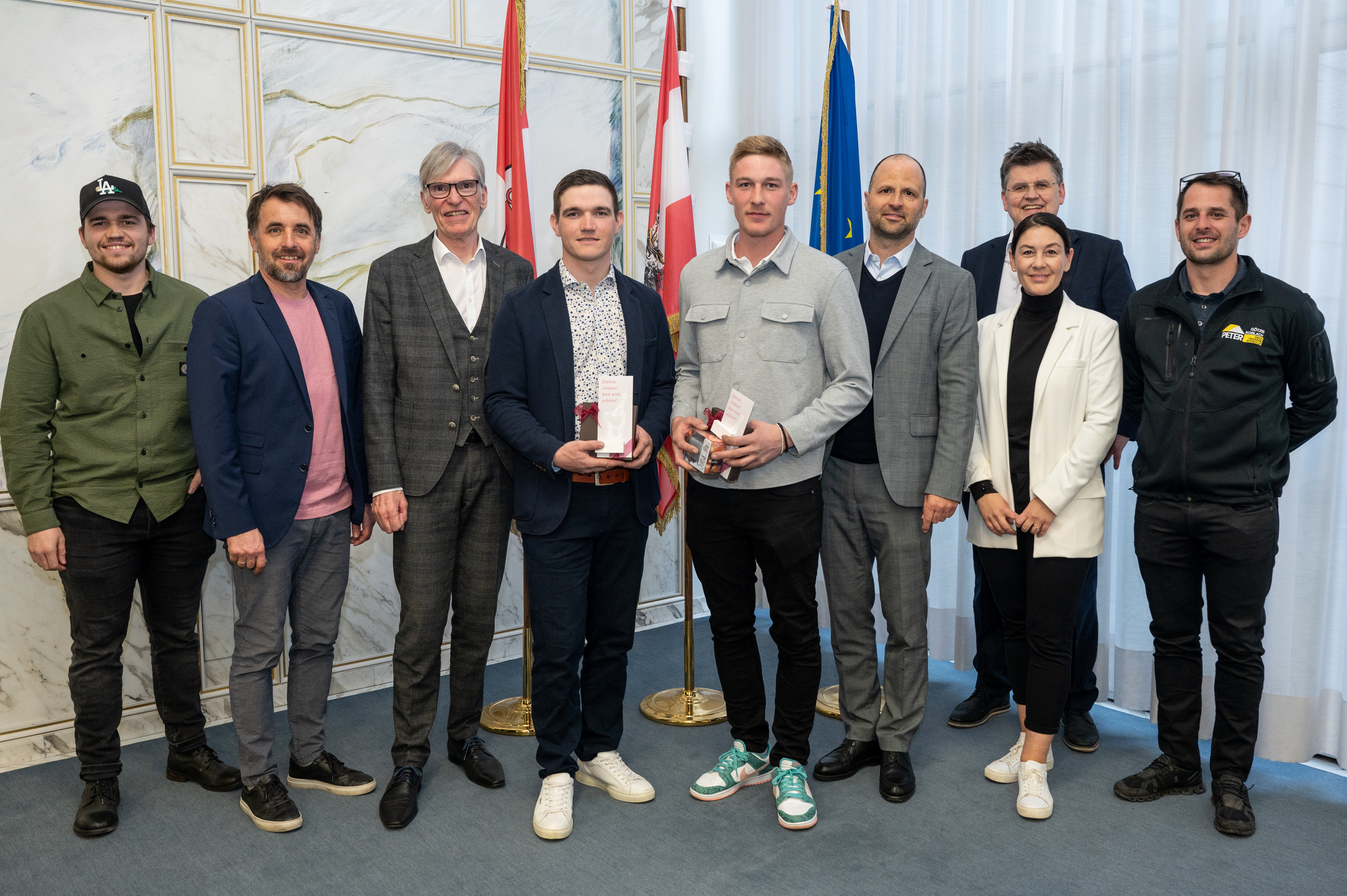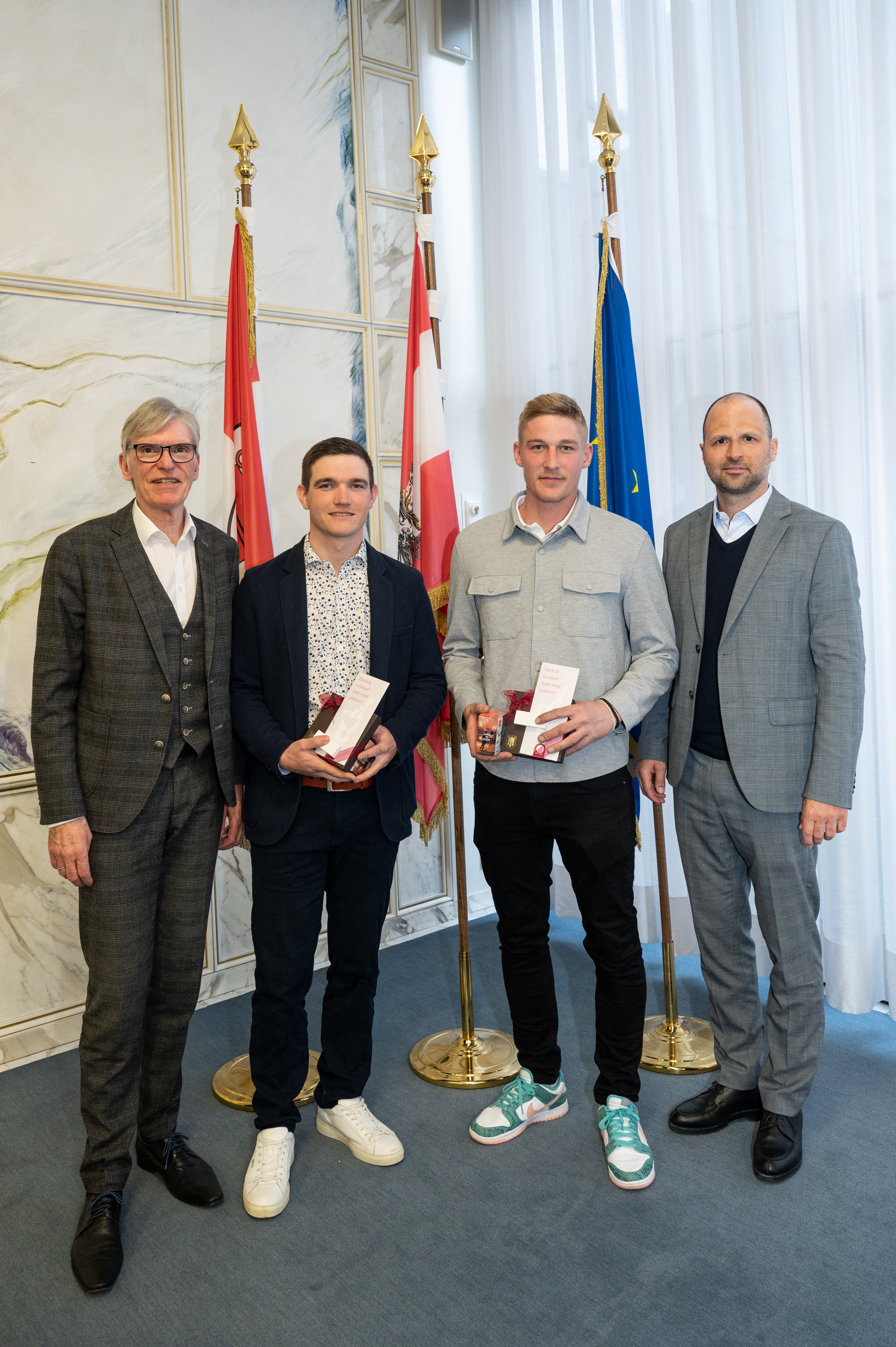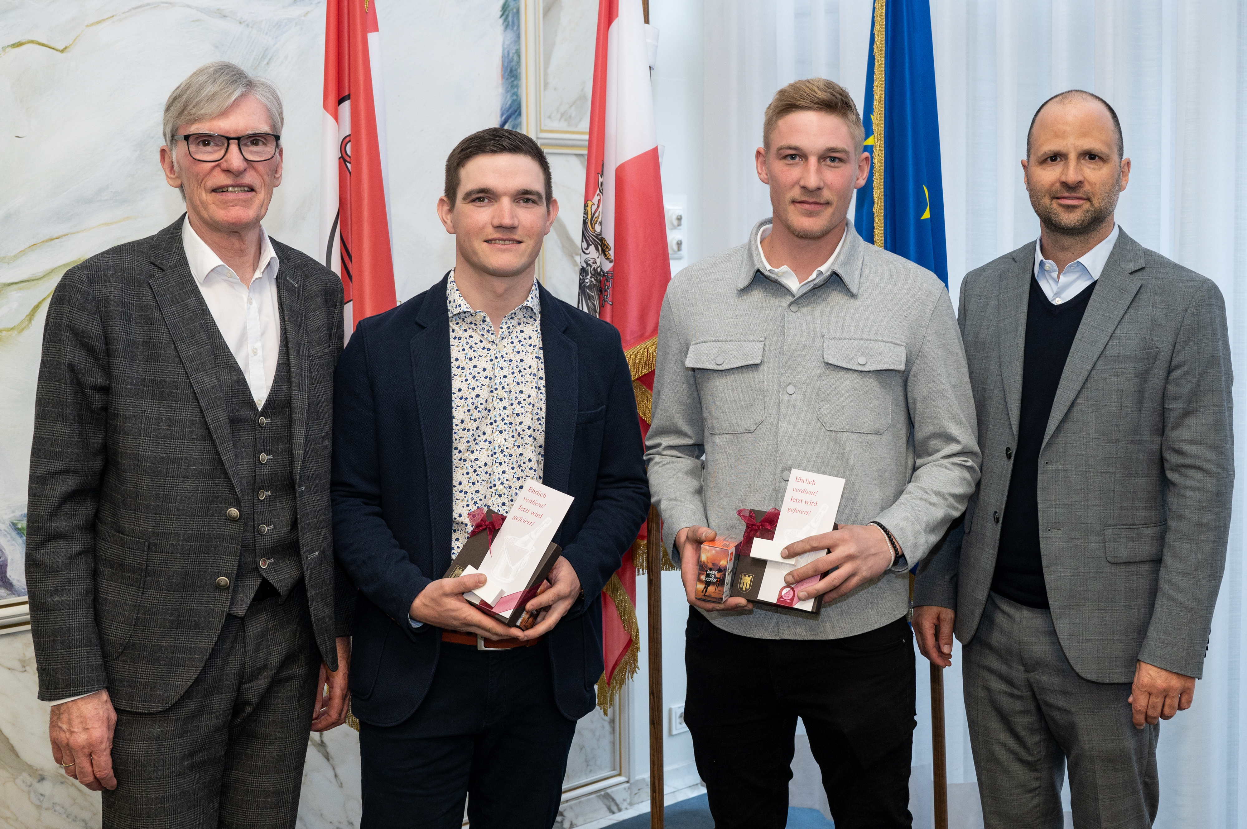 Bregenz (VLK) – „Ihr setzt im wahrsten Sinne des Wortes zum beruflichen Höhenflug an“ – mit diesen Worten gratulierte Landesrat Marco Tittler den beiden erfolgreichen Teilnehmern an den Weltmeisterschaften der Jungen Dachdecker bei einem Empfang im Landhaus in Bregenz. Patrick Jäger und Fabian Mächler haben in der Kategorie „Flachdach“ die Goldmedaille errungen.