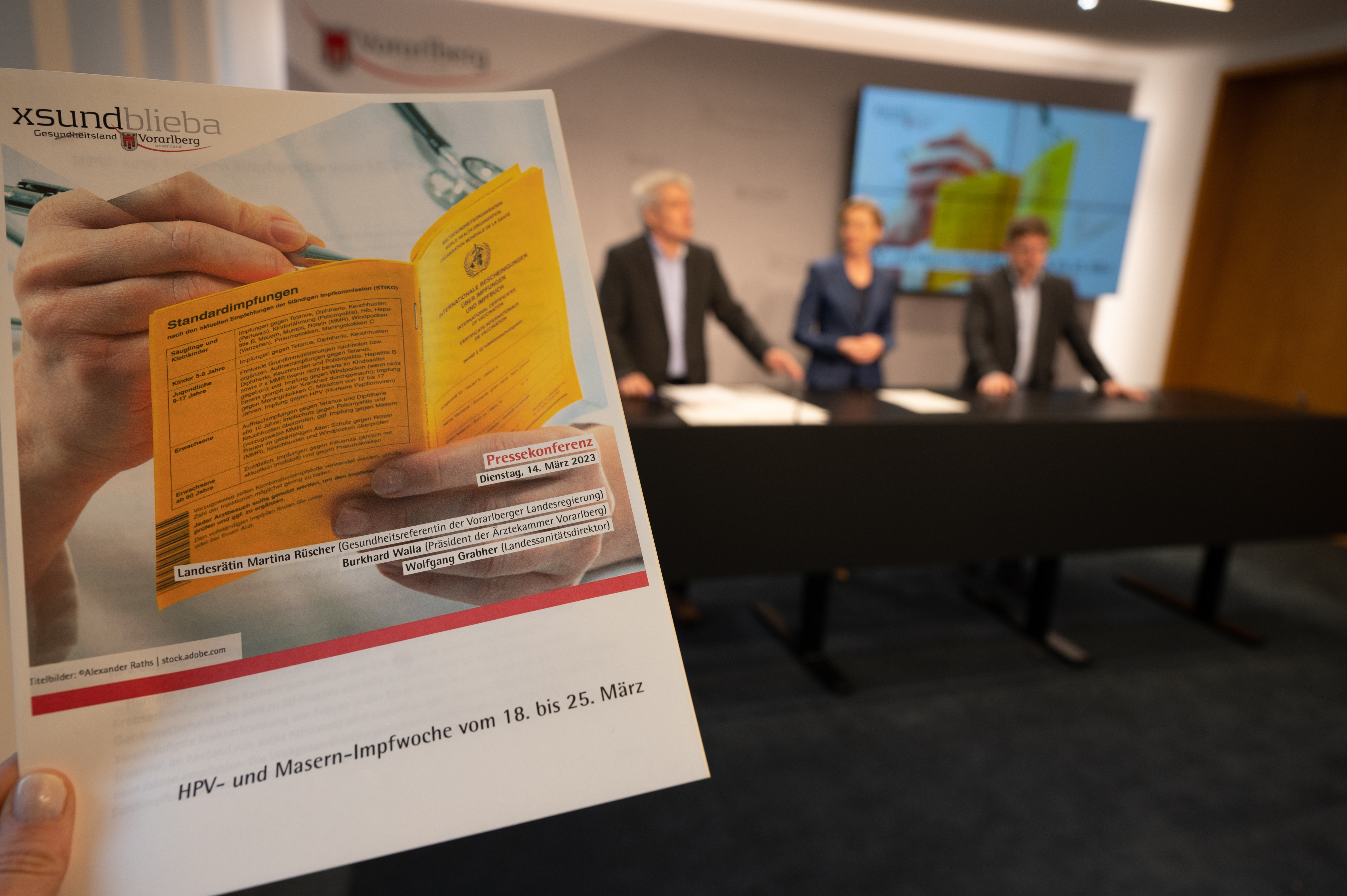 Bregenz (VLK) – Das Land Vorarlberg lädt zu einer Impfwoche gegen das Humane Papilloma Virus (HPV) und Masern/Mumps/Röteln ein. Von 18. bis 25. März werden in Dornbirn und Nüziders täglich Termine zur kostenlosen Impfung gegen diese Krankheiten angeboten. „Wir wollen die Durchimpfungsrate erhöhen, um Erkrankungen bei Kindern und Erwachsenen zu verhindern und dadurch auch Spitäler und Arztpraxen zu entlasten“, sagte Gesundheitslandesrätin Martina Rüscher heute (Dienstag) im Landhaus bei der Bewerbung der Aktion gemeinsam mit Ärztekammerpräsident Burkhard Walla und Landessanitätsdirektor Wolfgang Grabher.