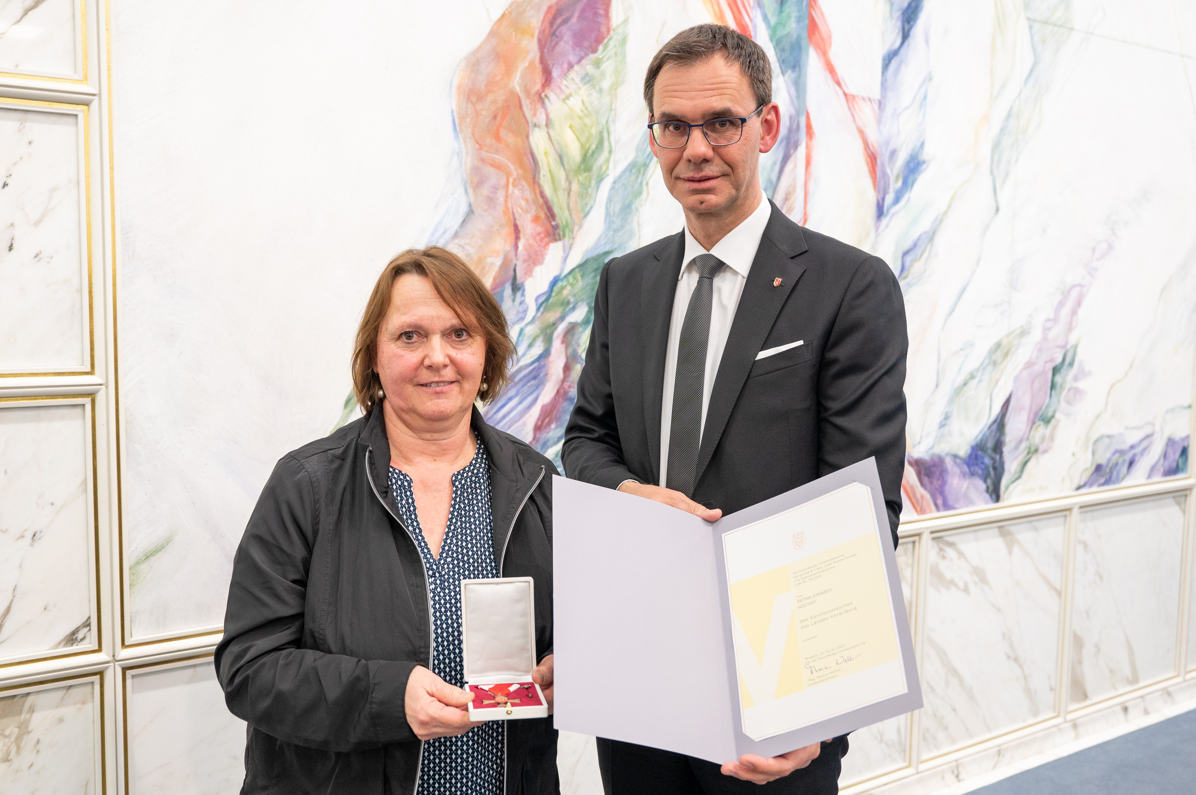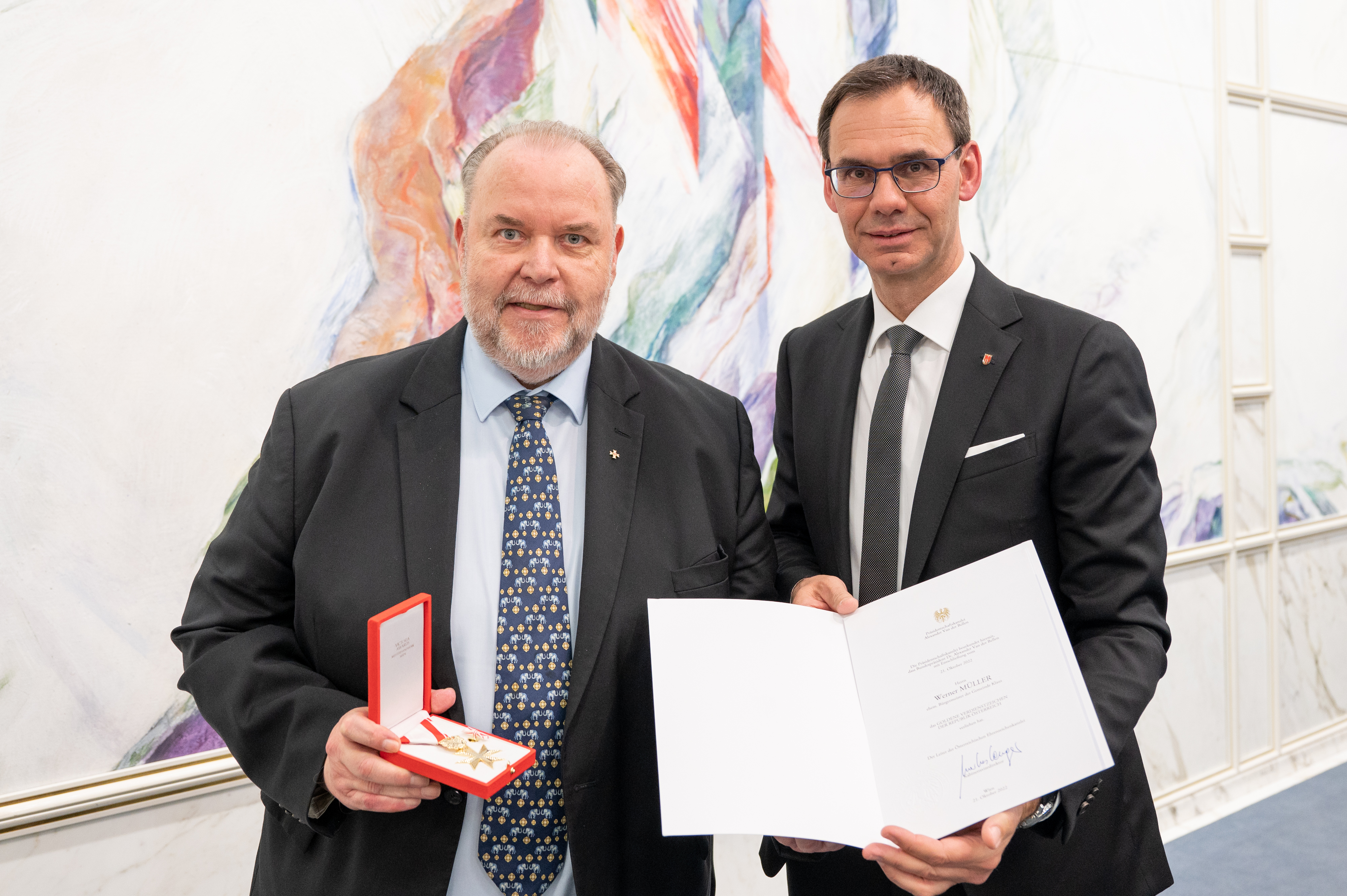 Goldenes Verdienstzeichen der Republik Österreich Werner Müller war von 2004 bis 2020 Bürgermeister der Gemeinde Klaus. Während seiner Amtszeit hat sich die Gemeinde zu einem dynamischen und wettbewerbsfähigen Produktions- und Wirtschaftsstandort entwickelt. Wichtig war Müller die Pflege der Gemeindepartnerschaft von Donnerskirchen und Klaus. In den vergangenen 43 Jahren fanden zahlreiche Besuche und Veranstaltungen im gegenseitigen Austausch statt. Das Land Burgenland hat seine Verdienste mit einer Landesauszeichnung gewürdigt. Letztes Jahr erhielt er das Große Verdienstzeichen des Landes Vorarlberg. Jetzt wurden die jahrzehntelangen Verdienste um die Partnerschaft der beiden Gemeinden mit dem Goldenen Verdienstzeichen der Republik Österreich gekrönt.