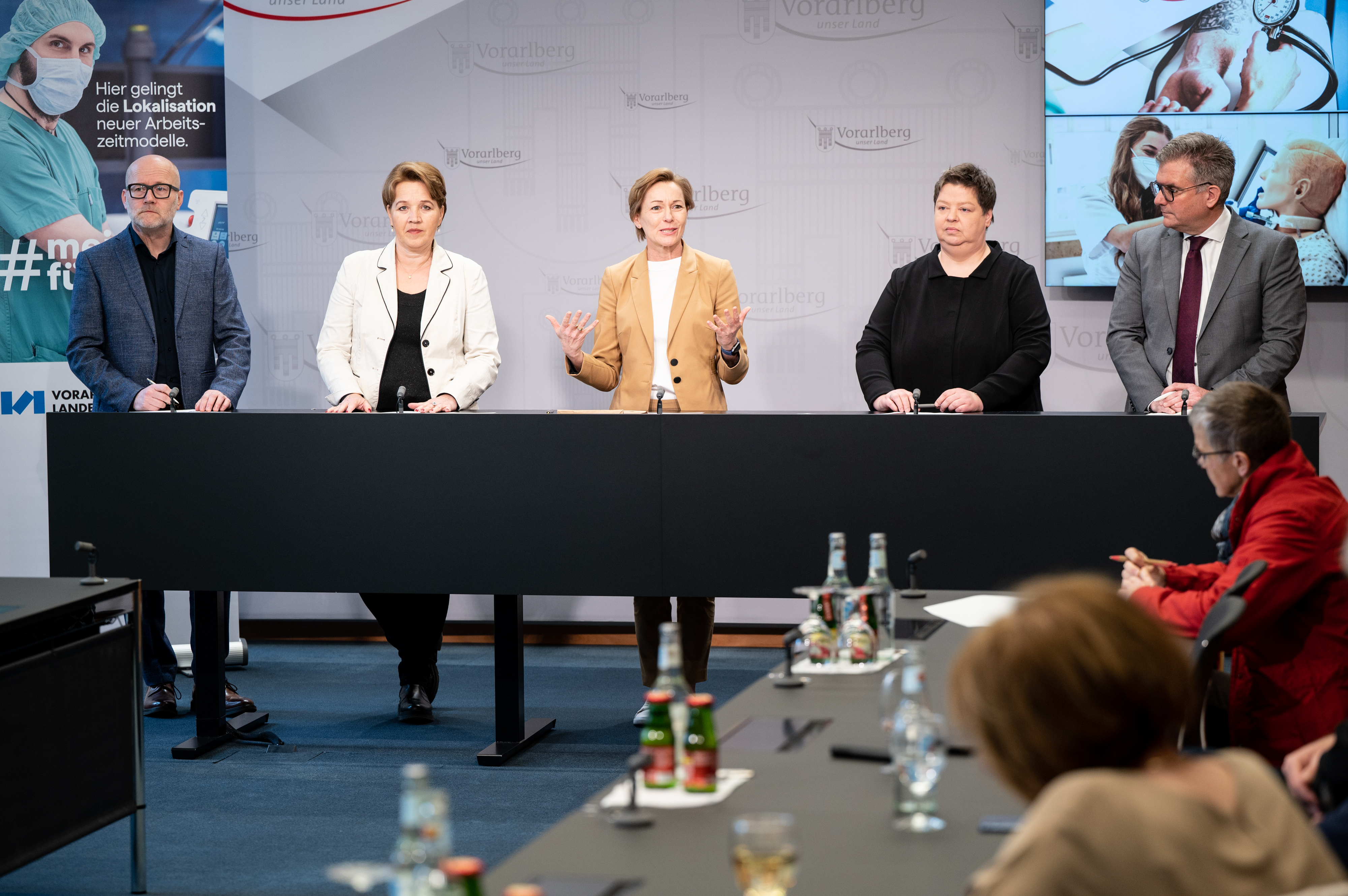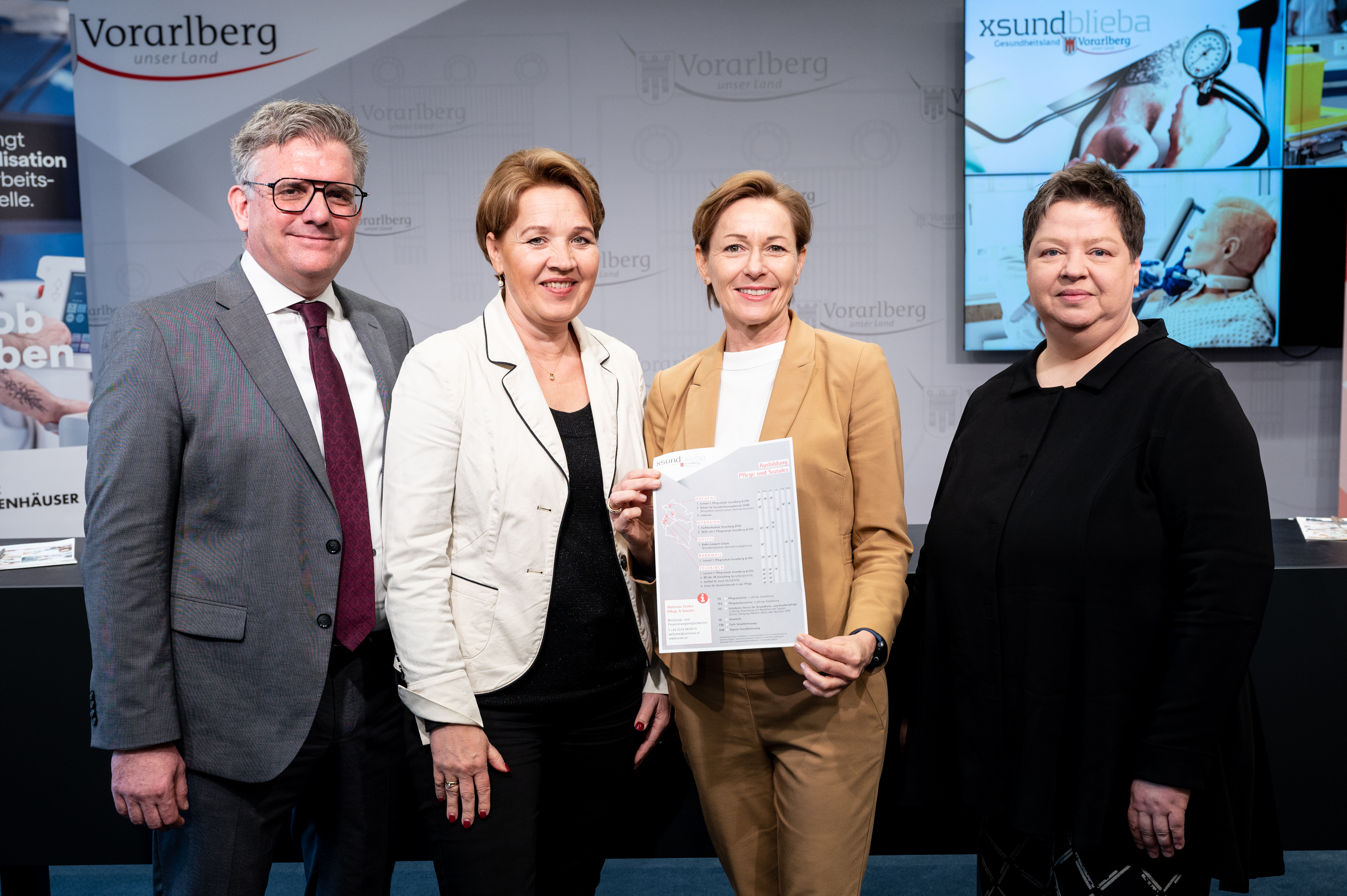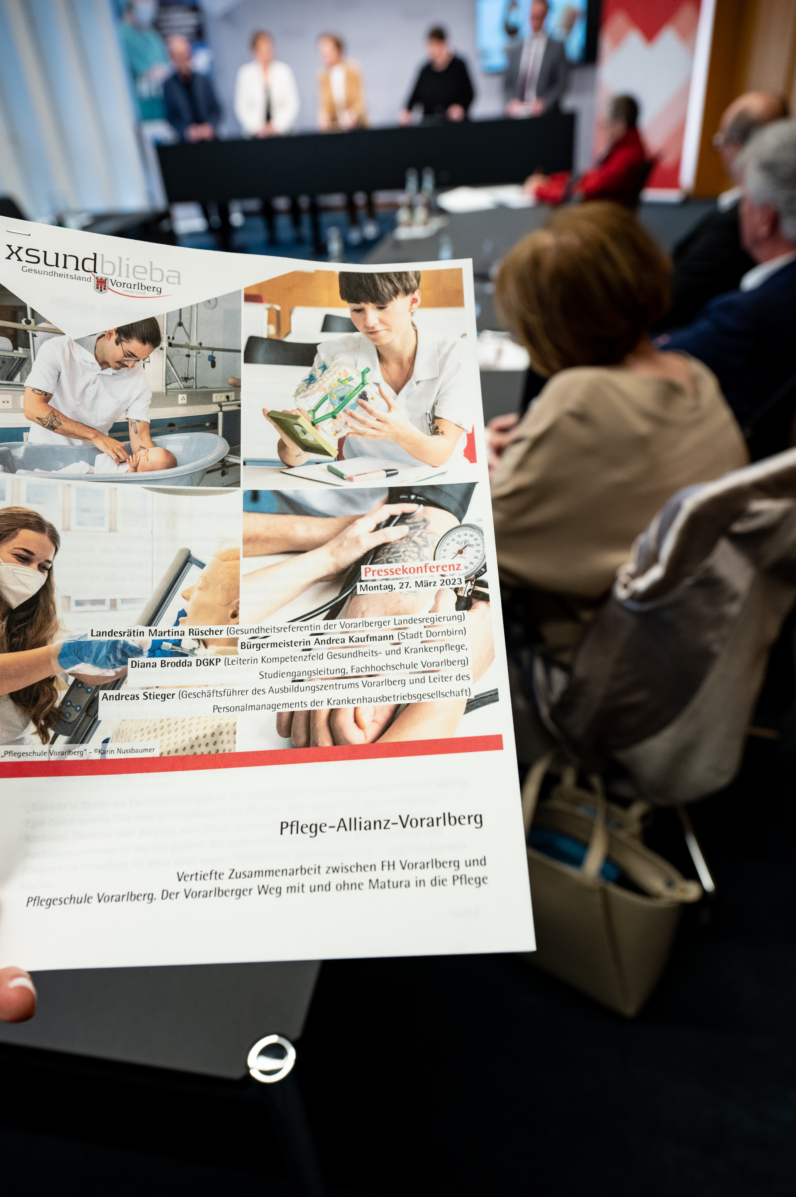 Bregenz (VLK) – Mit der Zusammenführung der drei Gesundheits- und Krankenpflegeschulen im Lande zur Pflegeschule Vorarlberg und der neuen Kompetenzfeldleitung Gesundheits- und Krankenpflege an der Fachhochschule Vorarlberg (FHV) wurden wesentliche strukturelle Schritte gesetzt, um eine qualitativ hochwertige Pflegeausbildung auf allen Ebenen anbieten zu können. „Es geht darum, Ressourcen und Knowhow zu bündeln, um die in Vorarlberg dringend benötigten Pflegefachkräfte auf hohem Niveau auszubilden. Die Pflege Allianz Vorarlberg bezeichnet künftig den Weg in die Pflege mit und ohne Matura“, informierten Gesundheitslandesrätin Martina Rüscher und die Dornbirner Bürgermeisterin Andrea Kaufmann im heutigen (Montag) Pressegespräch.