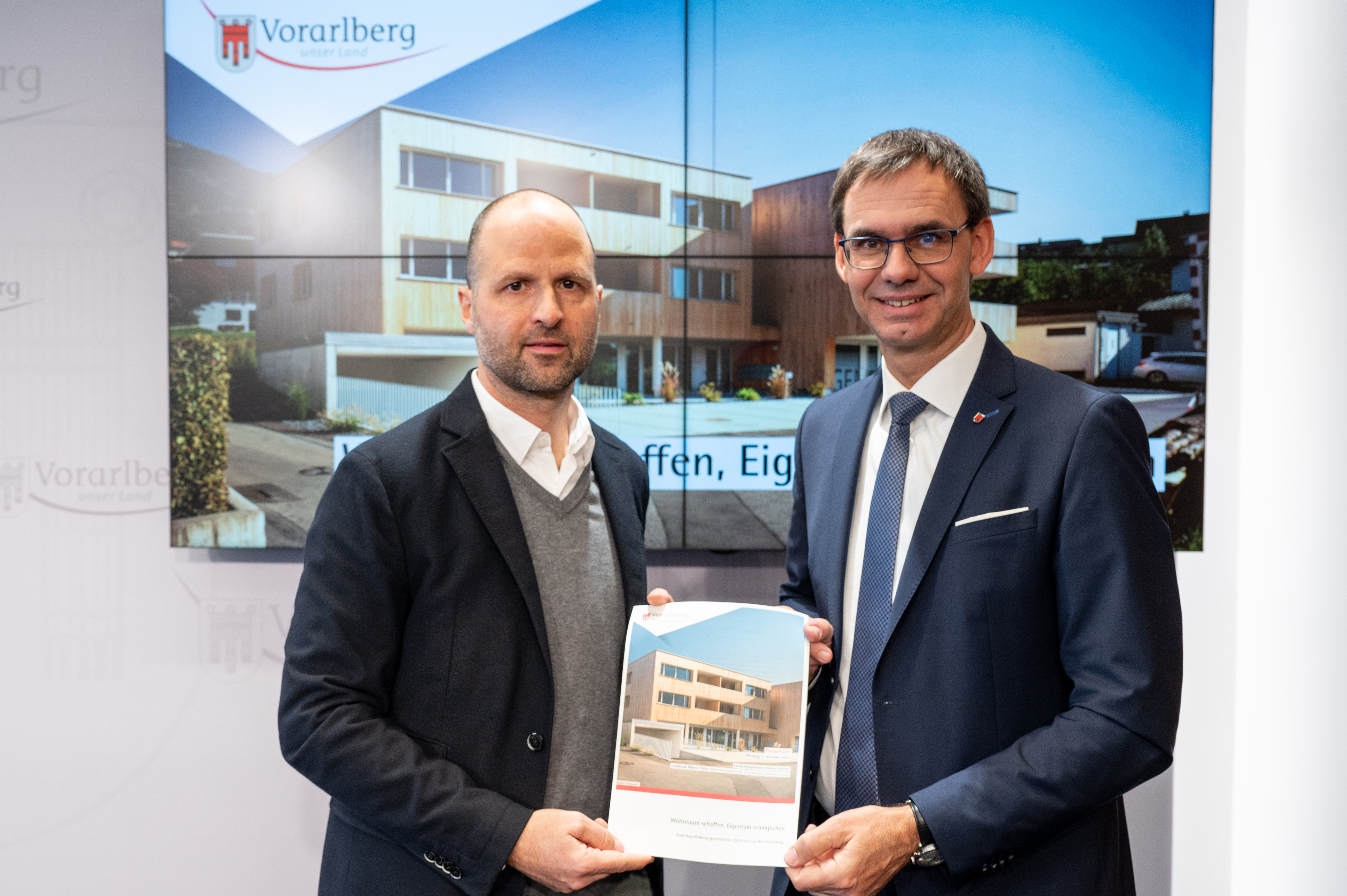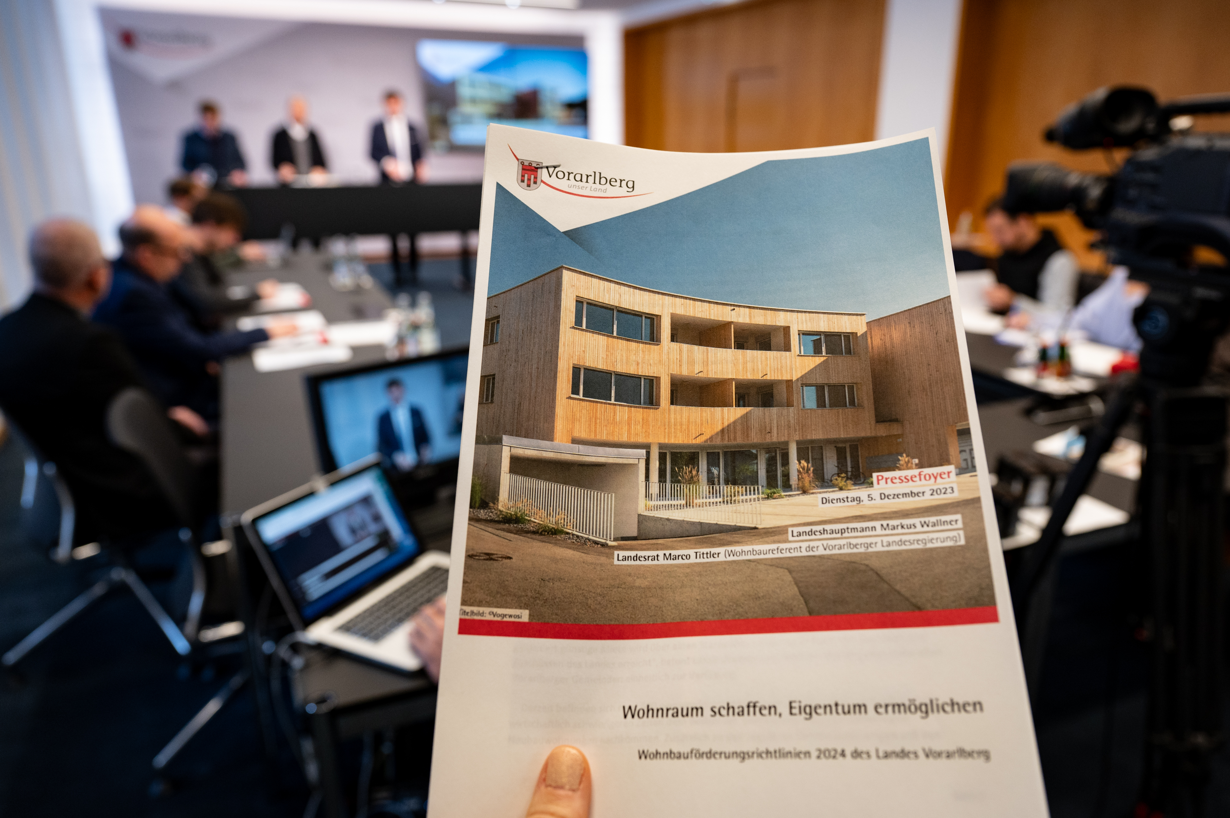 Bregenz (VLK) – Stark gestiegene Grundstückspreise, hohe Errichtungskosten sowie Inflation und die aktuelle Zinssituation sind große Herausforderungen fürs Bauen und Wohnen. Um dem zu begegnen, hat die Vorarlberger Landesregierung ein umfassendes Wohnpaket auf Schiene gebracht. Dazu gehören auch spürbare Verbesserungen in der Wohnbauförderung und der Wohnbeihilfe. Im Landesbudget 2024 sind dafür insgesamt 161 Millionen Euro veranschlagt, um ca. 6,5 Millionen mehr als heuer. „Mit den Verbesserungen haben wir die attraktivste Wohnbauförderung Österreichs“, sagte Landeshauptmann Markus Wallner im heutigen (Dienstag, 5. Dezember) Pressefoyer bei der Vorstellung der neuen Förderrichtlinien gemeinsam mit Wohnbaulandesrat Marco Tittler. Die Landesregierung hat zudem grünes Licht für die Gründung eines Bodenfonds gegeben, über den Wohnbauprojekte in den Gemeinden unterstützt werden sollen.