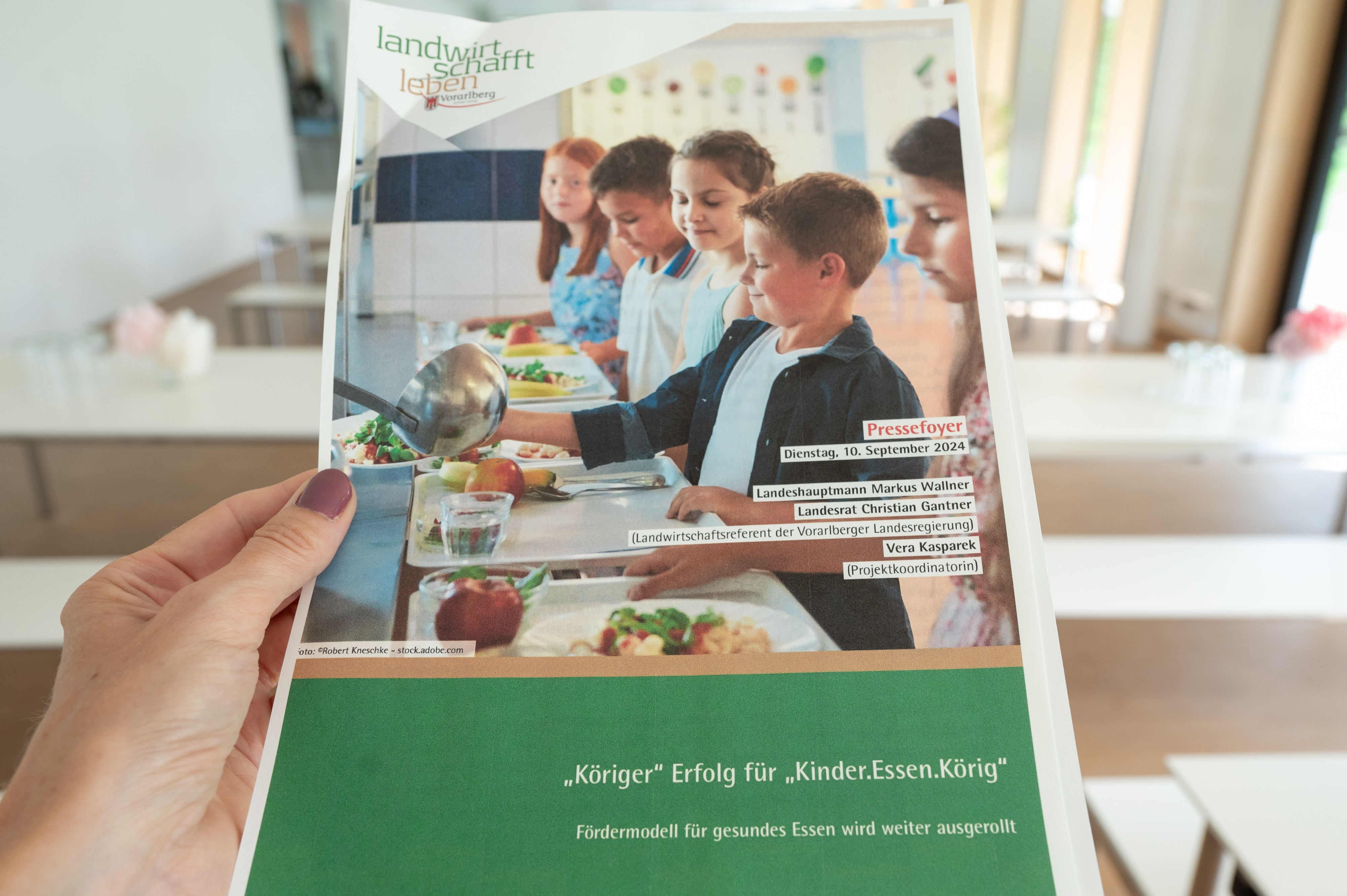 Hard (VLK) – 110 teilnehmende Volksschulen in 61 Vorarlberger Gemeinden, insgesamt ca. 440.000 Mittagessen mit hohem Anteil regionaler, biologischer Lebensmittel – das ist die positive Bilanz nach dem ersten Jahr des Landesprojektes „Kinder.Essen.Körig“ zur Förderung von hochwertigem, gesundem und zugleich leistbarem Mittagessen in Vorarlberger Bildungseinrichtungen. „Ein ‚köriger‘ Erfolg für ein ‚köriges‘ Projekt“, hielten Landeshauptmann Markus Wallner und Landwirtschaftslandesrat Christian Gantner gemeinsam mit Projektleiterin Vera Kasparek im heutigen (Dienstag, 10. September) Pressefoyer fest. „Kinder.Essen.Körig“ startete im vergangenen Schuljahr in den öffentlichen Volksschulen und wird nun auch auf Mittelschulen und Gymnasien ausgerollt. Einreichungen der Vorarlberger Gemeinden für die aktuelle Förderperiode sind ab sofort bis 18. Oktober 2024 möglich.