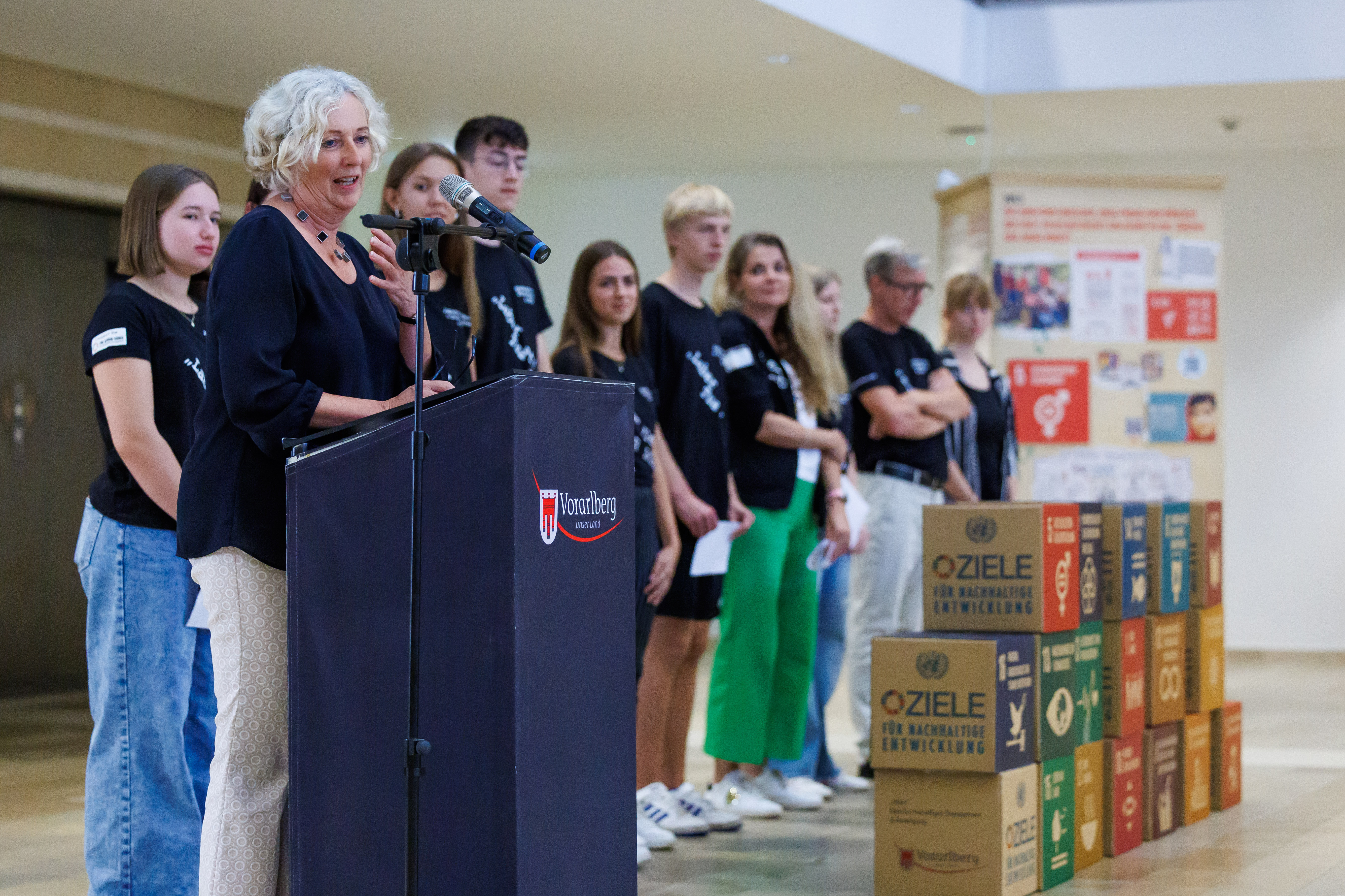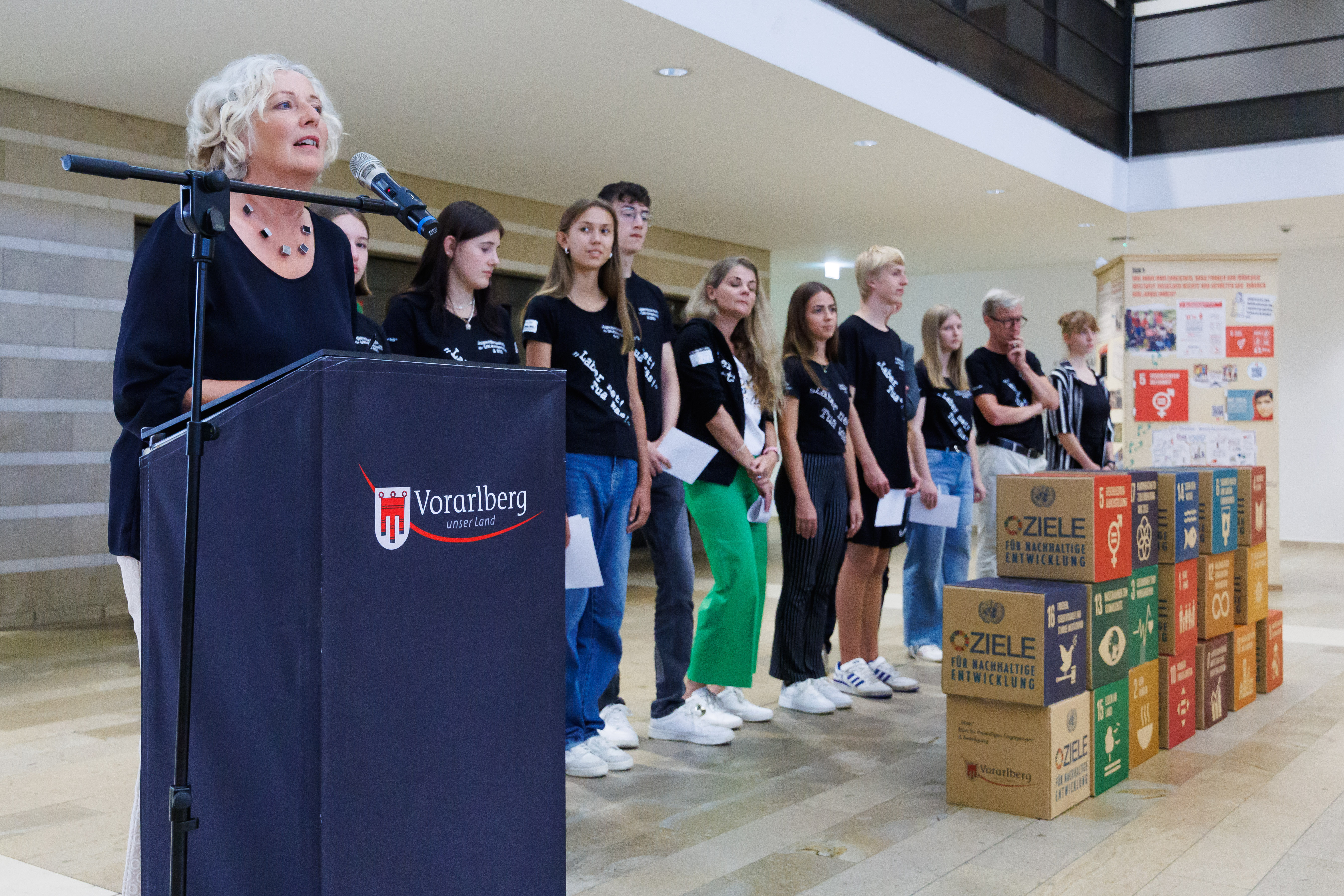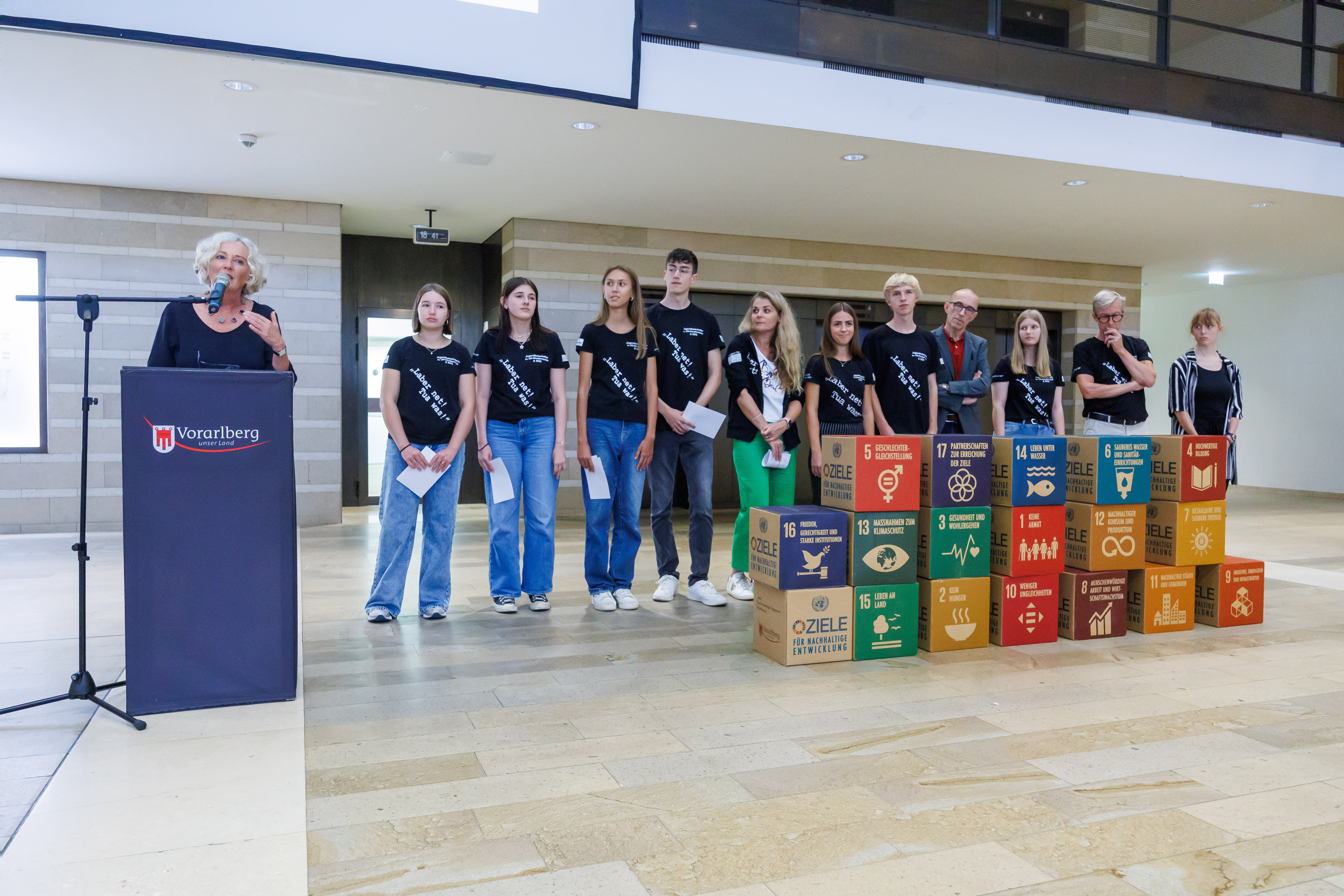 Bregenz (VLK) – Die für Entwicklungszusammenarbeit zuständige Landesrätin Katharina Wiesflecker eröffnete heute (Montag, 18. September 2023) im Landhaus die Ausstellung „The Largest Lesson of the World“, die die globalen Nachhaltigkeitsziele der Vereinten Nationen präsentiert. Anhand der 17 „SDG-Quader“ werden die BesucherInnen anschaulich über die vielfältigen Zusammenhänge und über die unterschiedlichen Möglichkeiten, selbst aktiv zu werden, informiert. „Damit soll das Bewusstsein in der Zivilgesellschaft geschärft werden, wie der Planet Erde auch für die kommenden Generationen lebenswert bleiben kann“, so die Landesrätin bei der Eröffnung. Die Ausstellung ist im Foyer des Landhauses bis zum 29. September zu sehen, der Eintritt ist frei.