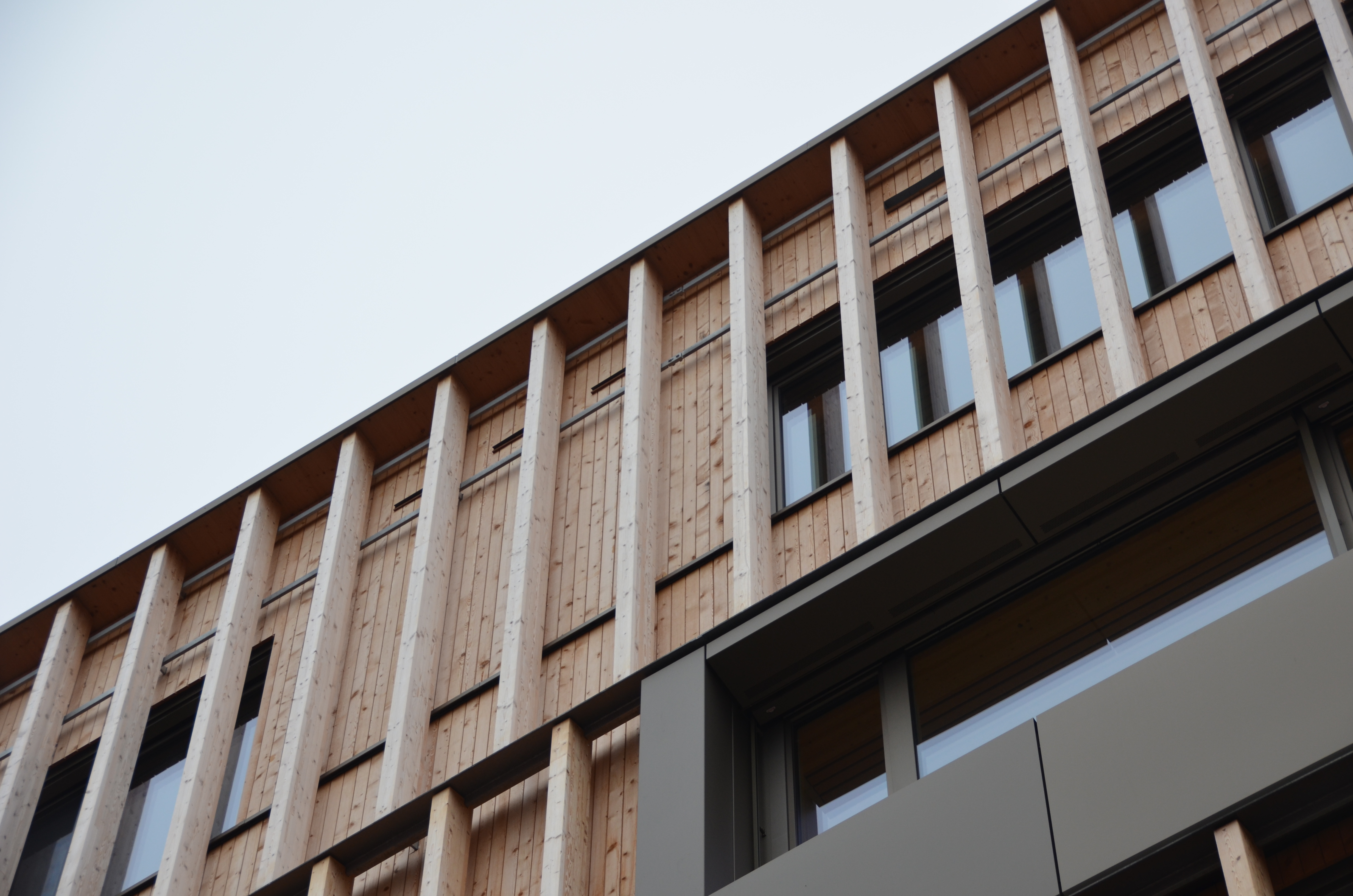 Erster Halt war das neue Rathaus-Quartier in Hohenems. Das Rathaus selbst erfüllt bereits zahlreiche Kriterien des zirkulären Bauens. Der sechsgeschossige Holzbau wurde aus regionalem Fichtenholz errichtet und besteht überwiegend aus wiederverwendbaren Bauteilen. Im Außenraum wurden die Nachhaltigkeitskriterien des KGA-Standards konsequent umgesetzt: heimische und europäische Gehölzarten, eine PV-Gründach-Kombination mit zertifiziertem Saatgut sowie integrierte Fledermauskästen. Auch der Erhalt des Altbaumbestands und historischer Mauern im Quartierpark unterstreicht den ganzheitlichen Ansatz. „Wir freuen uns über die bisherigen Umsetzungen und wollen die Potenziale für eine noch nachhaltigere Quartiersentwicklung weiter nutzen“, so Michael Pillei von der Stadtplanung Hohenems.