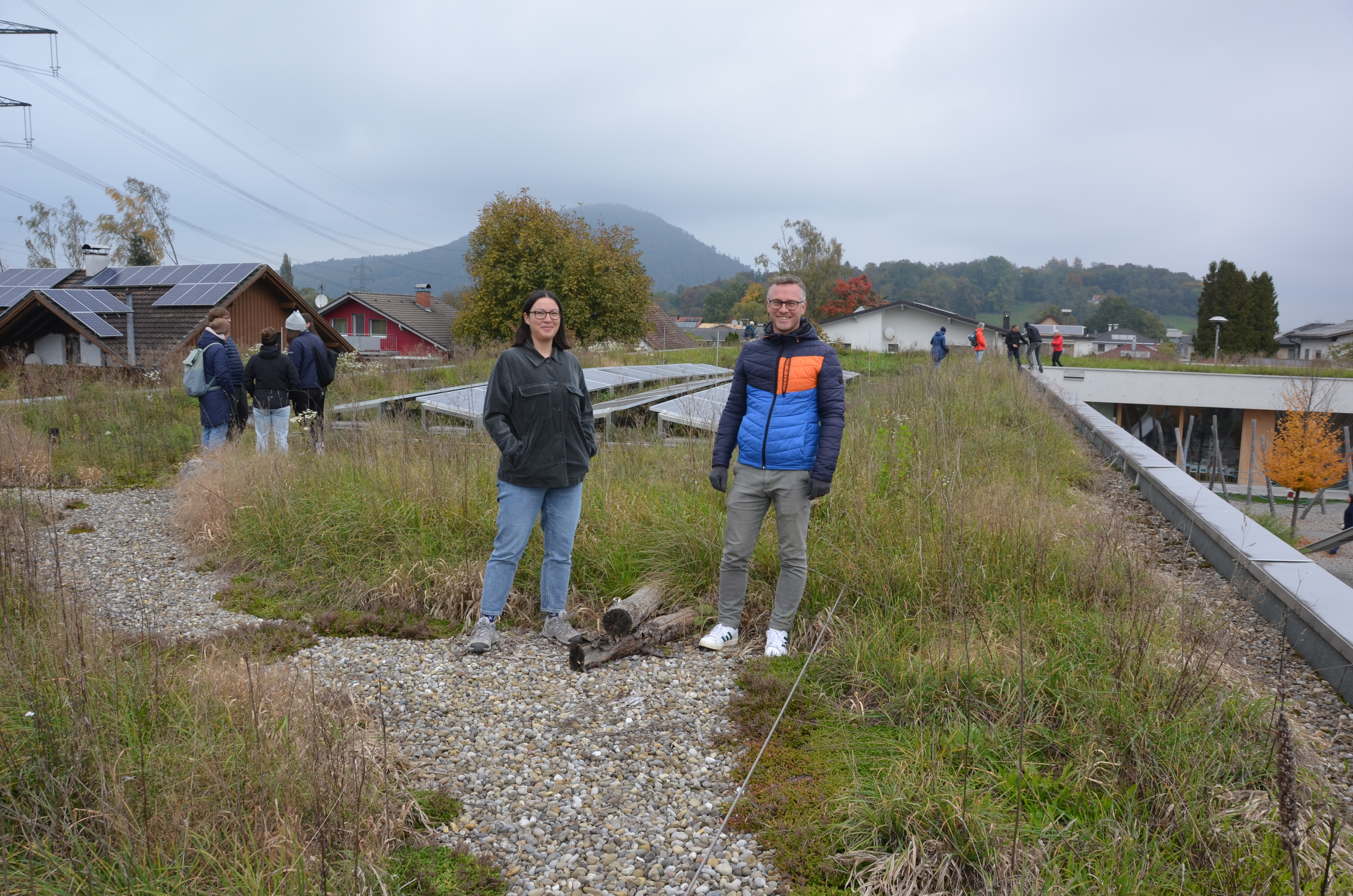 In Koblach führte Hannes Oberhauser die Teilnehmenden auf das ressourcenoptimierte Gründach des Kindergartens Ried. Die Gemeinde verzichtete auf großflächige Kunststoffschichten, nutzte lokal anfallenden Oberboden und setzte Saatgut vom nahegelegenen Rheindamm ein. Ein dreijähriges ökologisches Monitoring im Auftrag des Landes bestätigte bereits eine außergewöhnliche Artenvielfalt auf dem besagten Gründach. Beim anschließenden Besuch des Bio-Betriebes Wegwarte erhielten die Teilnehmenden zudem Einblicke in das Kompostierverfahren.