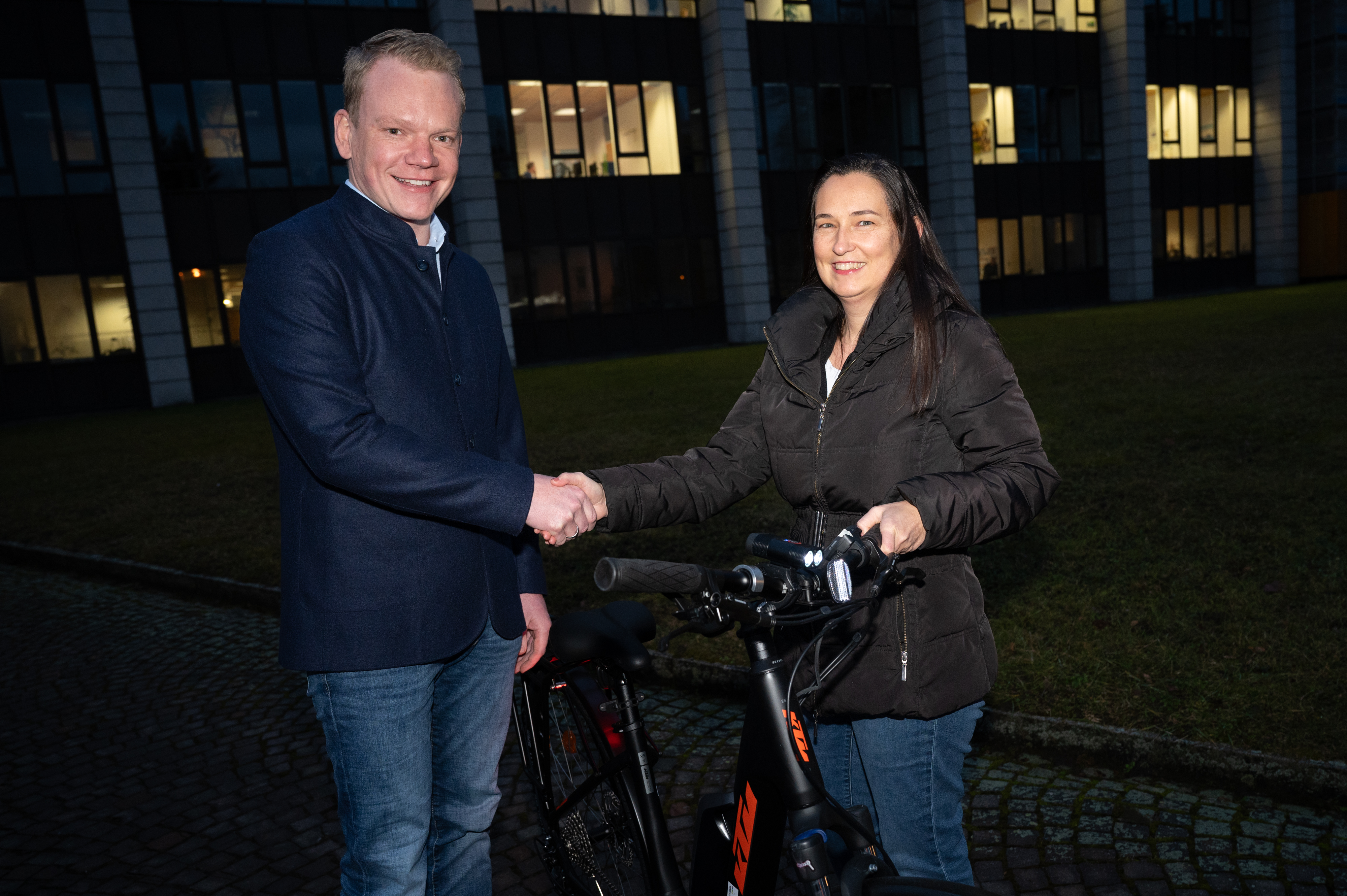 LSth. Christof Bitschi überreicht den Hauptgewinn des Österreich radelt Adventkalenders - ein KTM E-Bike - an Caroline Mathis aus Götzis.