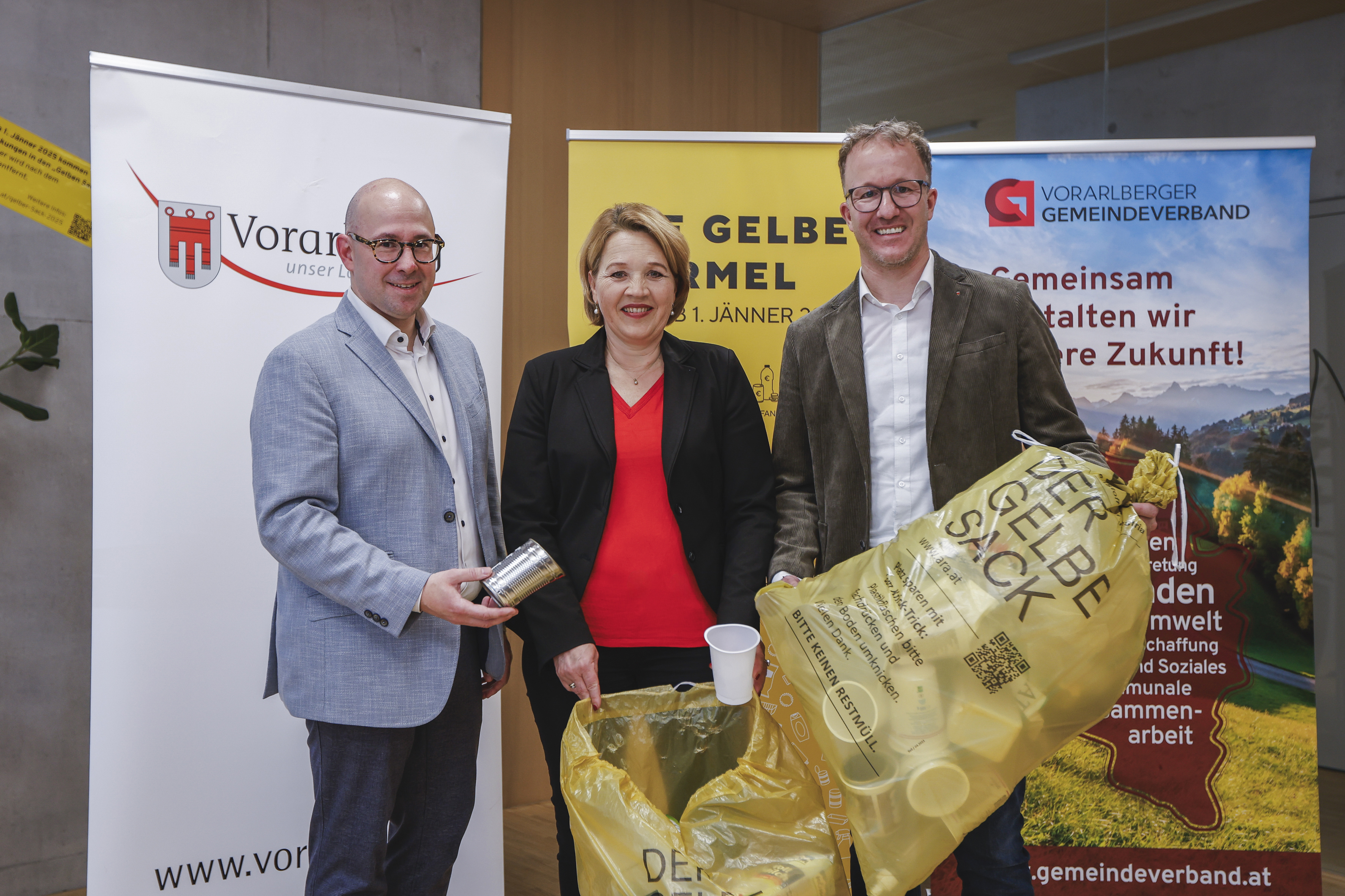 Bregenz (VLK) – Ab dem 1. Jänner 2025 wird das Sammelsystem für Verpackungen in Vorarlberg entscheidend vereinfacht. Ab diesem Datum werden Kunststoff- und Metallverpackungen gemeinsam im Gelben Sack gesammelt. Gleichzeitig wird das Einwegpfand (25 Cent) auf Getränkeflaschen und -dosen eingeführt. „Die Umstellung ist eine Win-Win-Win-Situation für alle“, freut sich Landesrat Christian Gantner: „Die Allgemeinheit spart sich Kosten, jede und jeder Einzelne spart Zeit und gemeinsam schützen wir unsere Umwelt.“