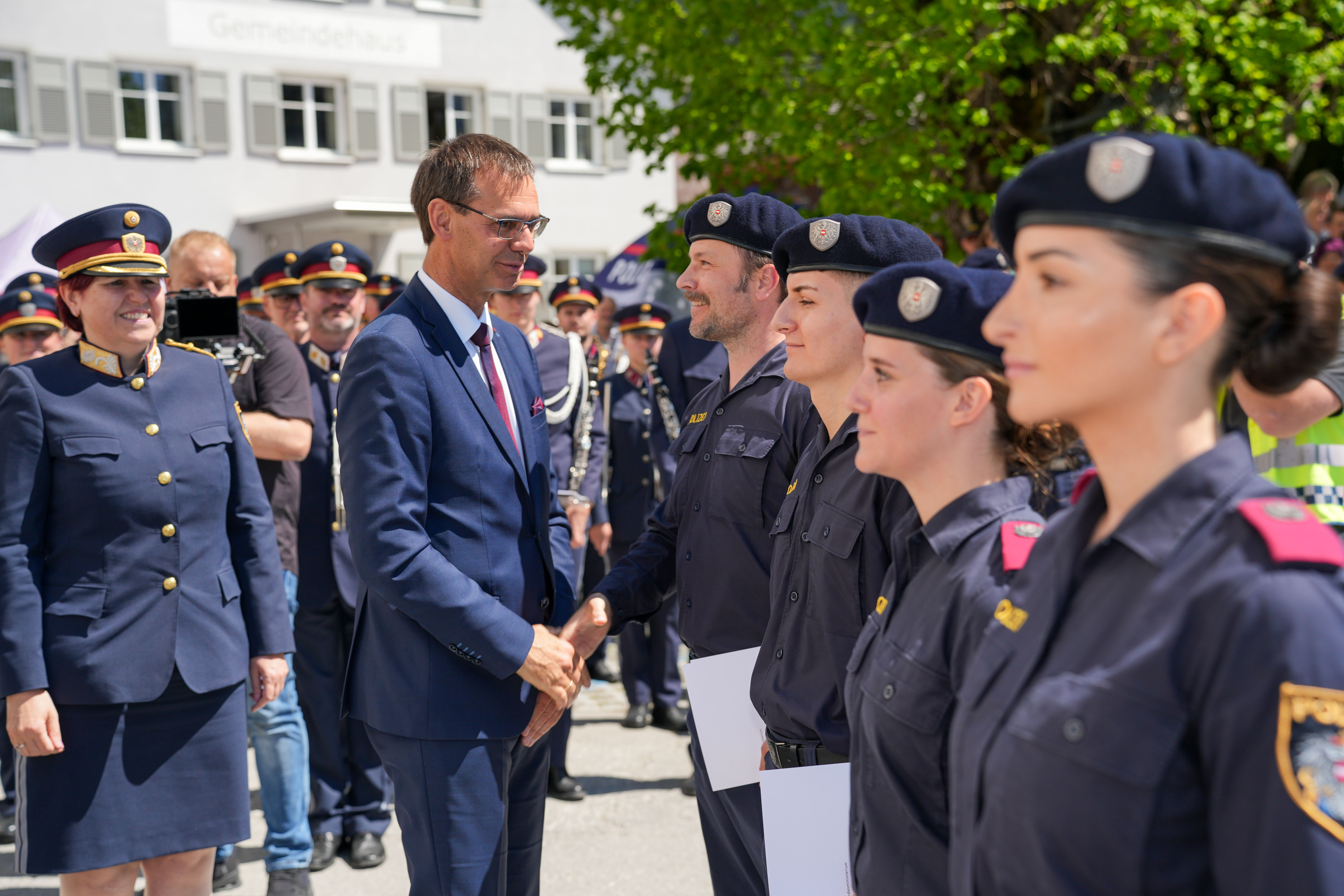 Alberschwende (VLK) – „Dank der engagierten Arbeit unserer Polizistinnen und Polizisten leben wir in einer der weltweit sichersten Regionen. Ihre Berufswahl ist nicht nur richtig für Ihre persönliche Zukunft, sondern auch entscheidend für die Sicherheit unseres Landes“, betonte Landeshauptmann Markus Wallner heute (30. April) bei der feierlichen Abschluss- und Angelobungsfeier der Landespolizeidirektion Vorarlberg in Alberschwende. Rund 40 PolizeischülerInnen und 20 AbsolventInnen wurden in festlichem Rahmen auf dem Dorfplatz geehrt. Landeshauptmann Wallner, Innenminister Gerhard Karner, Sicherheitslandesrat Daniel Allgäuer und Landespolizeidirektorin Uta Bachmann gratulierten den angehenden Polizistinnen und Polizisten und betonten die Bedeutung der Polizeiarbeit für die Sicherheit und das Wohlbefinden der Vorarlberger Bevölkerung.
