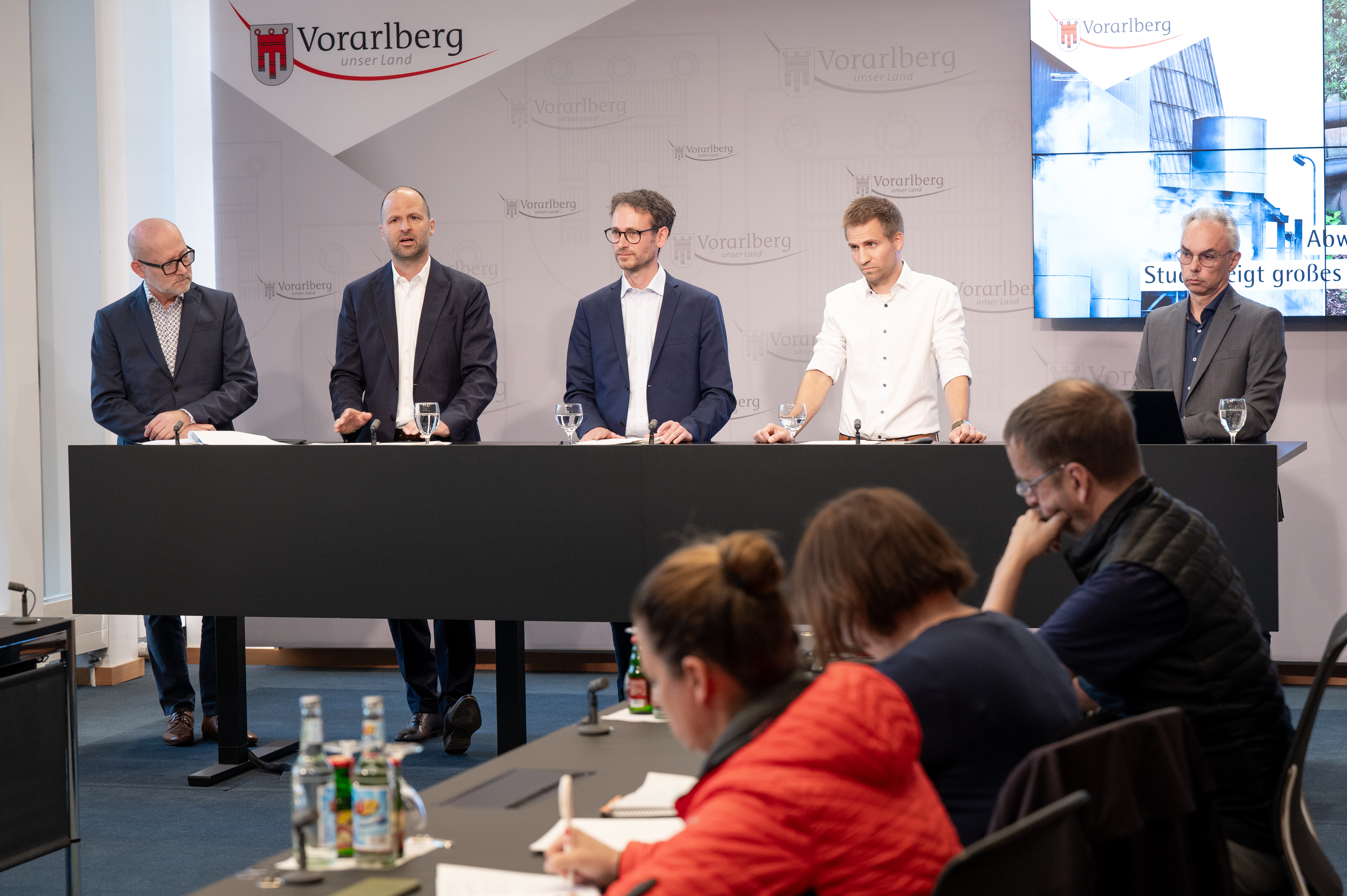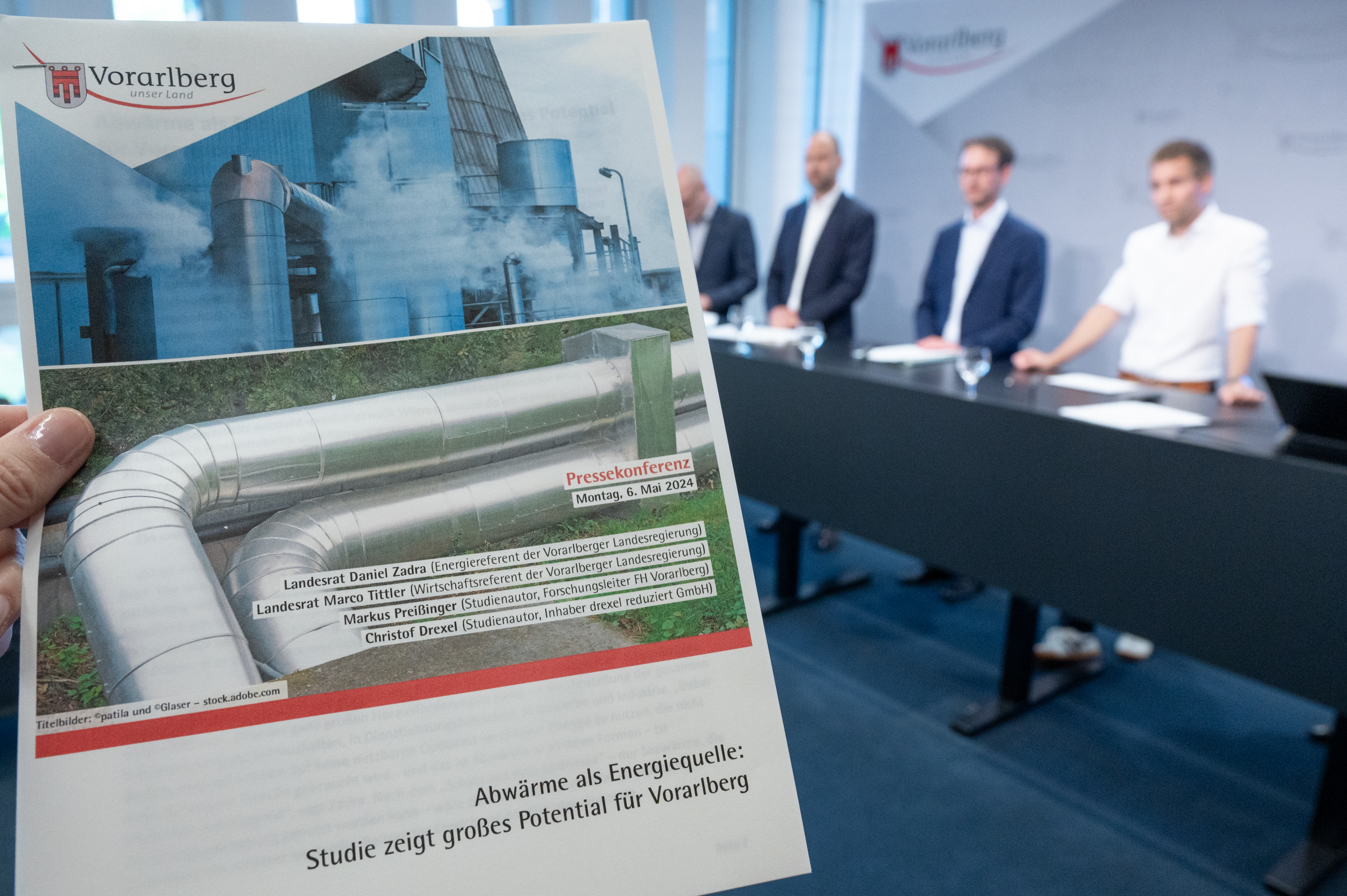 Bregenz (VLK) – Industrielle Abwärme - also die überschüssige Energie, die in Produktionsprozessen erzeugt wird - wird in Vorarlberg bis dato kaum als Energiequelle genutzt. Laut einer vom Land in Auftrag gegebener Studie besteht hier großes Potential. Energielandesrat Daniel Zadra und Wirtschaftslandesrat Marco Tittler stellten heute (Montag) die Egebnisse gemeinsam mit den Studienautoren Markus Preißinger und Christoph Drexel vor: Industrielle Abwärme ließe sich demnach in einer Dimension von 400 GWh pro Jahr wirtschaftlich nutzen, Abwärme aus Kläranlagen zumindest im Umfang von 200 GWh. Das ist in Summe rund doppelt so viel wie die gesamte Fernwärmemenge, die derzeit in den Vorarlberger Heizwerken produziert wird. 50.000 Haushalte könnten damit mit beheizt werden – das entspricht dem Bezirk Feldkirch mit seinen 24 Gemeinden.