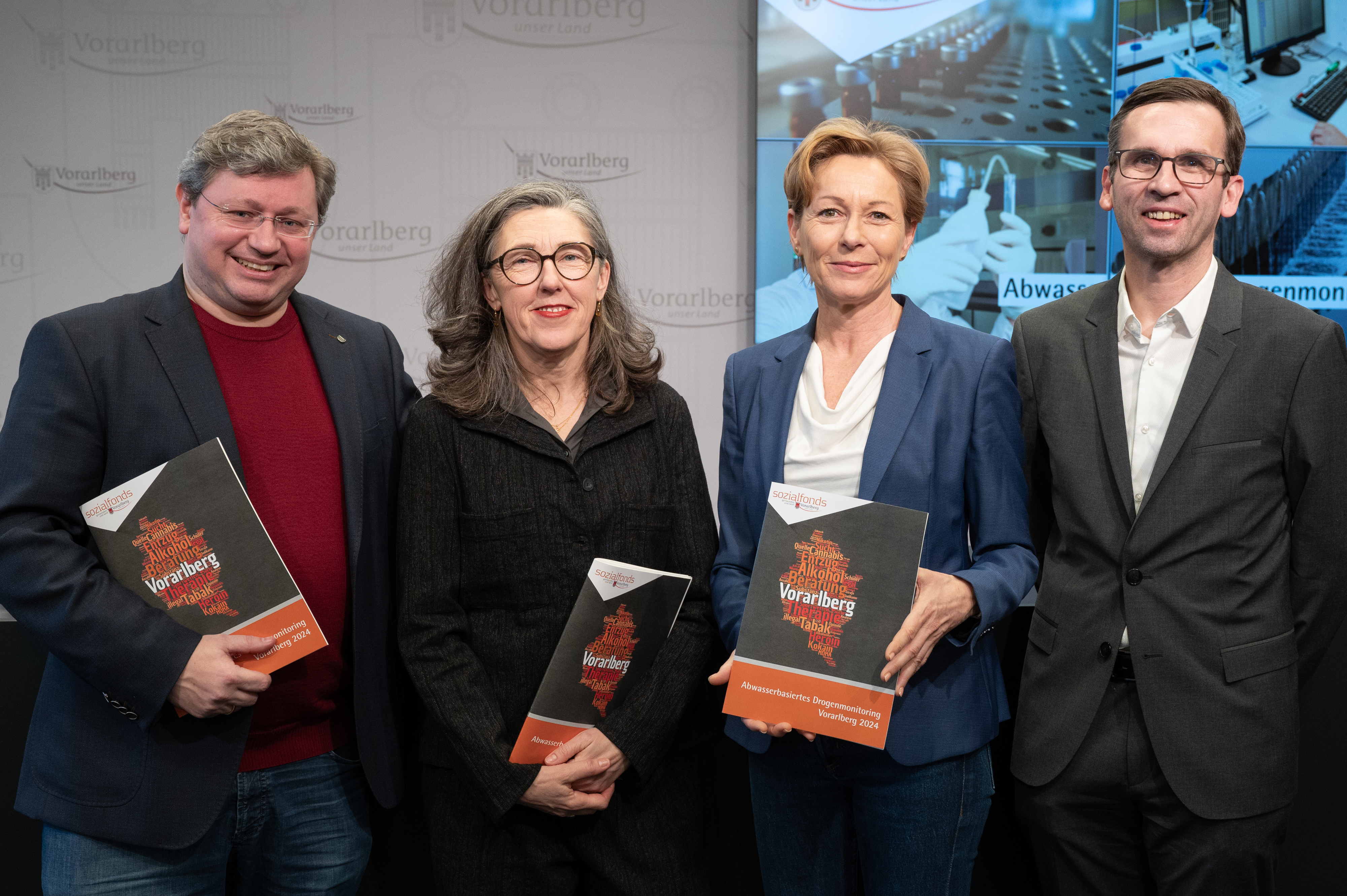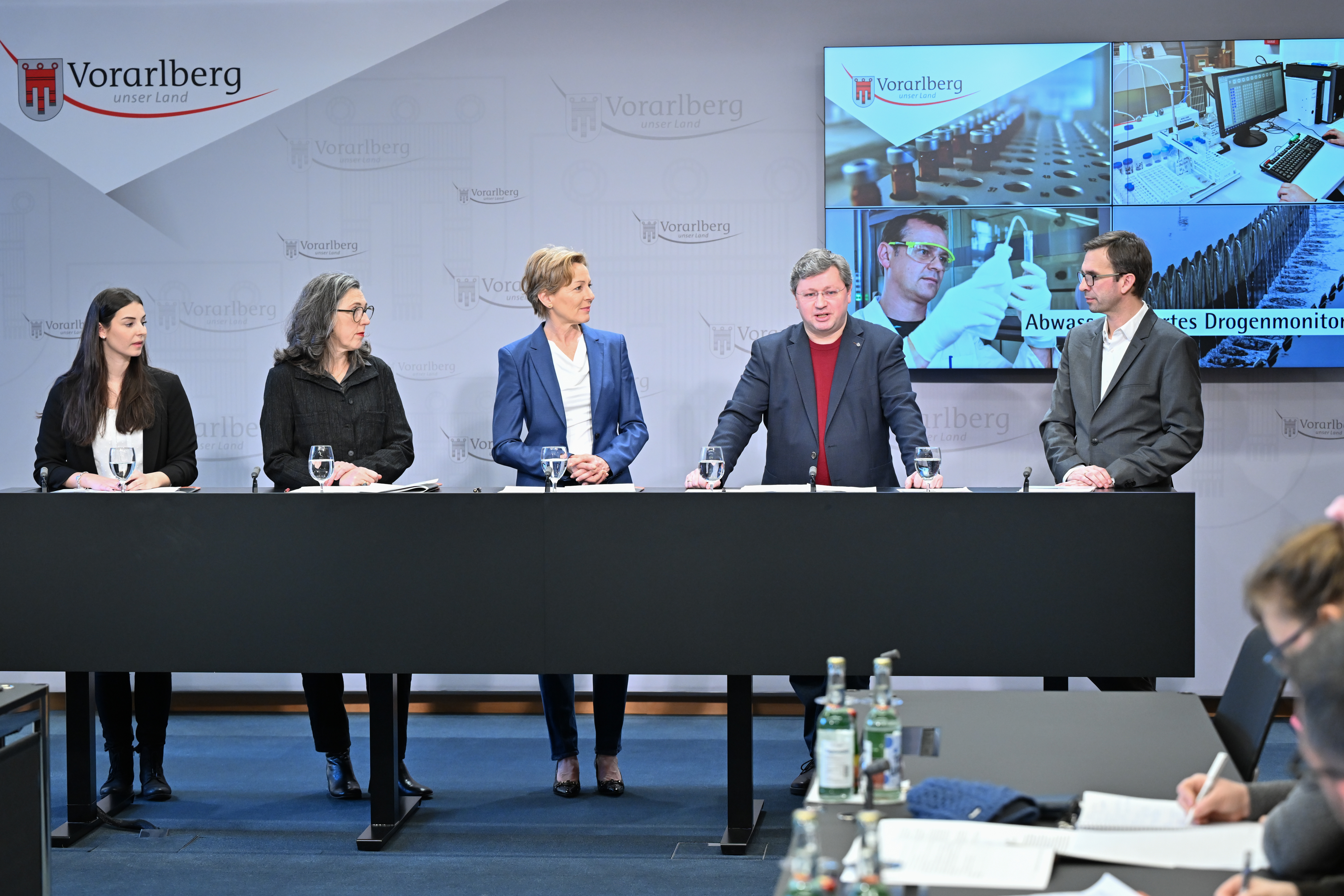 Das abwasserbasierte Drogenmonitoring hat sich als eine innovative Methode etabliert, um den Konsum legaler und illegaler Suchtmittel in der Bevölkerung zu analysieren. Bereits 2020 wurde ein ähnliches abwasserbasiertes Drogenmonitoring in Vorarlberg durchgeführt, sodass nun ein Vergleich der Konsumtrends zwischen damals und heute möglich ist. „Die valide Messung des Drogenkonsums ist essenziell, um fundierte Maßnahmen zur Konsumdynamik in der Bevölkerung zu entwickeln und umzusetzen“, betont Landesrätin Martina Rüscher bei der Vorstellung des Abwasserbasierten Drogenmonitoring Berichts 2024 gemeinsam mit der Vorständin der Abteilung Soziales und Integration Alexandra Kargl, Univ.-Prof. Herbert Oberacher von der Medizinische Universität Innsbruck und Primar Philipp Kloimstein von der Stiftung Maria Ebene. Neben dem Konsum verbotener Drogen, Alkohol und Nikotin wurden im Jahr 2024 erstmals auch der Konsum von pharmazeutischen Wirkstoffen wie Antidepressiva (Venlafaxin, Citalopram), Antiepileptika (Gabapentin, Pregabalin) und Schlafmittel (Zolpidem) untersucht. Dies erlaubt eine Analyse der Verwendung psychophoaktiver Substanzen durch die Vorarlberger Bevölkerung.