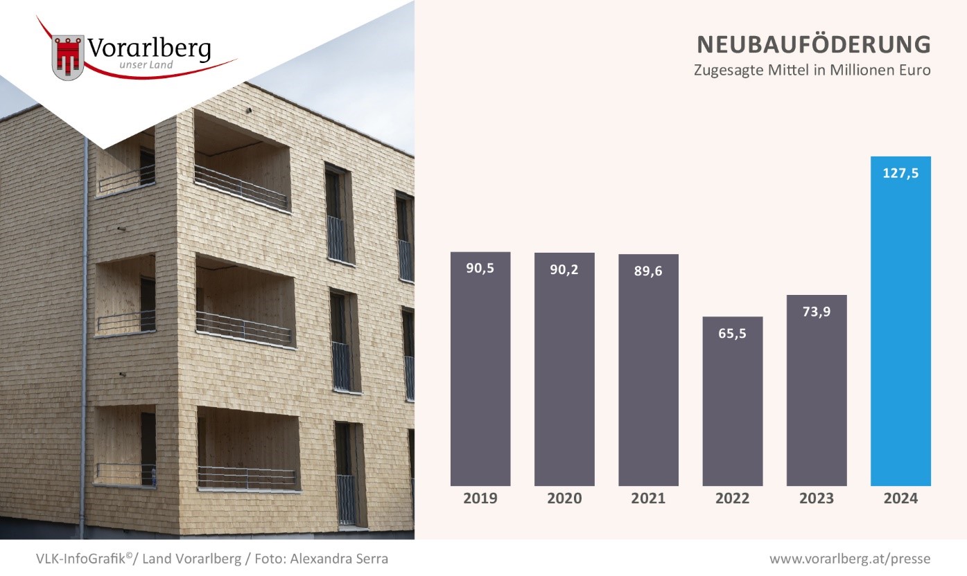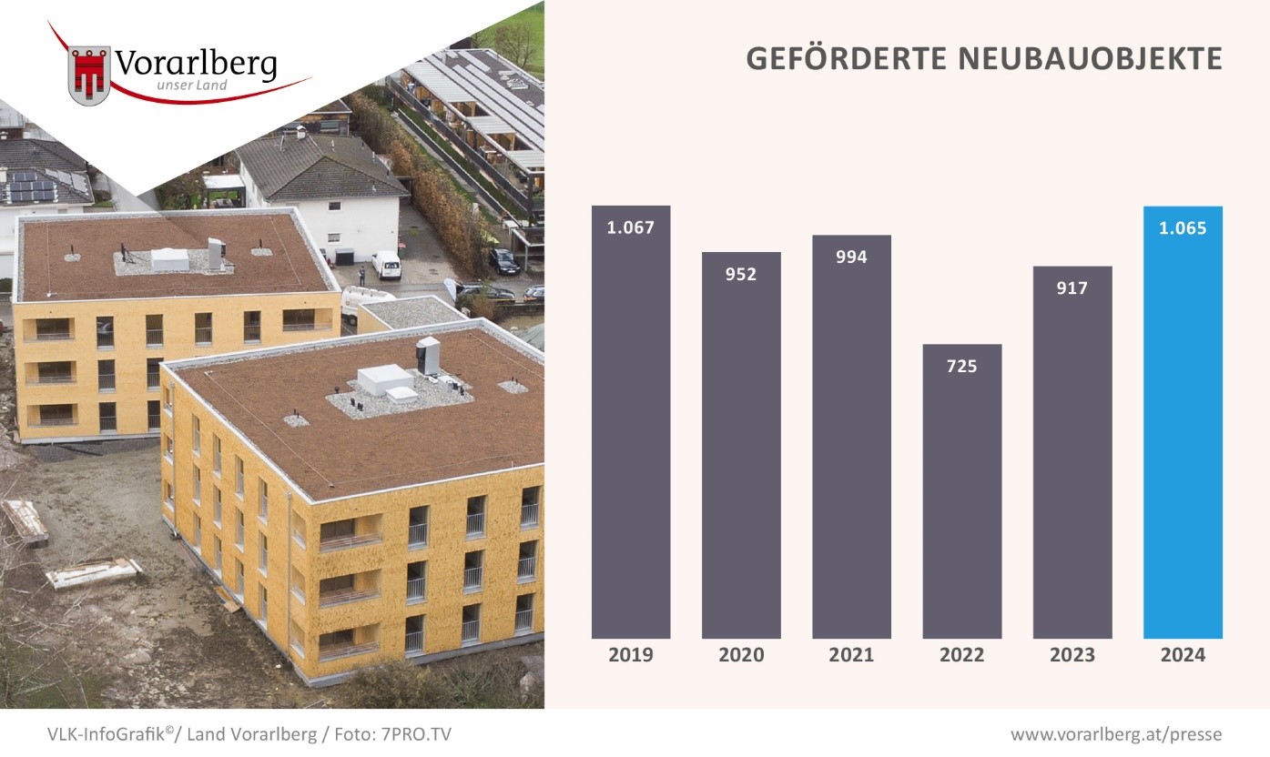 Die Wohnbauförderung des Landes Vorarlberg verzeichnete im letzten Jahr eine steigende Nachfrage in allen Bereichen. Im Neubau wurden 2024 für 1.065 Wohneinheiten – davon 479 gemeinnützige Wohnungen – Kredite und Zuschüsse von insgesamt 127,5 Millionen Euro zugesagt (2023: 917 Wohneinheiten).