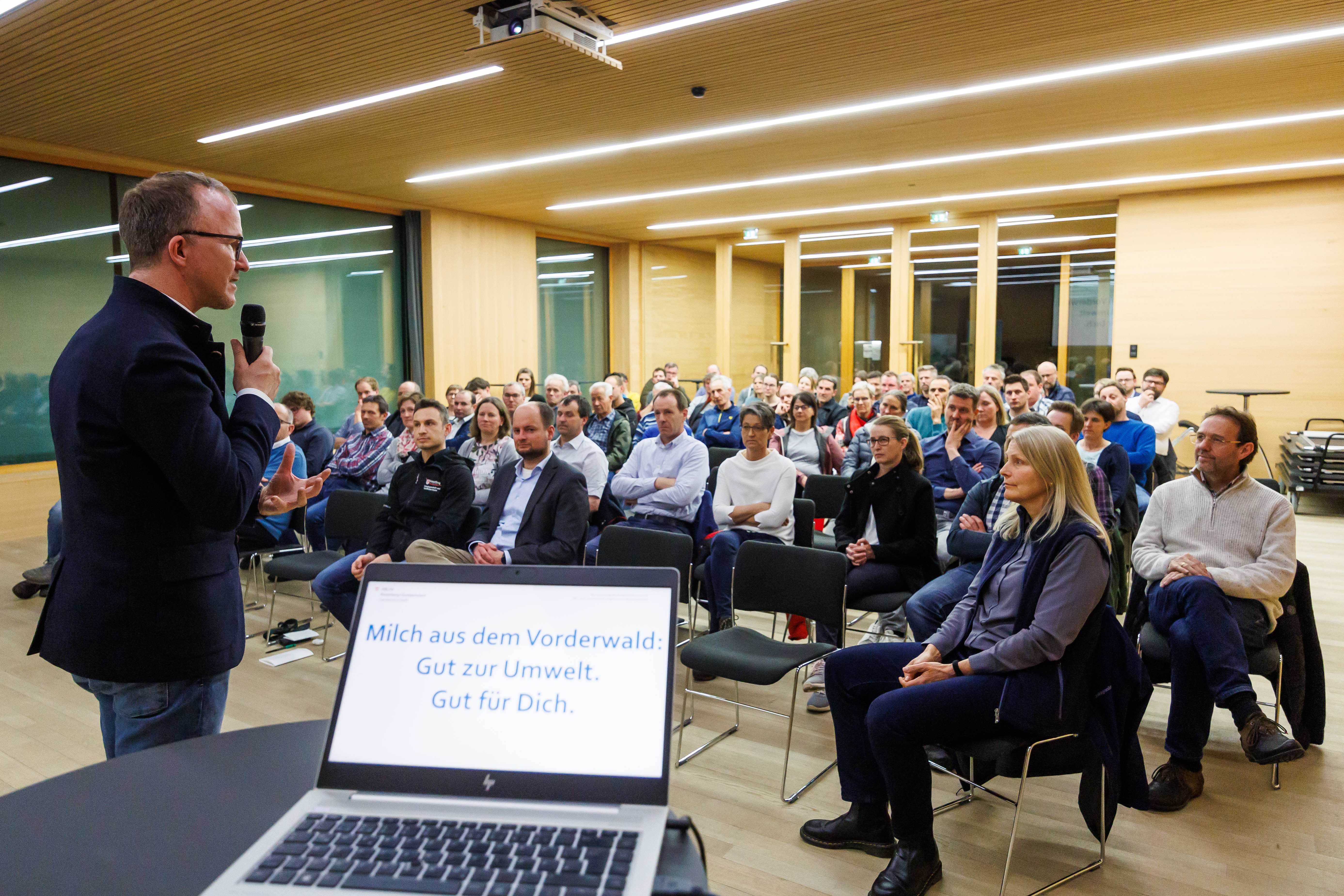Das Betriebsmanagement-Werkzeug „FarmLife“ wurde an der Höheren Bundeslehr- und Forschungsanstalt für Landwirtschaft Raumberg-Gumpenstein entwickelt, damit Landwirtinnen und Landwirte den eigenen Betrieb sowohl ökonomisch als auch ökologisch einschätzen können. Thomas Guggenberger von der HBLFA Raumberg-Gumpenstein belegte anhand der ausgewerteten Ergebnisse die wertvollen Leistungen der am Projekt beteiligten LandwirtInnen für die Gesellschaft und deren umweltorientierte Wirtschaftsweise. Besonderen Stellenwert haben die ertragreichen Grünlandstandorte im Vorderwald, denn die auf diesen Flächen von den bäuerlichen Familienbetrieben selbst erzeugte Futtergrundlage in Form von Gras und Heu mit der bodengebundenen Kreislaufwirtschaft sei ein wichtiger Hebel für eine gute Ökobilanz.
