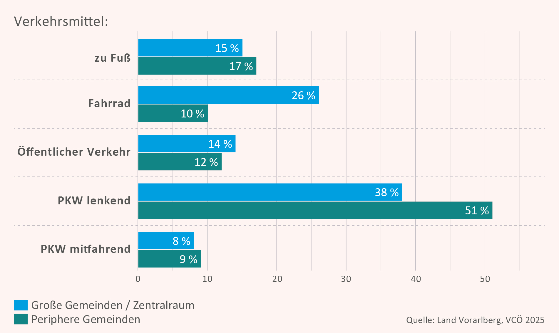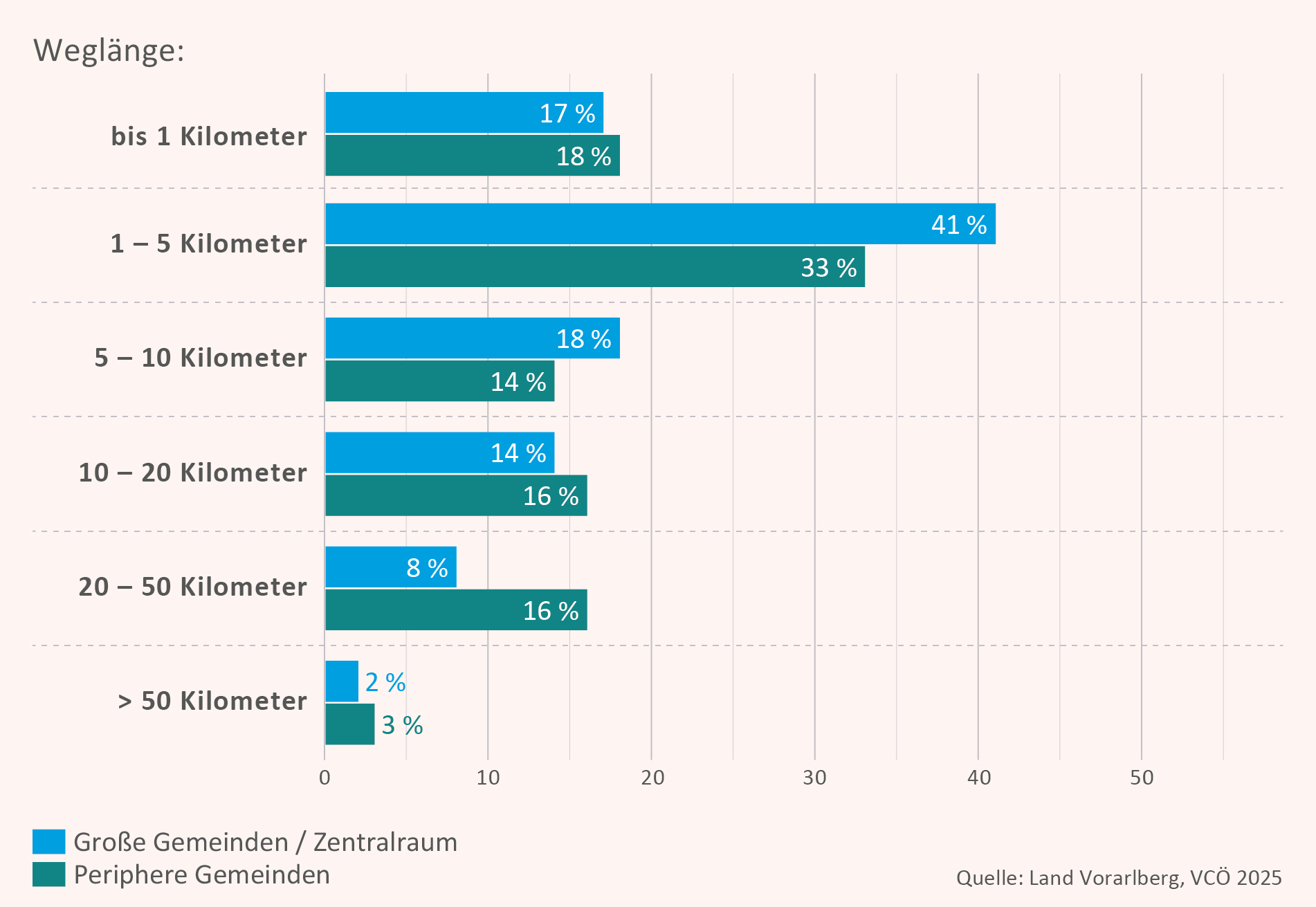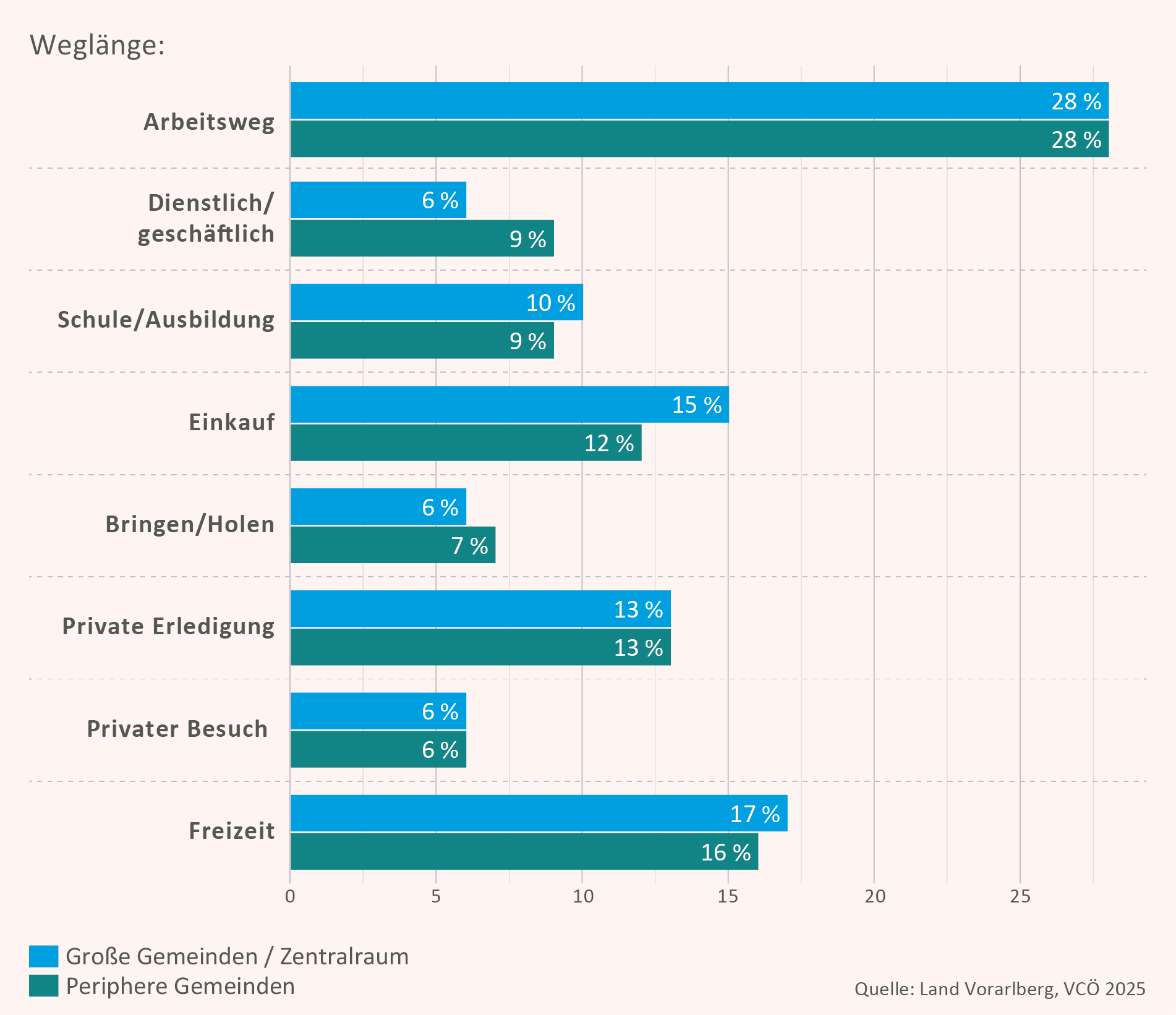 De facto keine Unterschiede gibt es bei den Wegzwecken und bei der Anzahl der Wege zwischen Stadt und Land. Mobile Personen, die in peripheren Gemeinden wohnen, legen im Schnitt 3,2 Wege pro Werktag zurück, in den größeren Gemeinden sind es 3,3 Wege. Der Anteil der Arbeitswege ist gleich hoch, ebenso der Freizeitwege, Besuche und privaten Erledigungen.