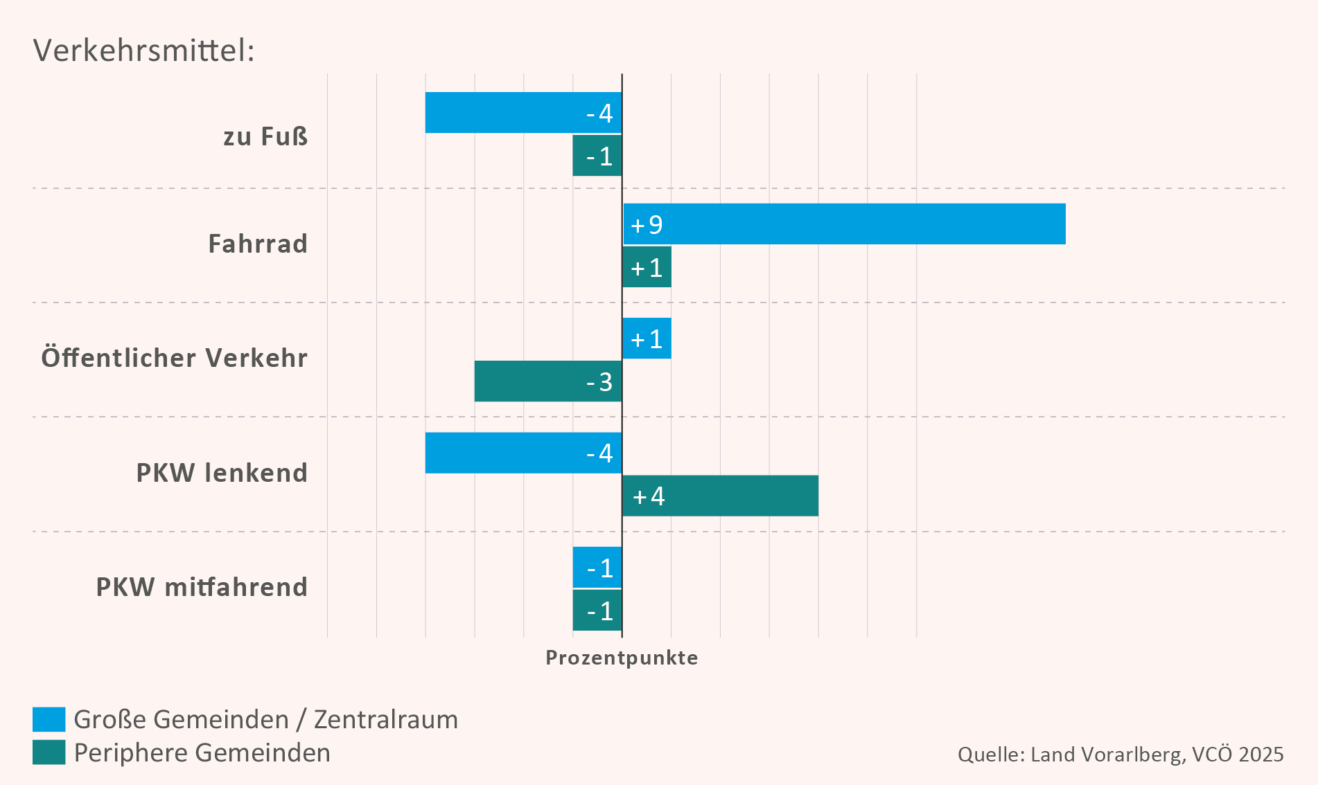 Unterschiede zwischen Stadt und Land gibt es auch bei der Entwicklung des Mobilitätsverhaltens seit dem Jahr 2013. In den großen Gemeinden ist der Anteil des Radverkehrs stark gestiegen, der Autoverkehr anteilig deutlich zurückgegangen, der Öffentliche Verkehr hat leicht zugelegt. In den peripheren Gemeinden ist der Anteil des Öffentlichen Verkehrs gesunken, der Radverkehr ist leicht und der Autoverkehr stark gestiegen.