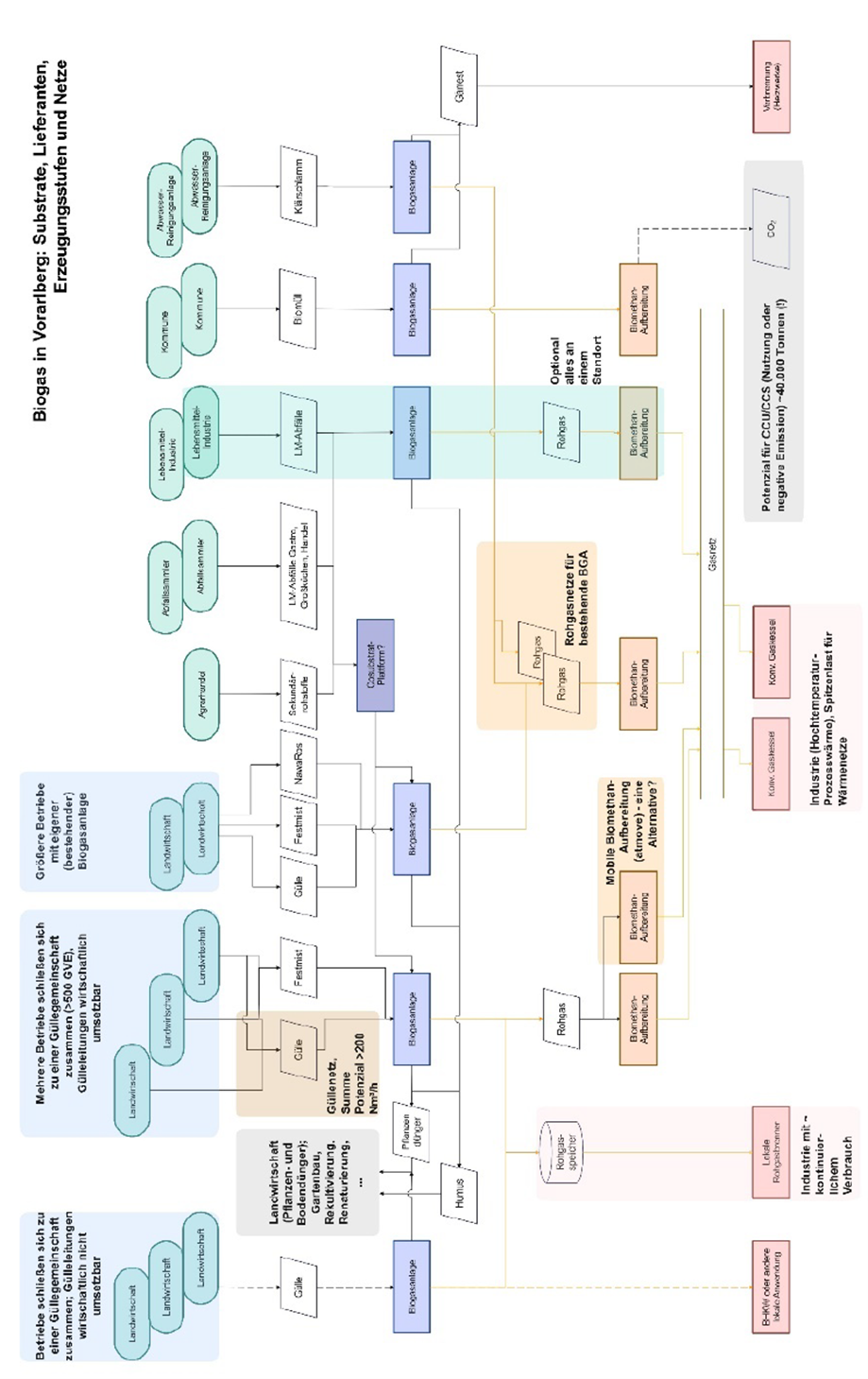 Bis dato wird in Vorarlberg Biogas, neben zwei Einspeisungen ins Gasnetz, vor allem von in landwirtschaftliche Betriebe integrierten Anlagen produziert. Das Biogas wird dabei in der Regel in KWK-Anlagen verstromt und dieser sodann eingespeist. Soweit möglich wird die entstehende Wärme in den Betrieben genutzt.
