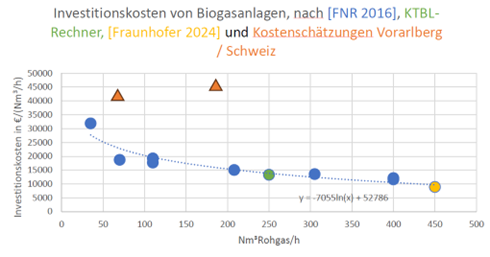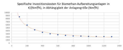 Die nachfolgende Grafik der Investitionskosten enthält die spezifischen Investitionskosten (Fermenter, Technik, Gebäude, Planungshonorare, etc.) in Euro pro verarbeitbarer Rohgasmenge (Nm³/h) und basiert auf dem Leitfaden [FNR 2016] aus dem Jahr 2016; inflationsbereinigt um 80 Prozent.