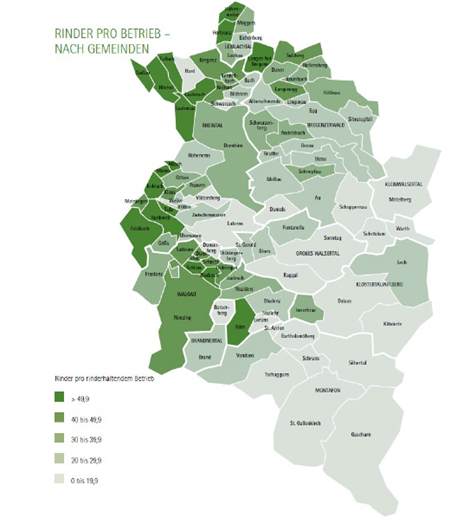 Den größten Anteil an den Potentialen nimmt Wirtschaftsdünger ein. Dieser wiederum ist naturgemäß stark abhängig von der Anzahl bzw. der Dichte des Tierbestandes. Die folgende Übersicht illustriert die Verteilung in Vorarlberg nach Rindern pro Betrieb, gegliedert nach Gemeinden.