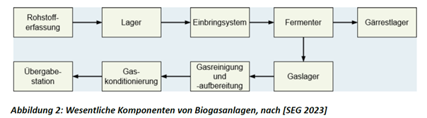 Die nachfolgende schematische Darstellung enthält die wesentlichen Komponenten der Biomethanproduktion. Unter Rohstofferfassung ist unter anderem Substrat-Transport und -Handling zu verstehen, die Sammlung der Substrate sind im Fall von Abfall- und Reststoffen hingegen im vorgelagerten Prozess anzusiedeln.