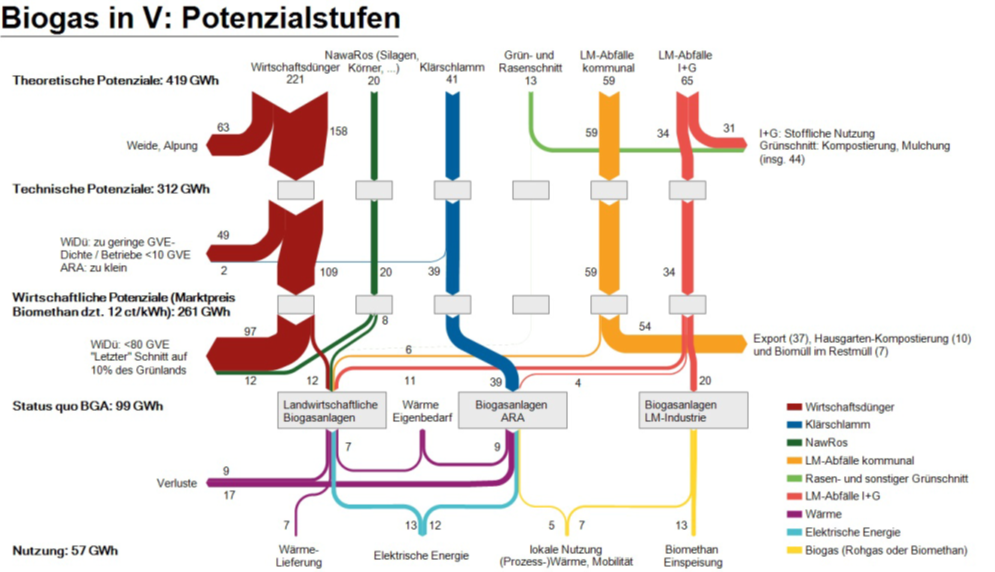 - Das wirtschaftliche Biogaspotenzial liegt bei 261 GWh jährlich, davon werden derzeit 99 GWh in Biogasanlagen produziert; nach Abzug von Eigenbedarf und Verlusten werden 57 GWh genutzt. Das größte wirtschaftliche, noch ungenutzte Potenzial liegt im Bereich Wirtschaftsdünger (109 GWh), gefolgt von kommunalen Bioabfällen.