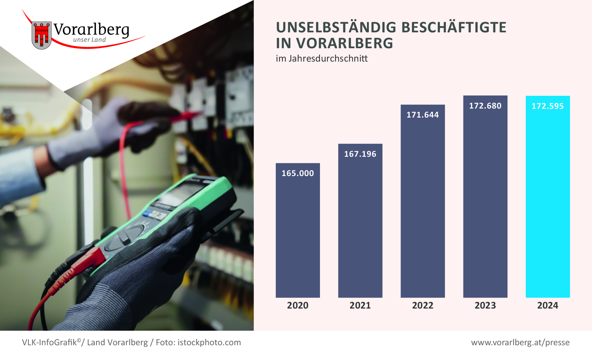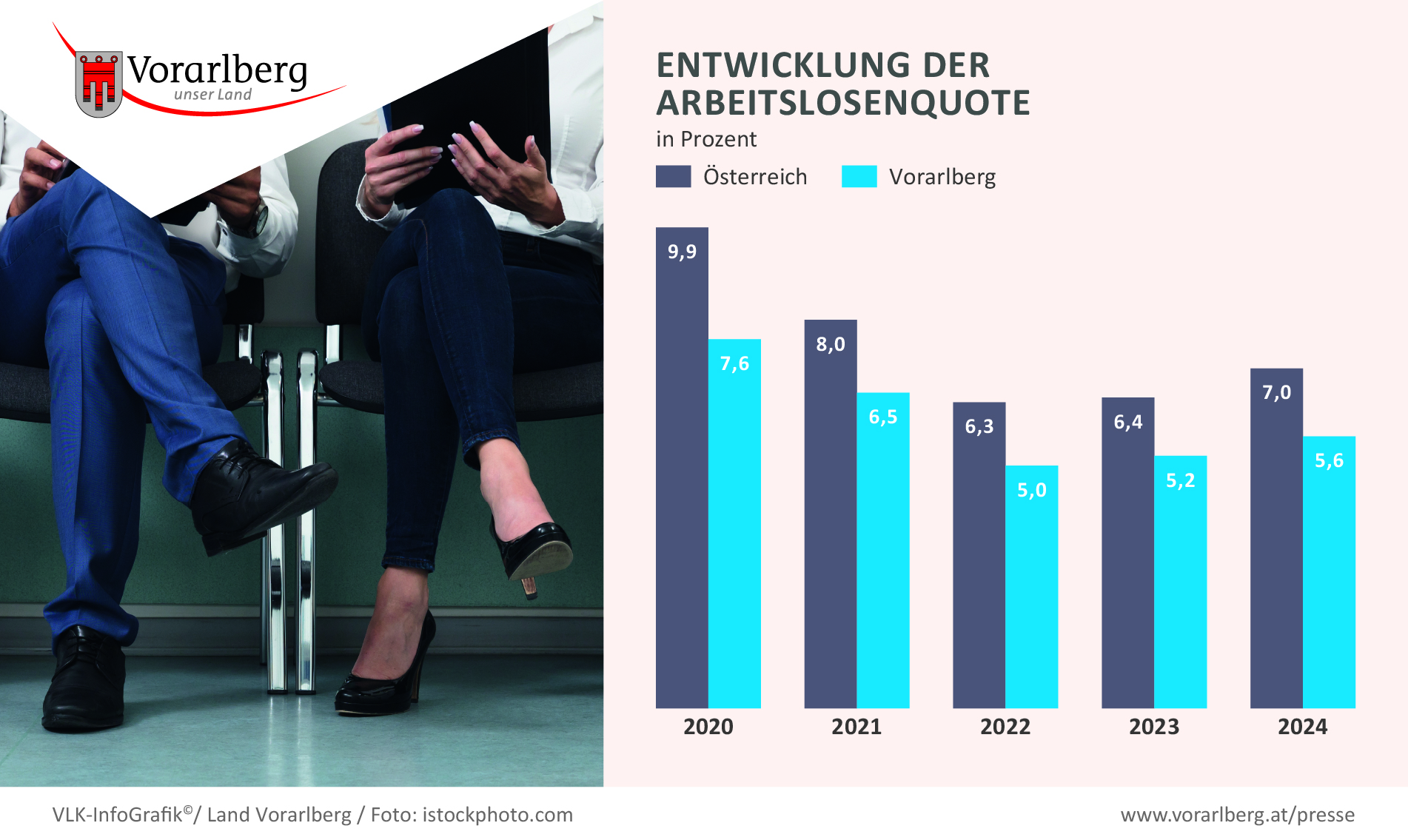 2024 waren im Jahresdurchschnitt 10.268 Personen arbeitslos vorgemerkt, um 875 Personen bzw. 9,3 Prozent mehr als im Jahr davor. Die Zahl der unselbstständig Beschäftigten ist mit insgesamt 172.595 Beschäftigten recht stabil geblieben (-0,1 Prozent). Die Zunahme an Arbeitslosen im letzten Jahr verteilt sich ungleichmäßig auf die Geschlechter: Frauen +7,1 Prozent, Männer inkl. alternative Geschlechter +11,1 Prozent. Deutliche Auswirkungen zeigt die eingetrübte wirtschaftliche Gesamtlage in den Bundesländern mit einem hohen Anteil an Beschäftigten im Industrie- und Baubereich. Der Anteil der Beschäftigten in der Industrie (Herstellung von Waren) liegt in Vorarlberg bei knapp 26 Prozent. In diesem Wirtschaftsbereich stieg die Zahl der arbeitslosen Personen im Jahresschnitt um 9,0 Prozent, im Bau um 10,9 Prozent.