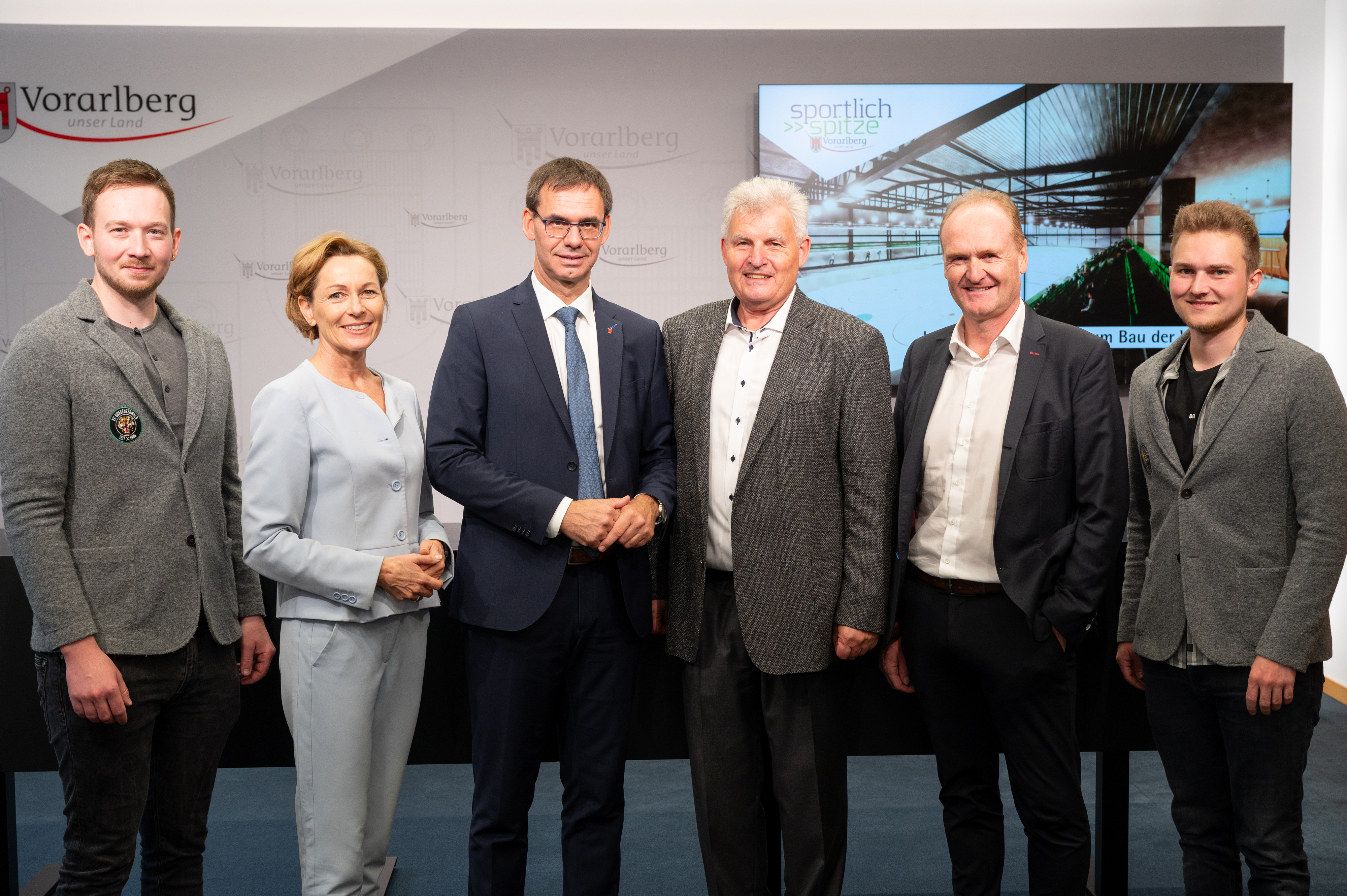 Bregenz (VLK) – „Die Wälderhalle wird kommen“, verkündete Landeshauptmann Markus Wallner im heutigen (Dienstag, 24. Oktober) Pressefoyer. Die Landesregierung hat ihre Mitfinanzierung zugesichert, zusammen mit dem Beitrag der Regio Bregenzerwald und dank starker privater Beteiligung stehe das Projekt damit finanziell auf einer soliden Basis. Die verbindliche Förderzusage durch das Land werde nach Vorlage des erforderlichen Antrages erfolgen. Die Baupläne sind soweit fertig, um mit der detaillierten Ausarbeitung beginnen zu können. Die Beteiligten hoffen auf einen möglichen Spatenstichtermin bereits im kommenden April und auf die Inbetriebnahme der Halle im Herbst 2025. „Der Bau der Mehrzweckhalle in Andelsbuch ist neben dem sportlichen Aspekt eine Bereicherung der Freizeitinfrastruktur, insbesondere für Jugend im Bregenzerwald“, sagte Wallner im Pressefoyer gemeinsam mit Sportlandesrätin Martina Rüscher, Regio-Obmann Guido Flatz und dem Sprecher der Projektinvestoren Hans Metzler.