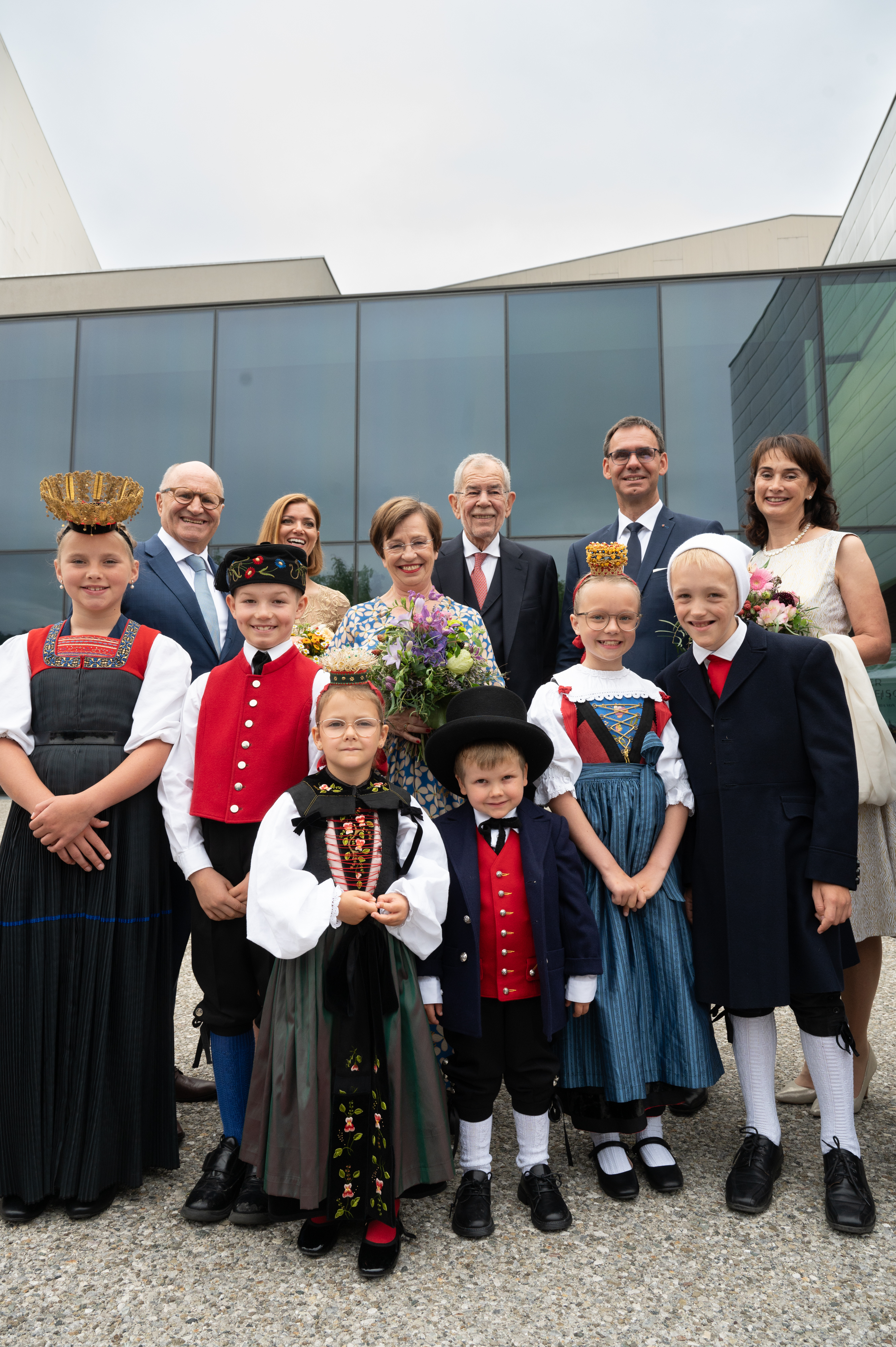 Medieninformation Mittwoch, 17.07.2024, 11:24 Ehrengäste vor dem Festspielhaus von Kindertrachtenpaaren begrüßt Blumengruß für BP Van der Bellen, LH Wallner, Bgm. Ritsch und Festspielpräsident Metzler
