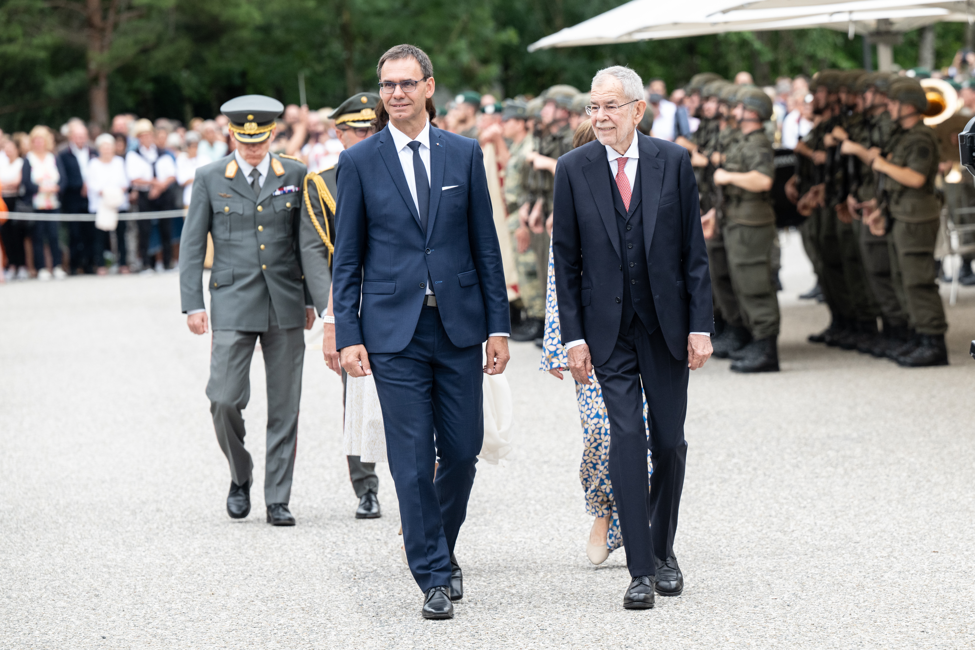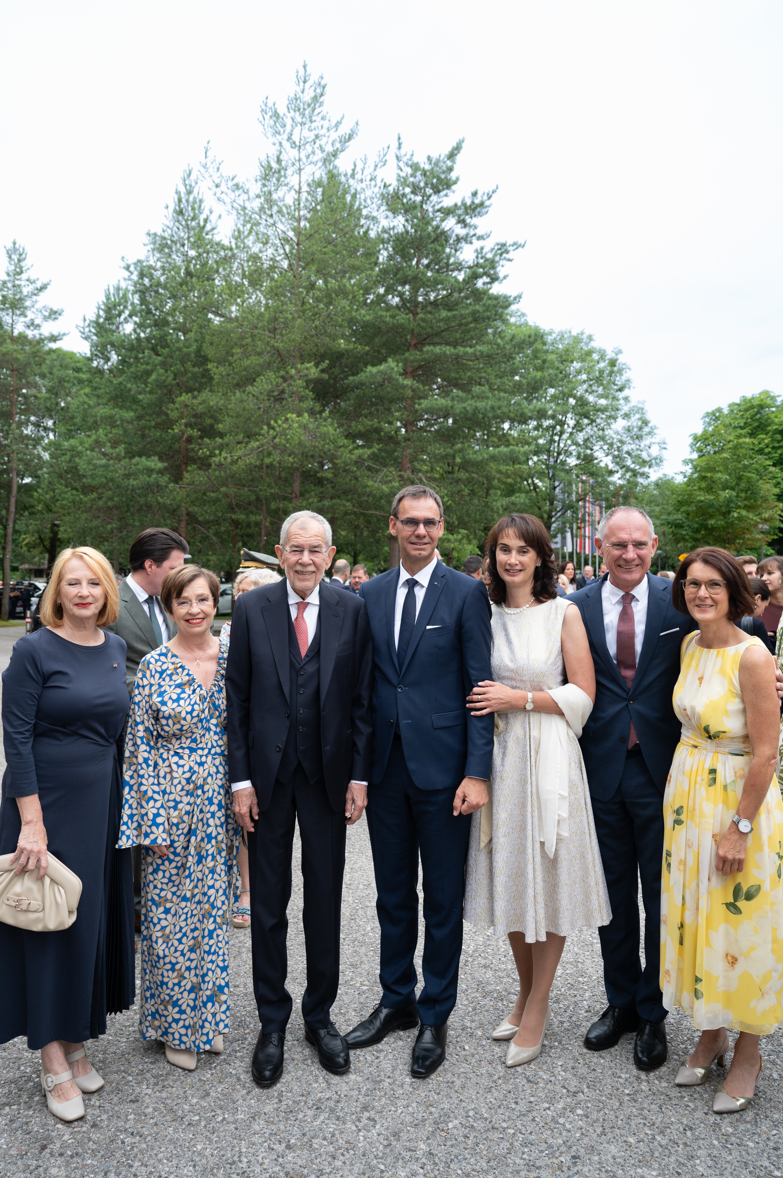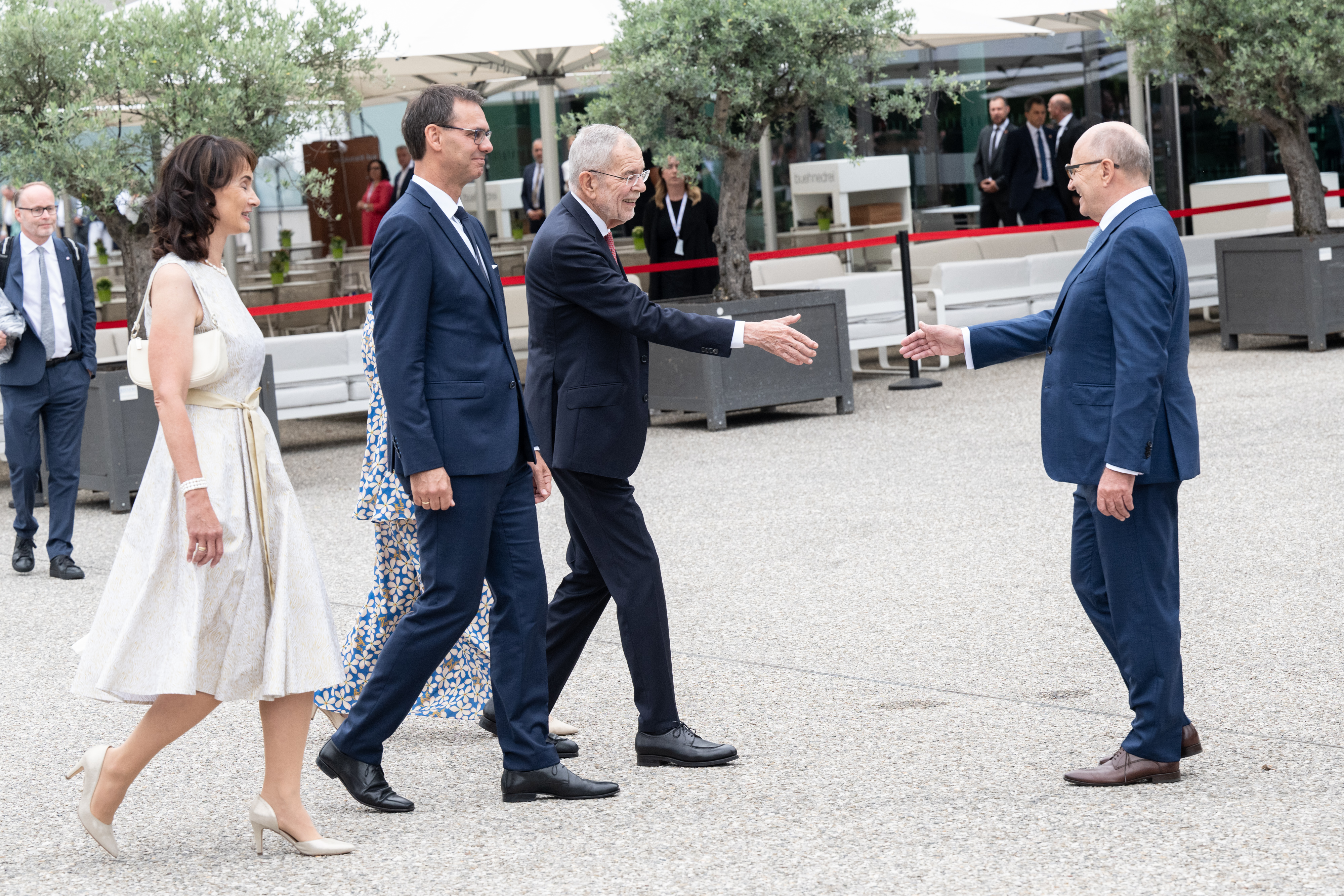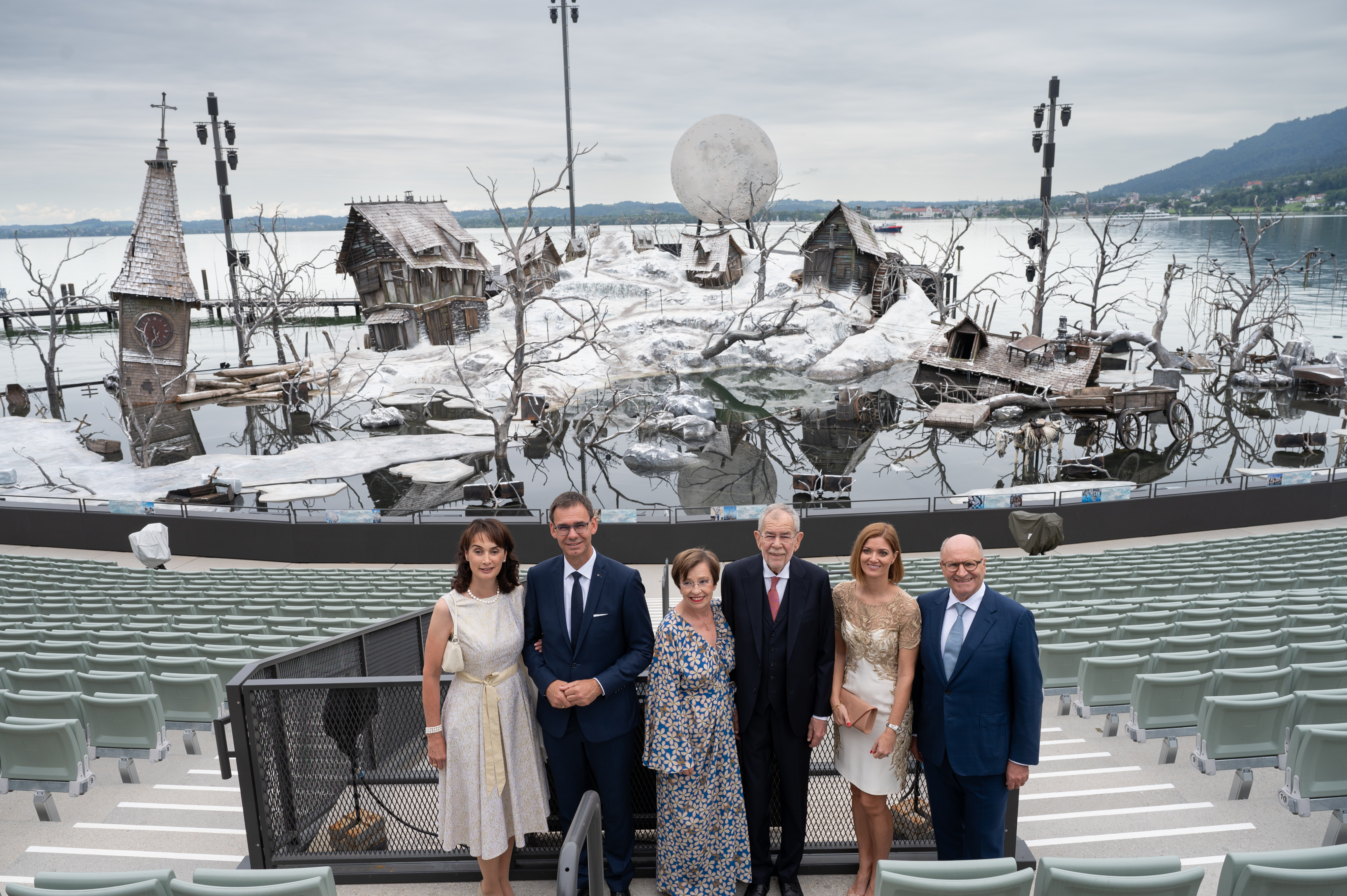 Reihenfolge (von links): Festspielpräsident Hans-Peter Metzler, Kathrin Cometto, BP Van der Bellen mit Gattin Doris Schmidauer, LH Wallner mit Gattin Sonja, Bgm. Ritsch mit Gattin Yvonne.