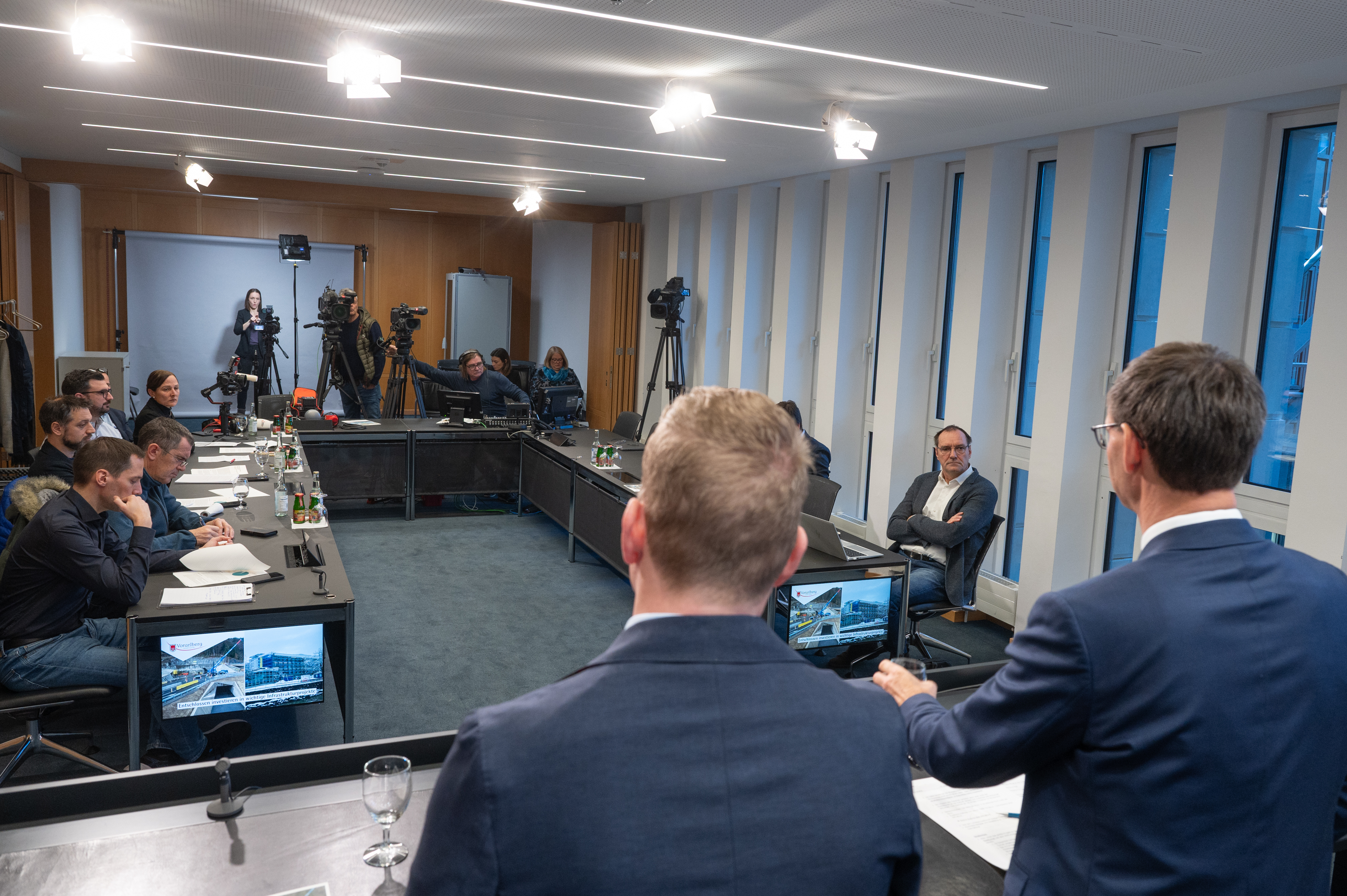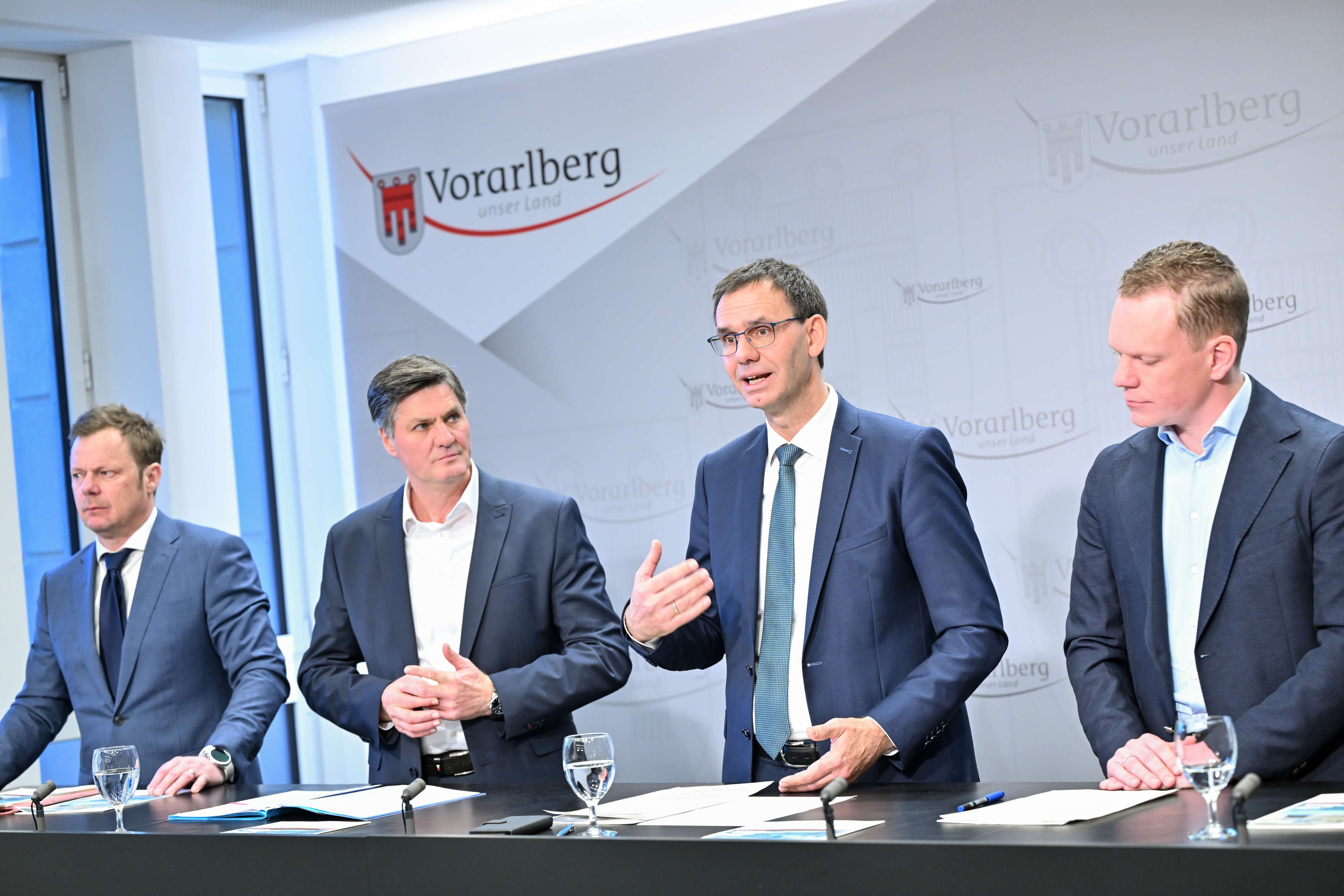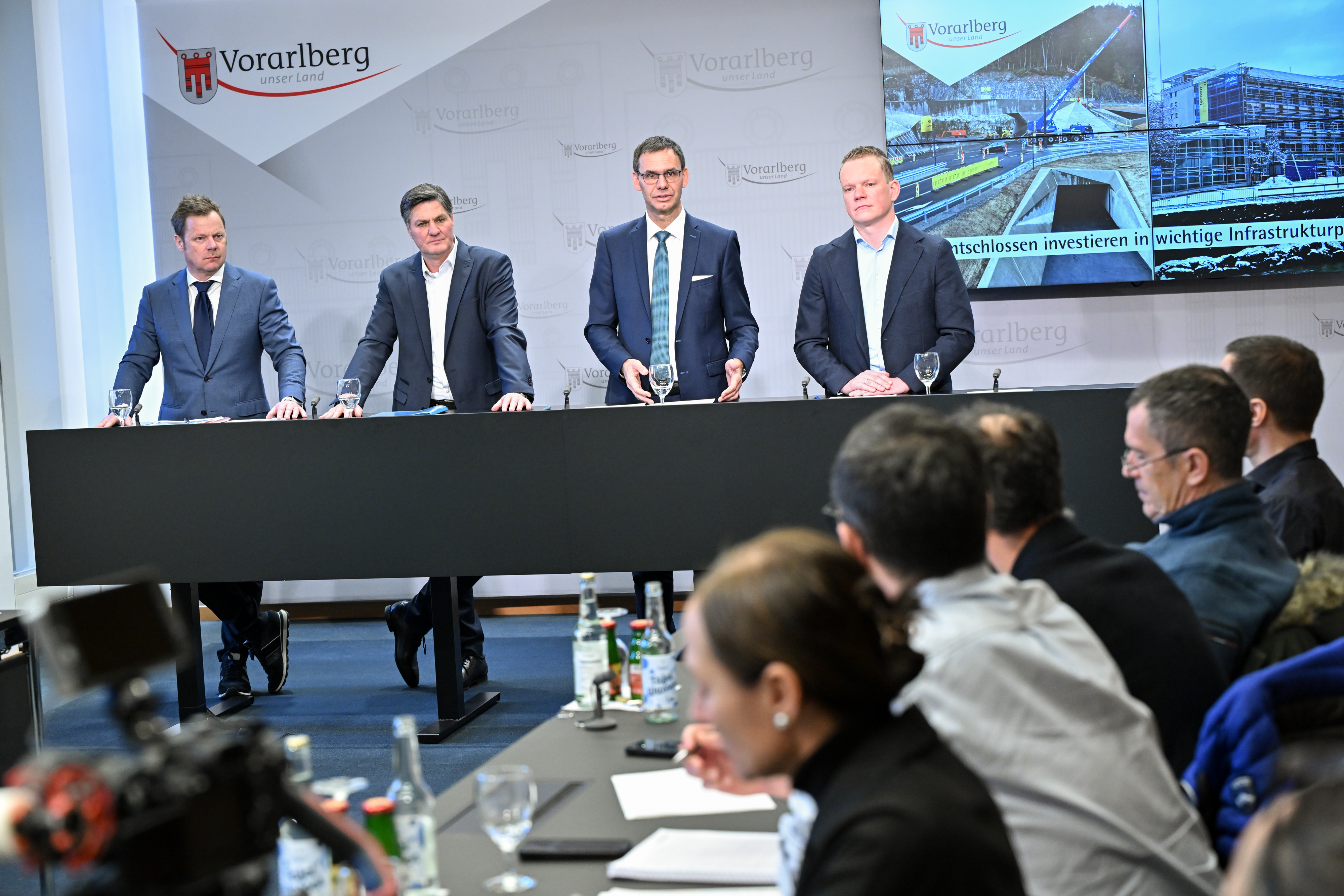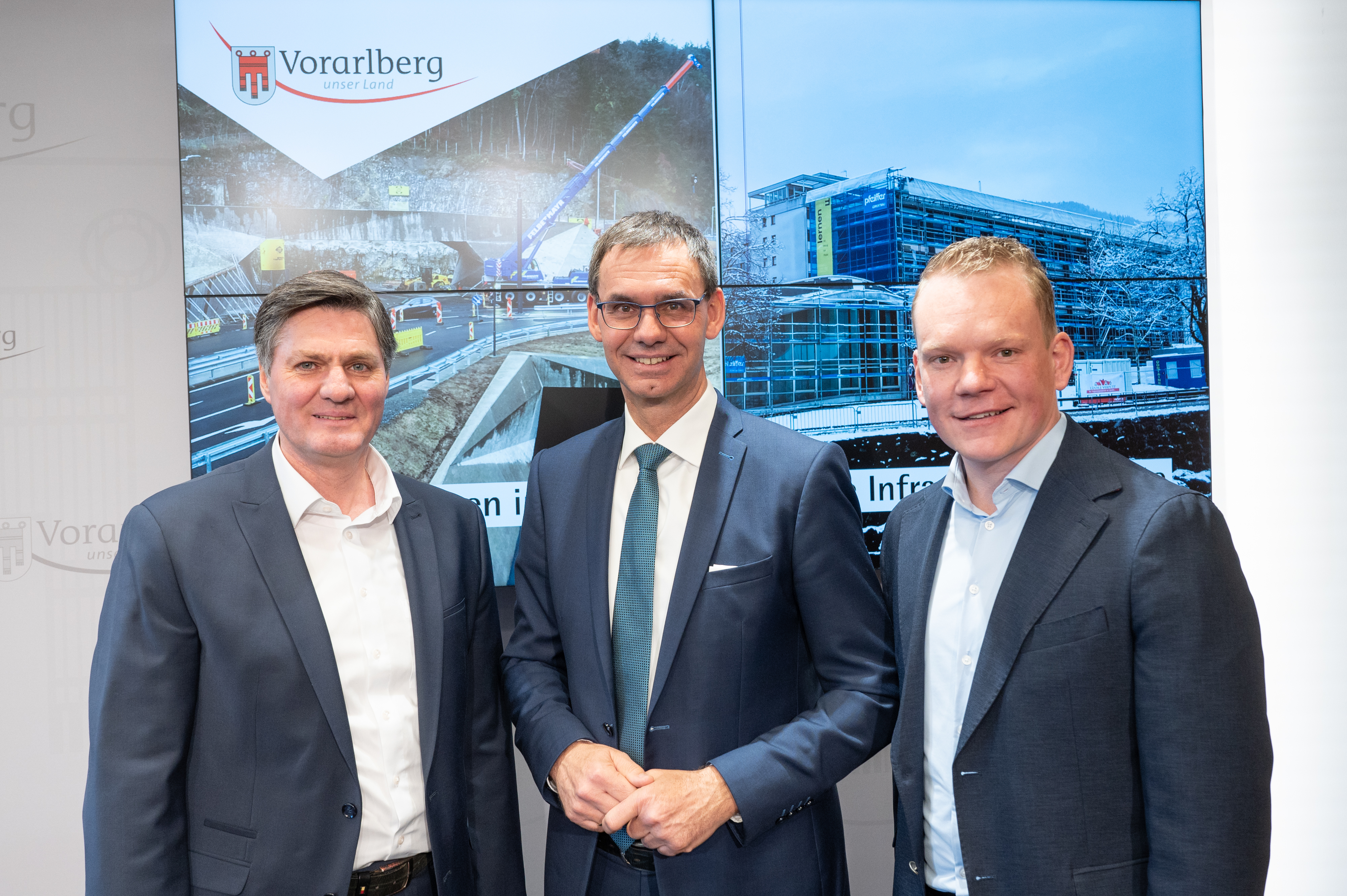 Die Hochbau- und Straßenbauprogramme des Landes Vorarlberg schlagen im Budget 2025 mit mehr als 190 Millionen Euro zu Buche, das sind um rund 20 Millionen Euro mehr als im letzten Jahr. Mit dieser Steigerung unterstreicht die Landesregierung ihre Entschlossenheit, der anhaltenden Rezession mit kräftigen Investitionen in wichtige Infrastrukturprojekte entgegenzutreten, betont Landeshauptmann Markus Wallner im Pressefoyer gemeinsam mit den ressortzuständigen Regierungsmitgliedern Landesstatthalter Christof Bitschi und Landesrat Daniel Allgäuer. Bei den größten Bauvorhaben des Landes – Stadttunnel Feldkirch, Erweiterung der Fachhochschule sowie Um- und Ausbau der Landeskrankenhäuser Rankweil und Feldkirch – werden heuer umfangreiche Bauetappen umgesetzt. „Eine zukunftsfähige Infrastruktur zur Verkehrsentlastung sowie in den Bereichen Gesundheit und Bildung ist das Fundament für einen starken Standort Vorarlberg. Zugleich leisten wir mit unseren Investitionen einen Beitrag, um die Konjunktur anzukurbeln und Arbeitsplätze zu schaffen bzw. zu erhalten“, so Wallner.