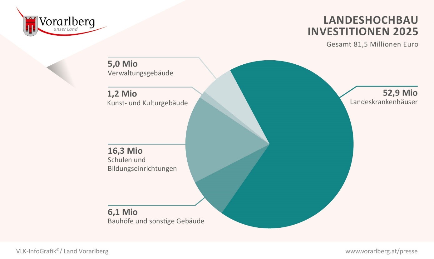 2025 stehen für den Hochbau insgesamt 81,5 Millionen Euro zur Verfügung. Der größte Anteil entfällt mit 52,9 Millionen Euro auf die Krankenhaus-Betriebsgesellschaft, wobei allein die heurigen Bauetappen am LKH Rankweil mit 18 Millionen Euro und am LKH Feldkirch mit 15 Millionen Euro zu Buche schlagen. Über 27 Millionen Euro sind für Hochbauprojekte an Bildungsstätten und Landesgebäuden veranschlagt.