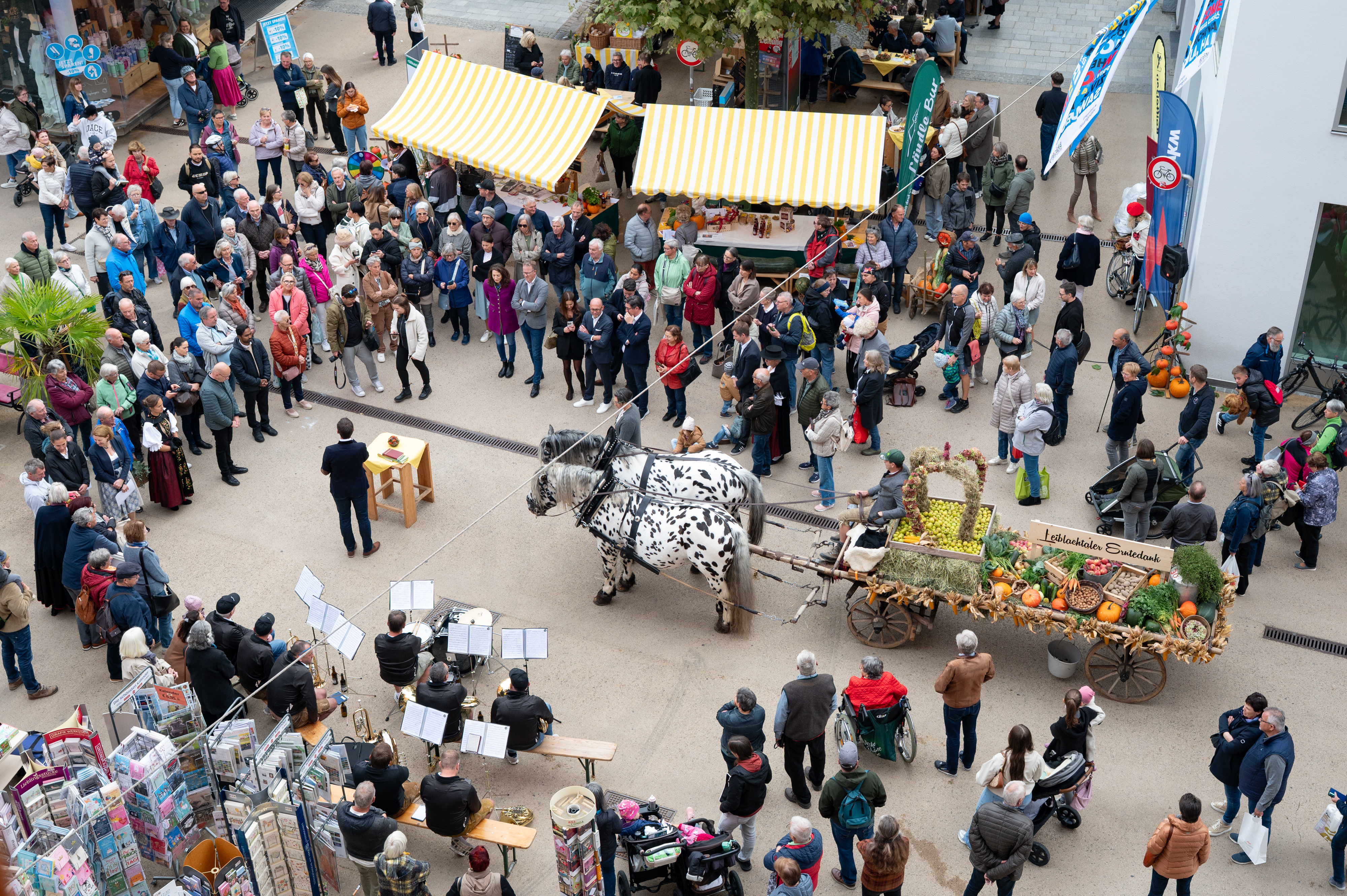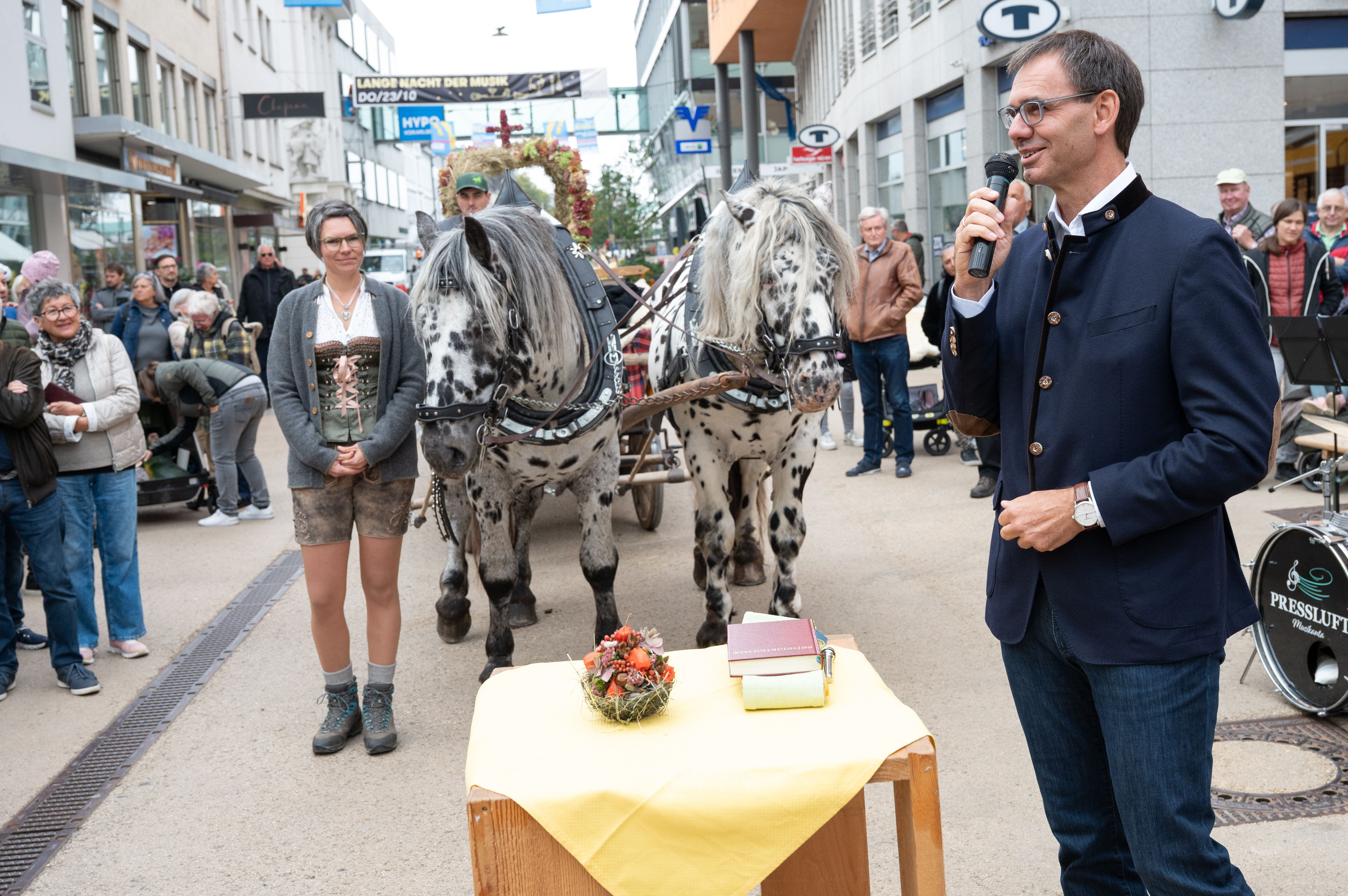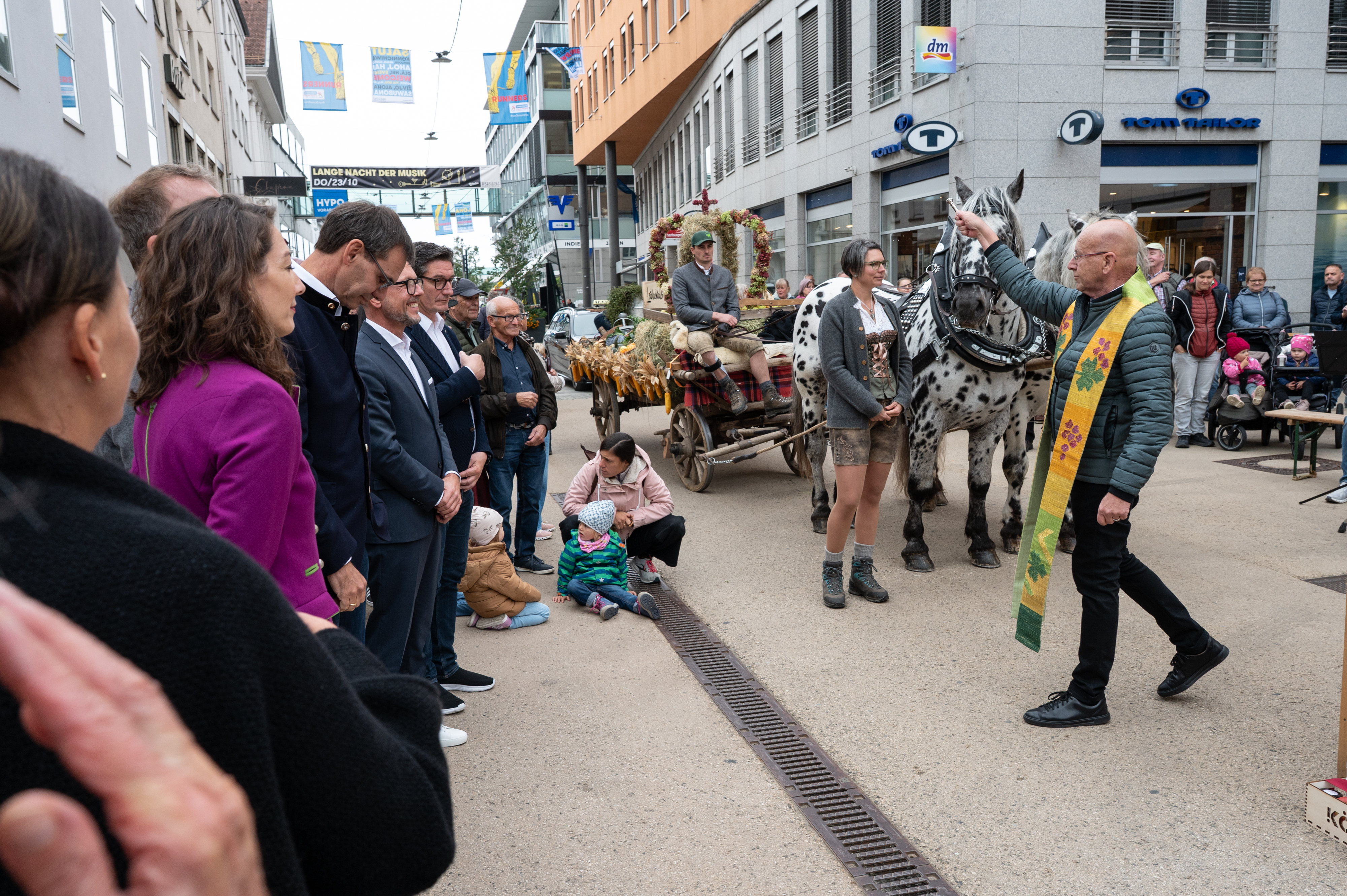 Bregenz (VLK) – Heute (3. Oktober) stand die Kaiserstraße in Bregenz ganz im Zeichen bäuerlicher Arbeit und Produkte. Mit einem festlich geschmückten Erntedankwagen und zahlreichen Marktständen wurde Erntedank gefeiert. Vor Ort betonten Landeshauptmann Markus Wallner und Landwirtschaftslandesrat Christian Gantner die Bedeutung der Landwirtschaft für Vorarlberg und dankten allen Menschen, die in diesem Bereich tätig sind. „Unsere Bäuerinnen und Bauern versorgen uns täglich mit hochwertigen und regionalen Lebensmitteln sowie vielen weiteren Produkten. Ihre Arbeit ist unverzichtbar, denn sie stellen Vielfalt und Qualität sicher und tragen damit zur Lebensqualität im Land bei.“