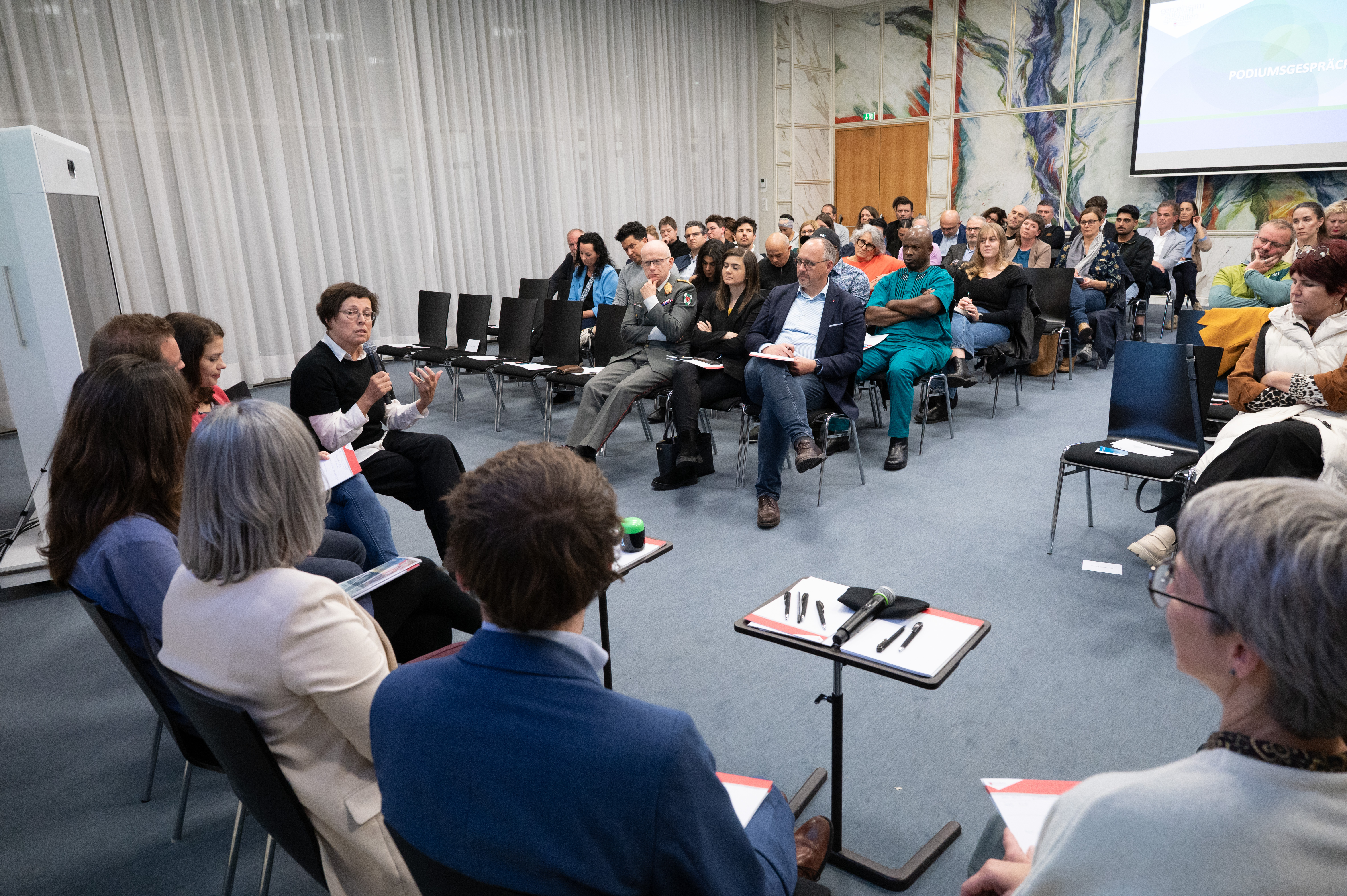 Großes Interesse beim Publikum fand auch ein Podiumsgespräch mit Expertinnen und Experten aus verschiedensten Bereichen: Silvia Hartmann (AMS Vorarlberg/ Abteilung Service für Unternehmen und AusländerInnenfachzentrum), Christian Lampert (Chancenland Vorarlberg – WISTO), Birgit Battlogg (Welcome Center Care Connexia), Angelika Widmer-Lutz (Koordinierungsstelle Vorarlberg AusBildung bis 18 – KOST), Patrick Kirschenhofer (Integrationszentrum Bregenz/Österreichischer Integrationsfonds), Claudia Neumayr (Expat Service Vorarlberg) und Eva Grabherr (okay.zusammen leben). Die Teilnehmenden beleuchteten mit ihrem Fachwissen unterschiedliche Aspekte der Gewinnung und Integration von Fachkräften in Vorarlberg und machten deutlich, wie wichtig die Zusammenarbeit verschiedener Organisationen und das Engagement von einzelnen Menschen ist.