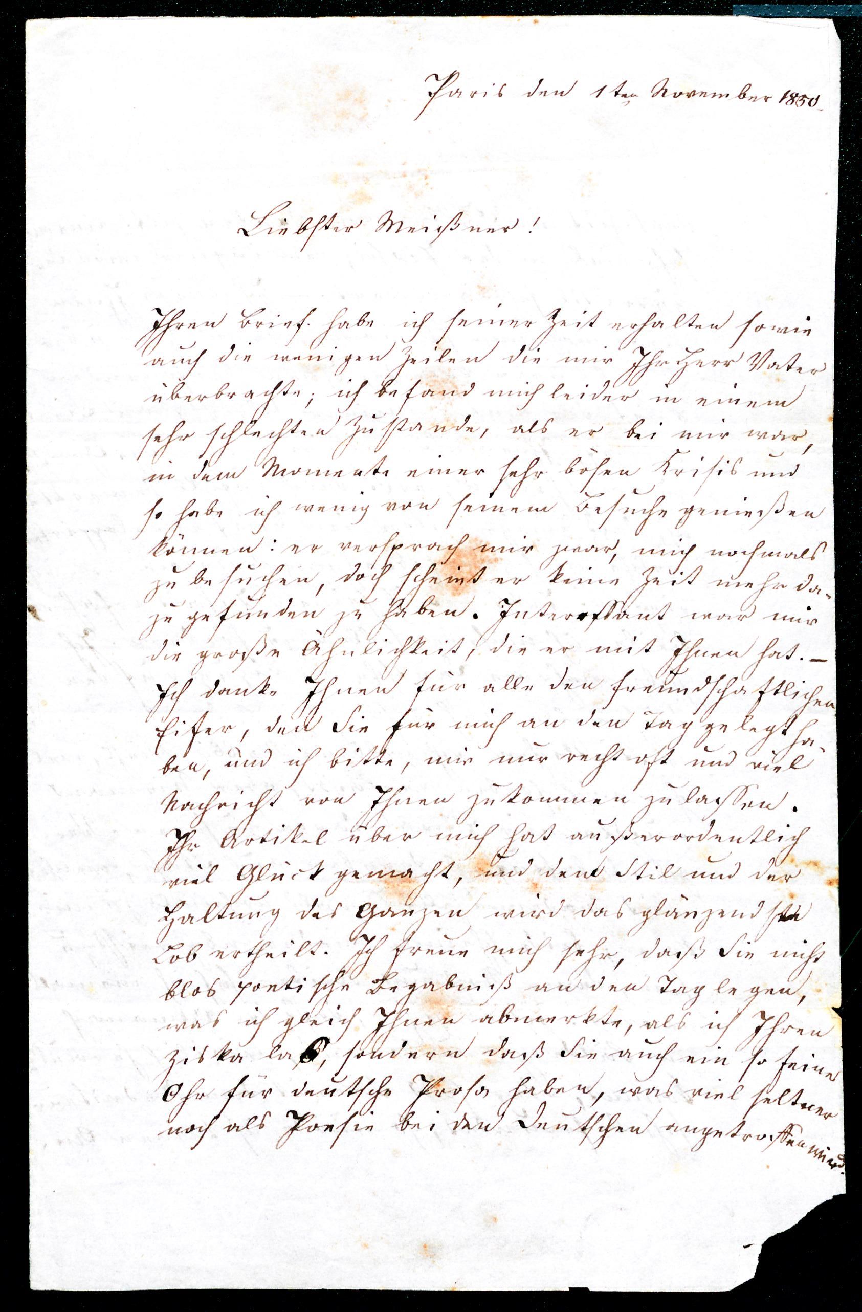 Der Brief gehört zu den inhaltsreichsten der Korrespondenz. Geschrieben wurde er am 1. November 1850 in Paris. Heine bedankt sich für ein Porträt, das Meissner über ihn geschrieben hat und lobt Meissners „Ziska“, eine Sammlung von Gedichten. Weiters schreibt er über gemeinsame Projekte, über sein kompliziertes Verhältnis zu Deutschland und über seinen schlechten Gesundheitszustand: „Mit meiner Gesundheit sieht es noch immer miserabel aus, und mit Schaudern bemerke ich, dass mein Rücken sich krümmt.“ Zu lesen sind auch Neuigkeiten aus dem literarischen Leben.