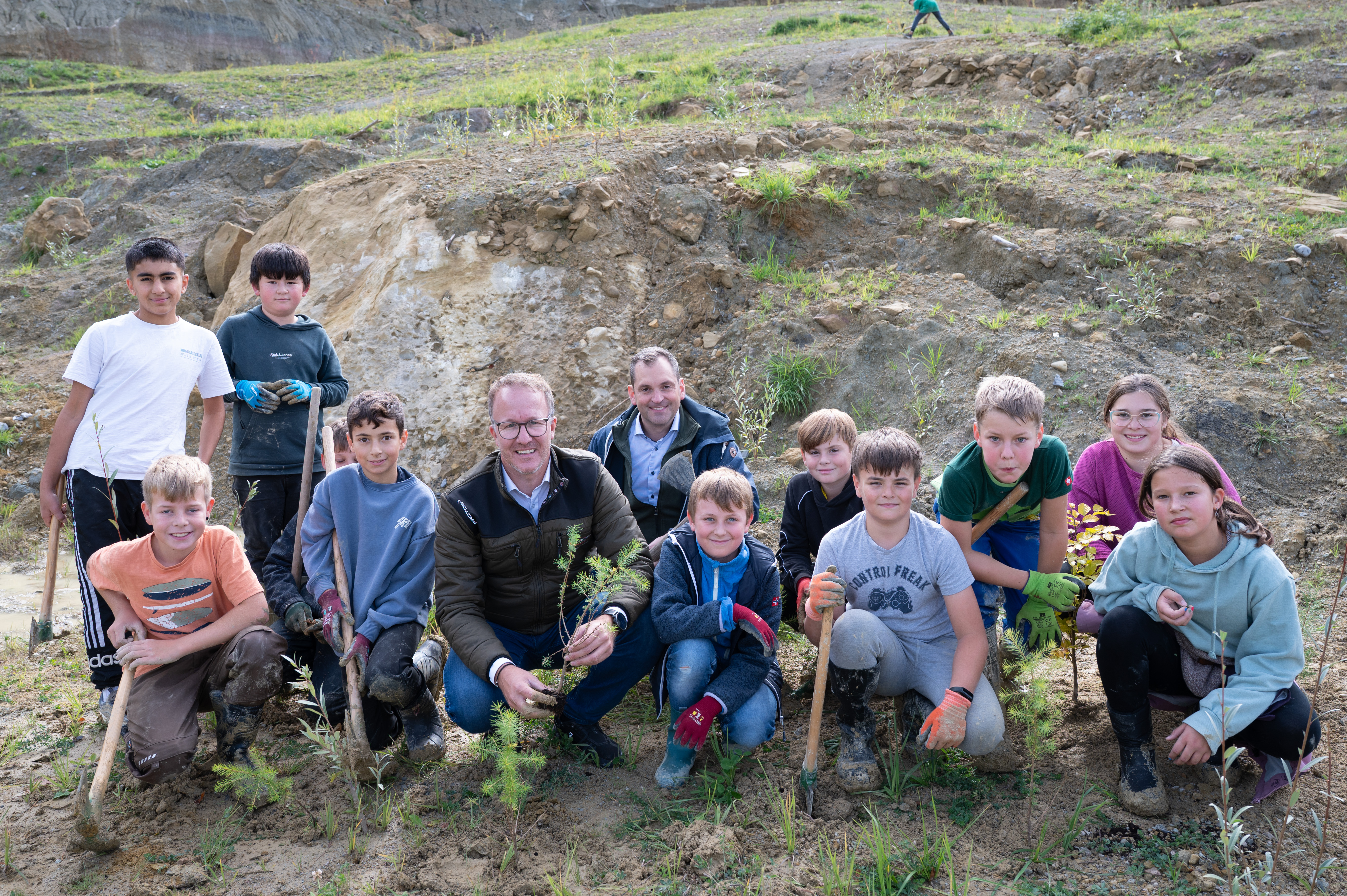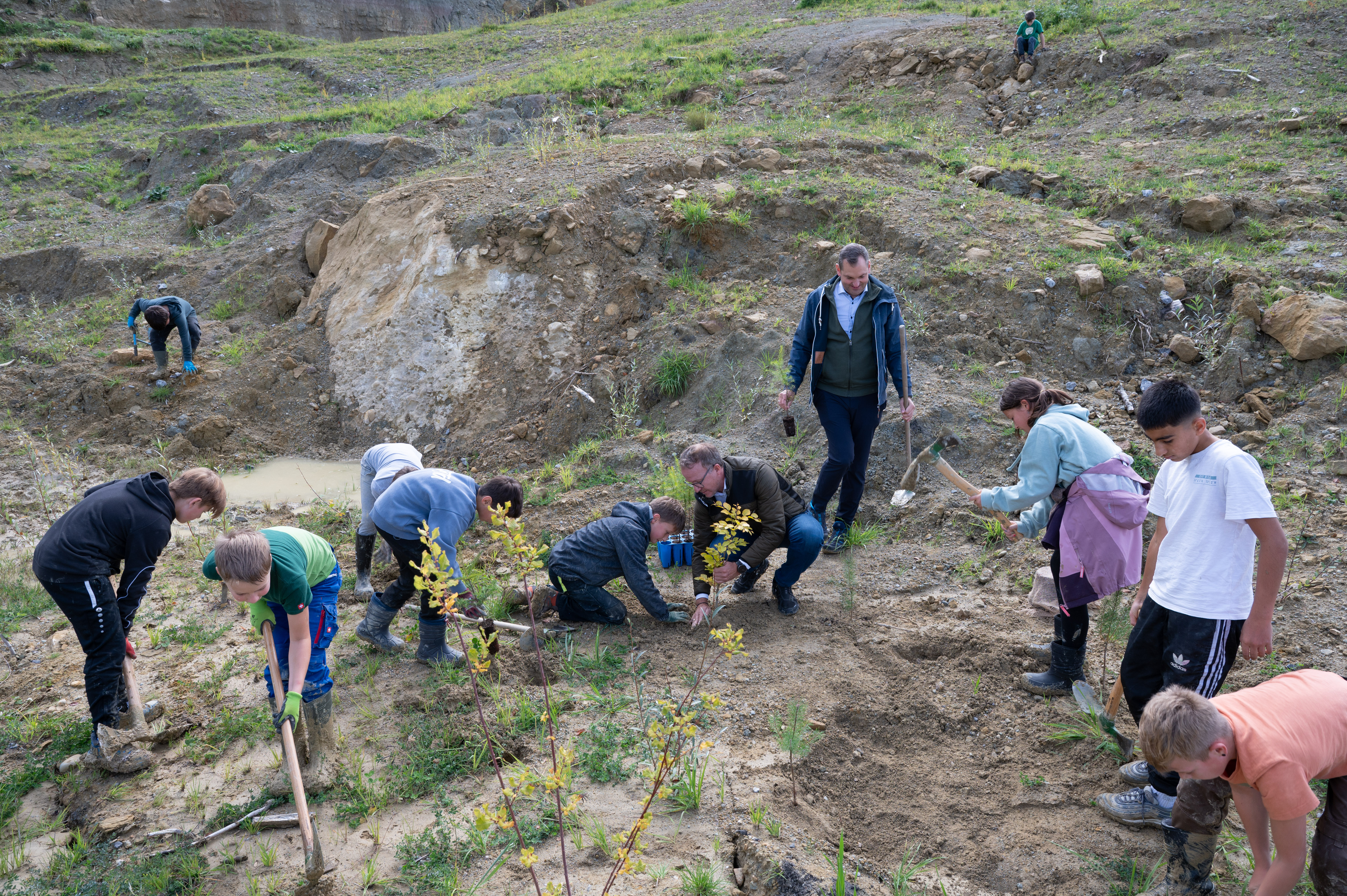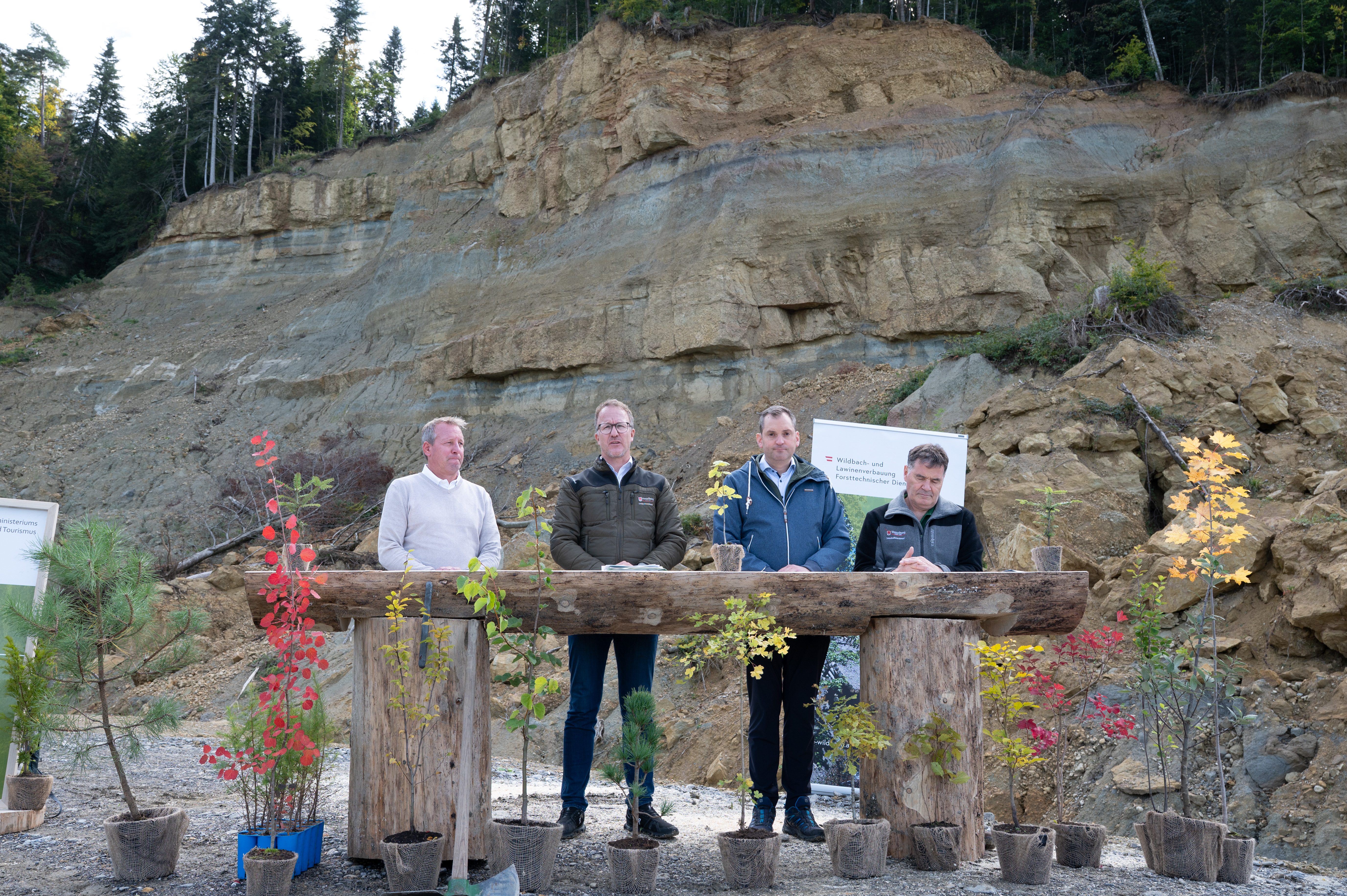 Ein besonderes Zeichen wird heute während der Pressekonferenz gesetzt: Gemeinsam mit Schülerinnen und Schülern der Mittelschule Hörbranz pflanzen Landesrat Christian Gantner, Landesforstdirektor Andreas Amann, Sektionsleiter der WLV Gerald Jäger und Bürgermeister Andreas Kresser im Rutschungsgebiet rund 180 neue junge Bäume aus dem Landesforstgarten. Damit wird nicht nur über die Bedeutung des Schutzwaldes gesprochen, sondern auch sichtbar, wie er Schritt für Schritt wieder aufgebaut wird.