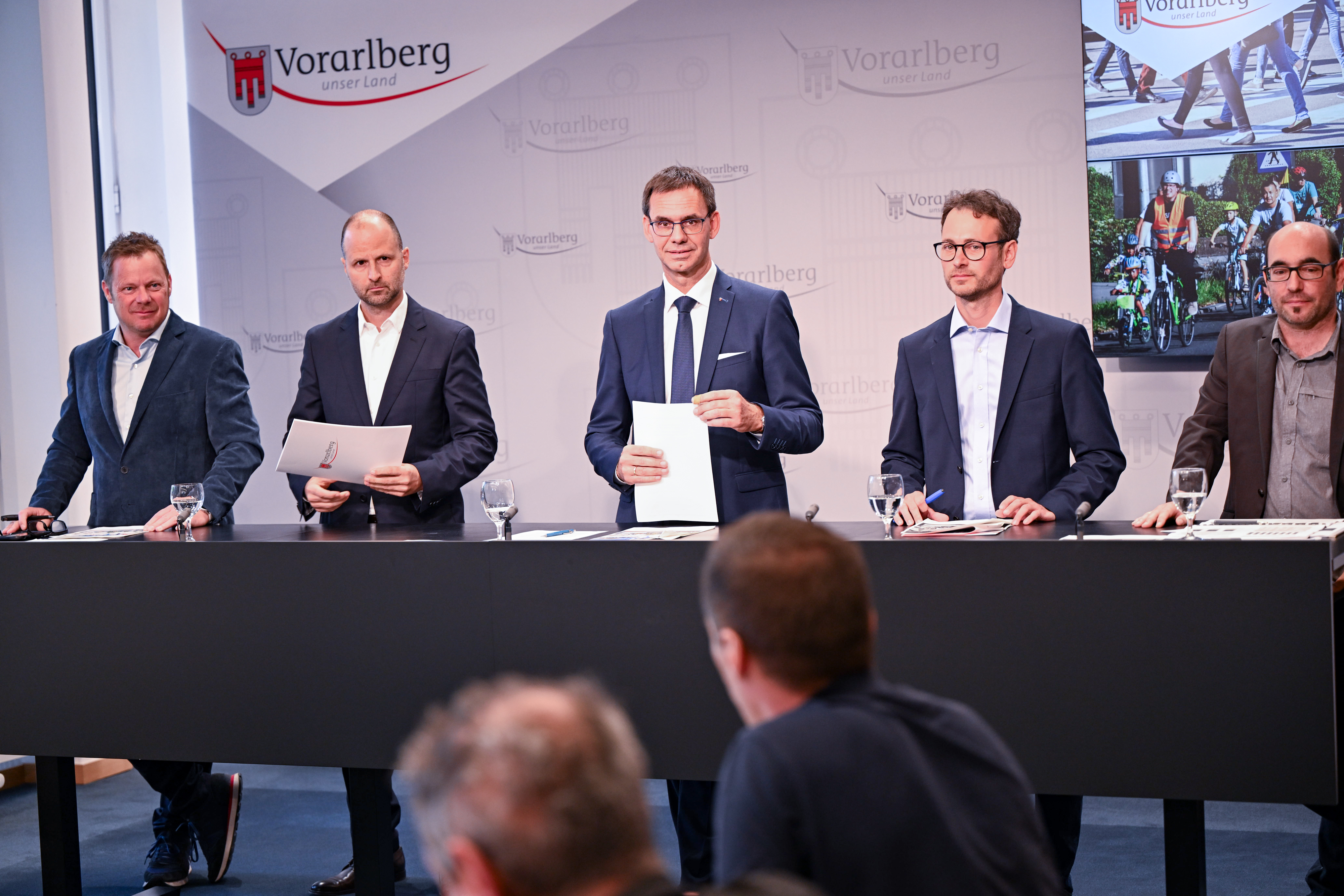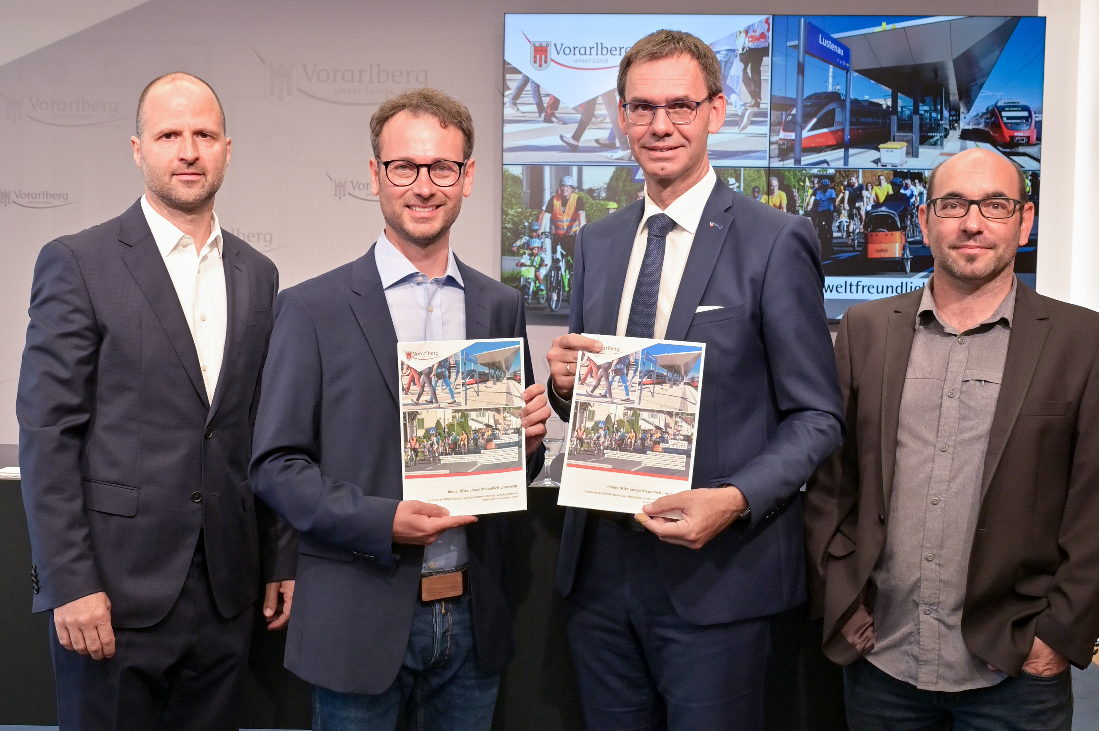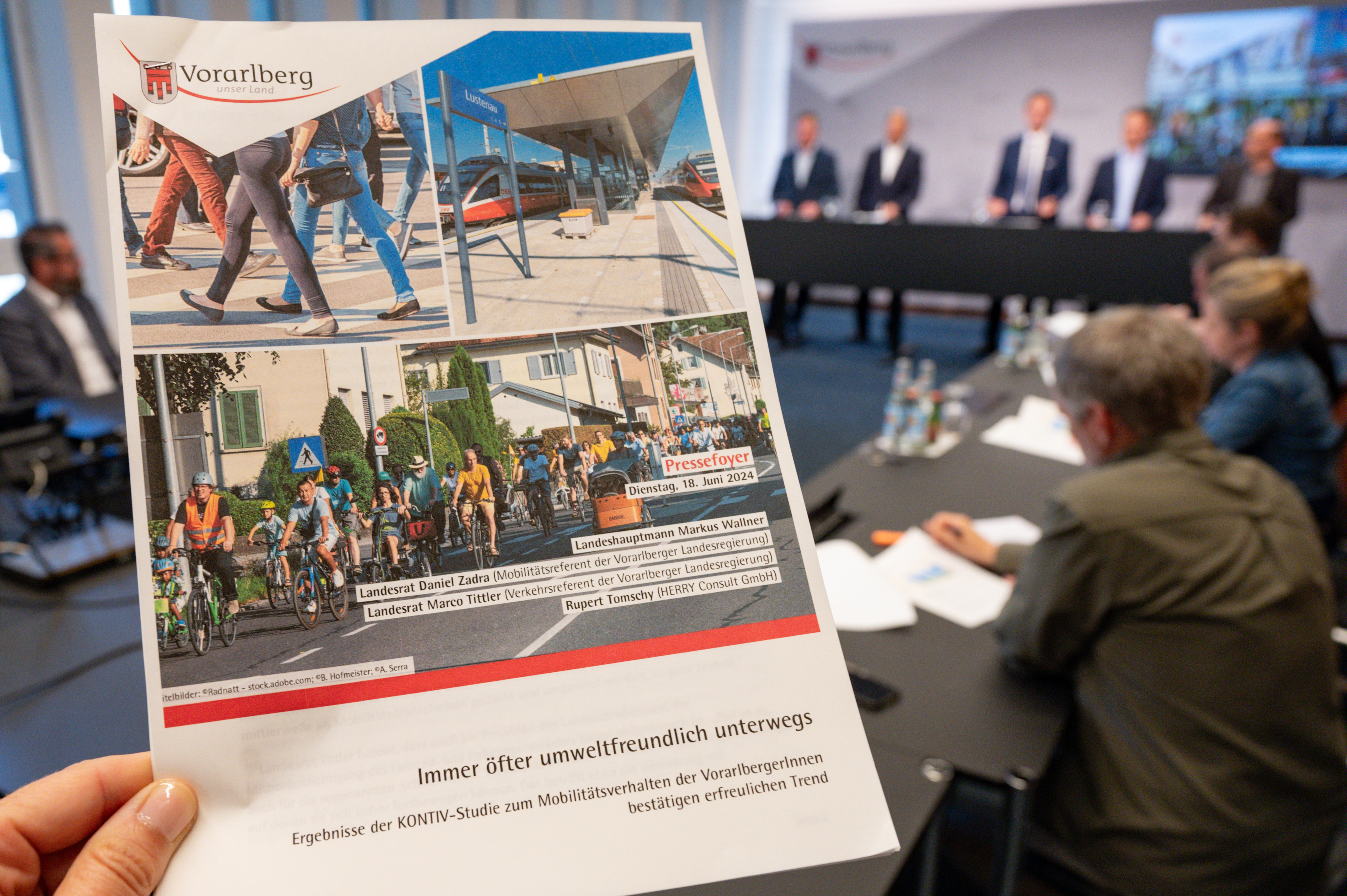 Bregenz (VLK) – Die Ergebnisse der jüngsten KONTIV-Studie zum Mobilitätsverhalten der VorarlbergerInnen bestätigen einen erfreulichen Trend. Erstmals seit Durchführung dieser Erhebungen entfällt mit 50,1 Prozent der überwiegende Anteil der täglich zurückgelegten Wege auf den Umweltverbund – zu Fuß, mit dem Fahrrad oder mit Bus und Bahn. Der Anteil des Pkw ist dagegen leicht zurückgegangen. Das berichteten Landeshauptmann Markus Wallner, Landesrat Daniel Zadra und Landesrat Marco Tittler gemeinsam mit Studienautor Rupert Tomschy im heutigen (Dienstag, 18. Juni) Pressefoyer. „Wir sind auf dem richtigen Weg und erreichen unsere gesteckten Ziele“, sagte Wallner.