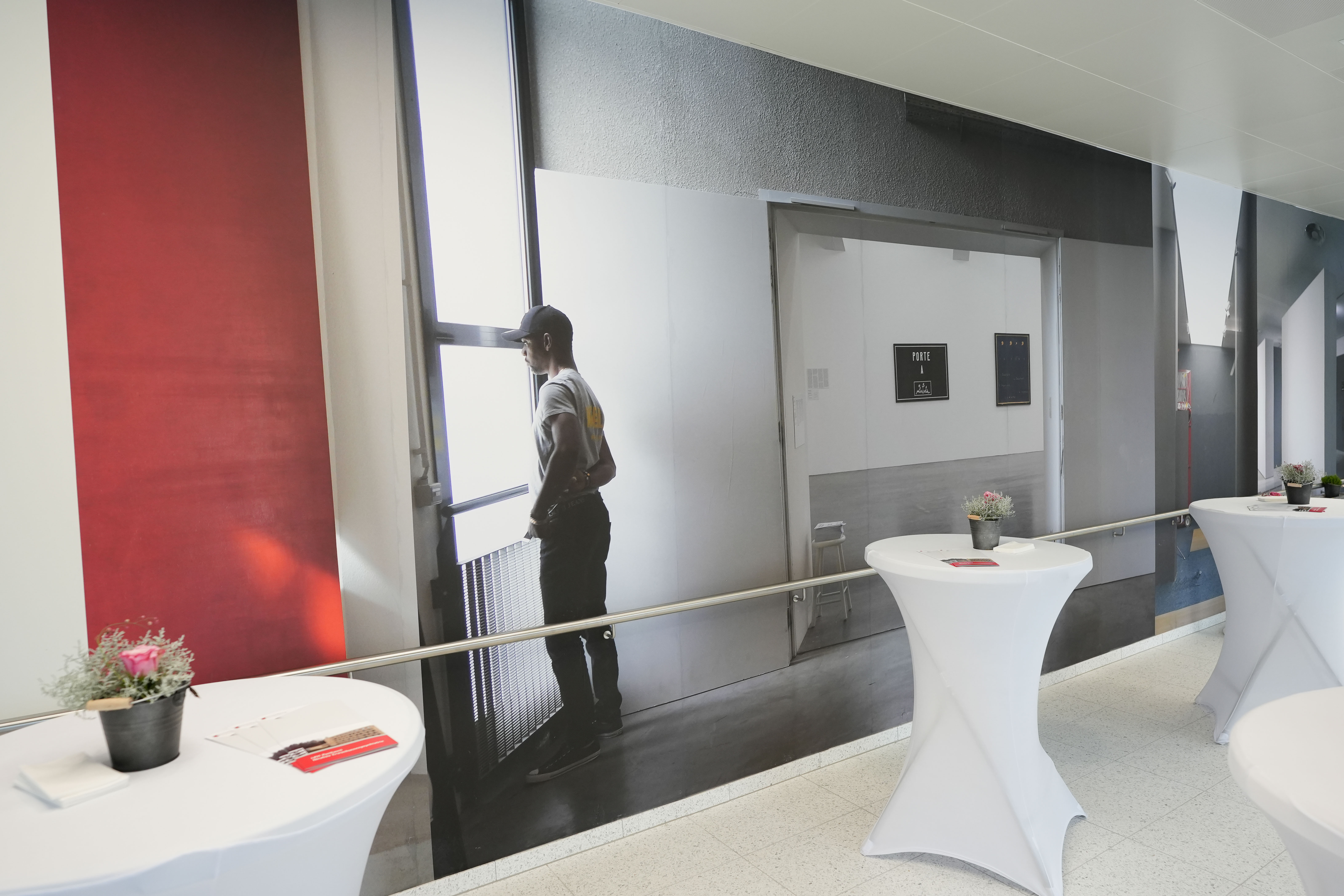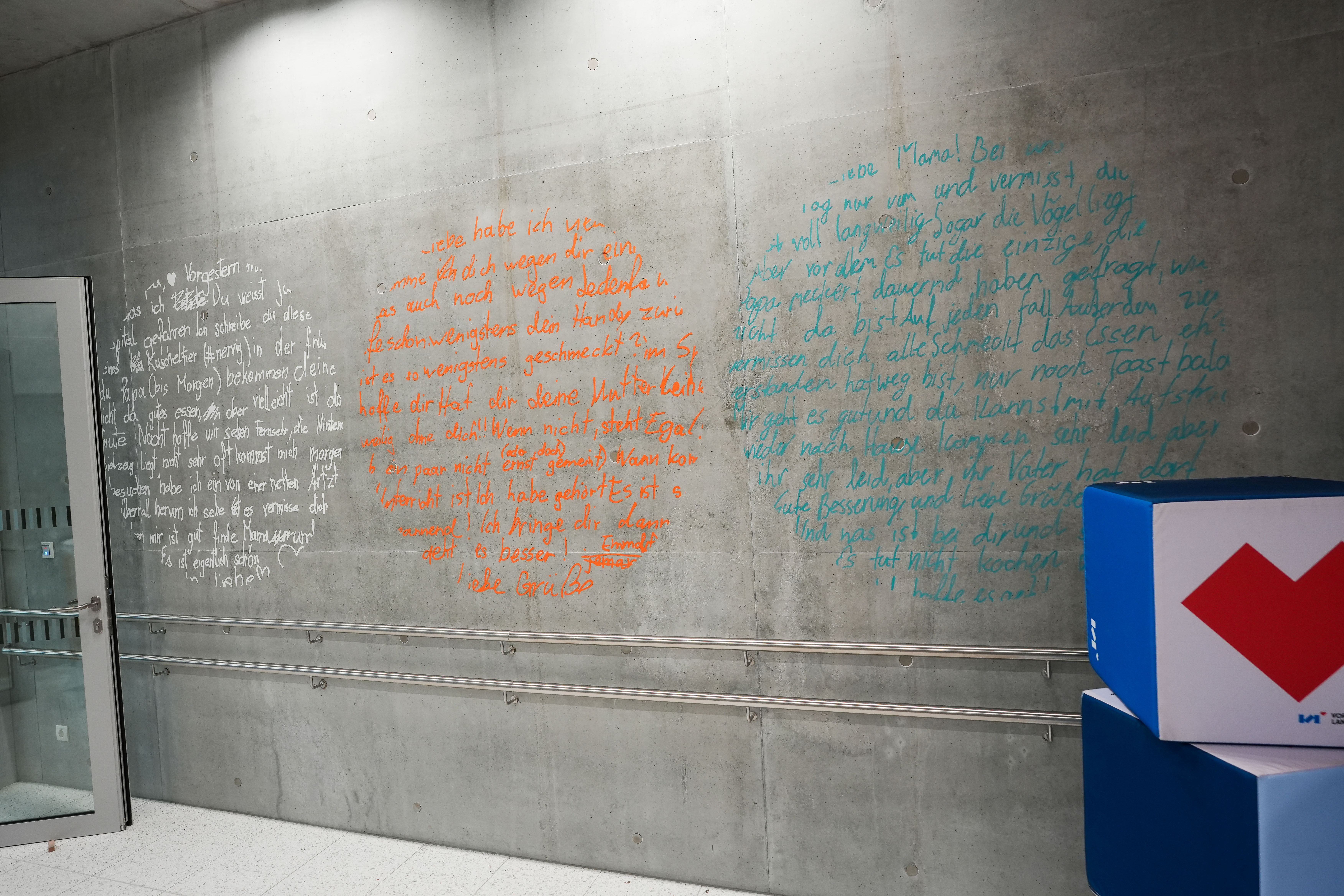 Den Ausgangspunkt für die Rauminstallation von Gabriele Fulterer und Christine Scherrer bilden aneinandergereihte, nur durch ihre Farben den einzelnen Personen zuordenbare Fragmente aus Briefwechseln, die vom Leben innerhalb und außerhalb der Klinik erzählen. Die Textpassagen, die angerissen und weitergedacht werden können, befinden sich auf unterschiedlichen Oberflächen (Glas, Beton).