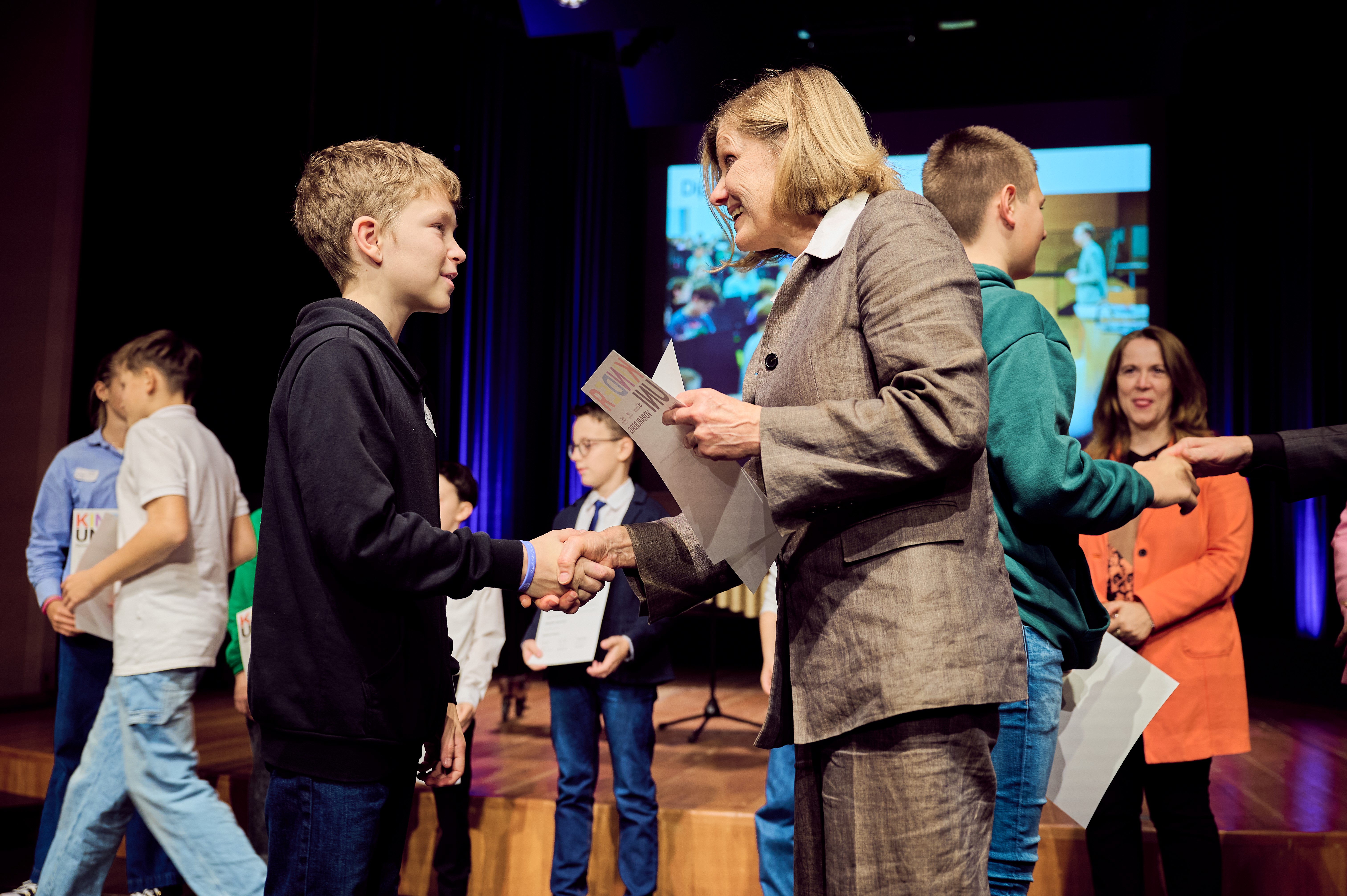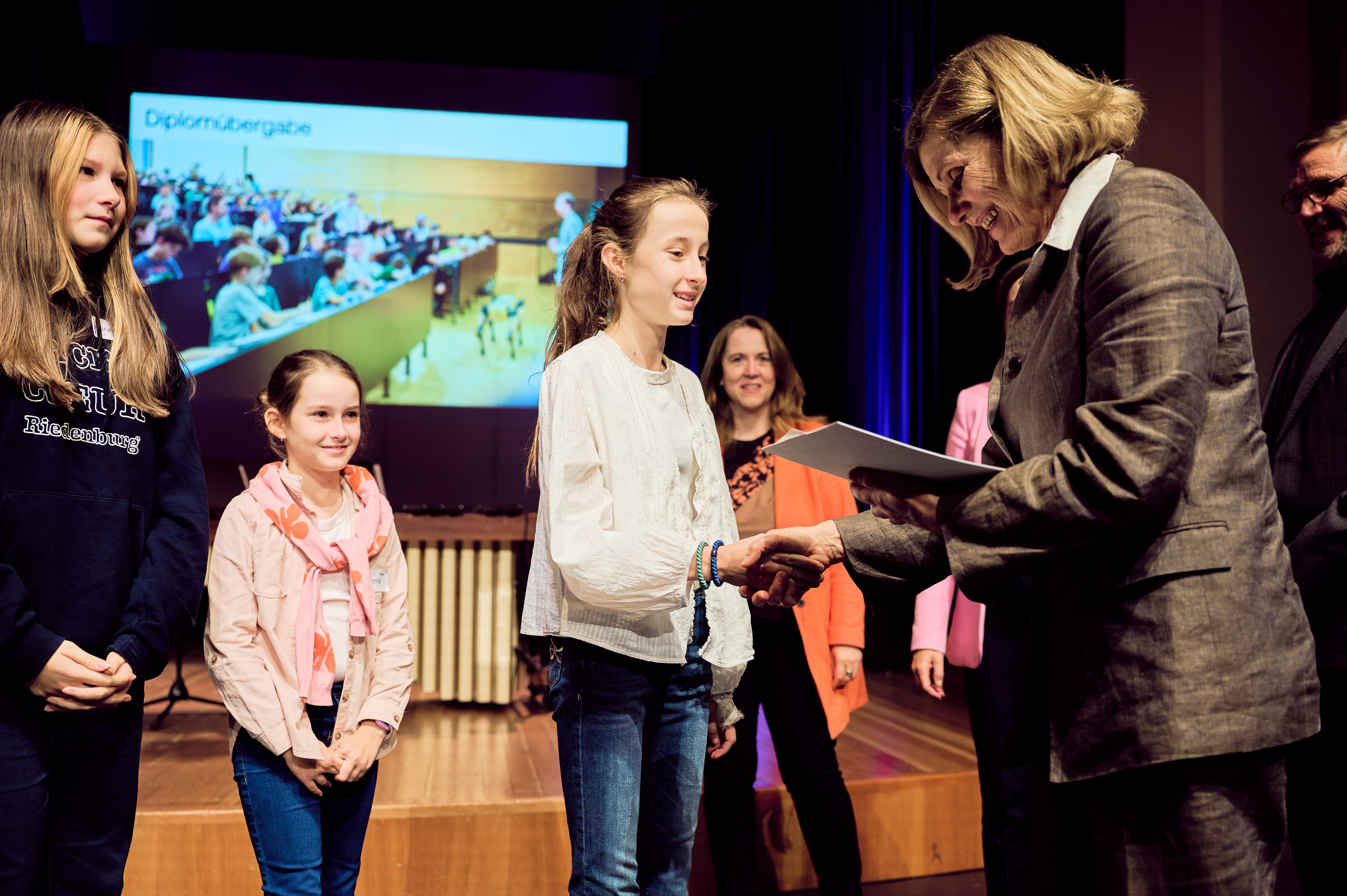 Die Stella Musikhochschule lud zur feierlichen Verleihung der Urkunden an 45 Nachwuchs-Studierende ins Reichenfeld nach Feldkirch. Der Rektor der Stella Musikhochschule, Jörg Maria Ortwein, die Rektorin der Fachhochschule Vorarlberg, Regine Kadgien, und die Rektorin der Pädagogischen Hochschule Vorarlberg, Elisabeth Haas, überreichten den glücklichen und stolzen Kindern ihre Zeugnisse, Bachelor- und Masterabschlüsse. Drei Kinderuni-Studierende erhielten sogar einen Doktortitel, zwei von ihnen bereits ihren zweiten. Landesrätin Barbara Schöbi-Fink freute sich über die rege Beteiligung und betonte: „Die Kinderuni zeigt, wie groß die Neugier und das Entdeckerherz unserer jungen Generation sind. Wer schon früh Freude am Forschen und Verstehen entwickelt, legt den Grundstein für ein lebenslanges Lernen. “