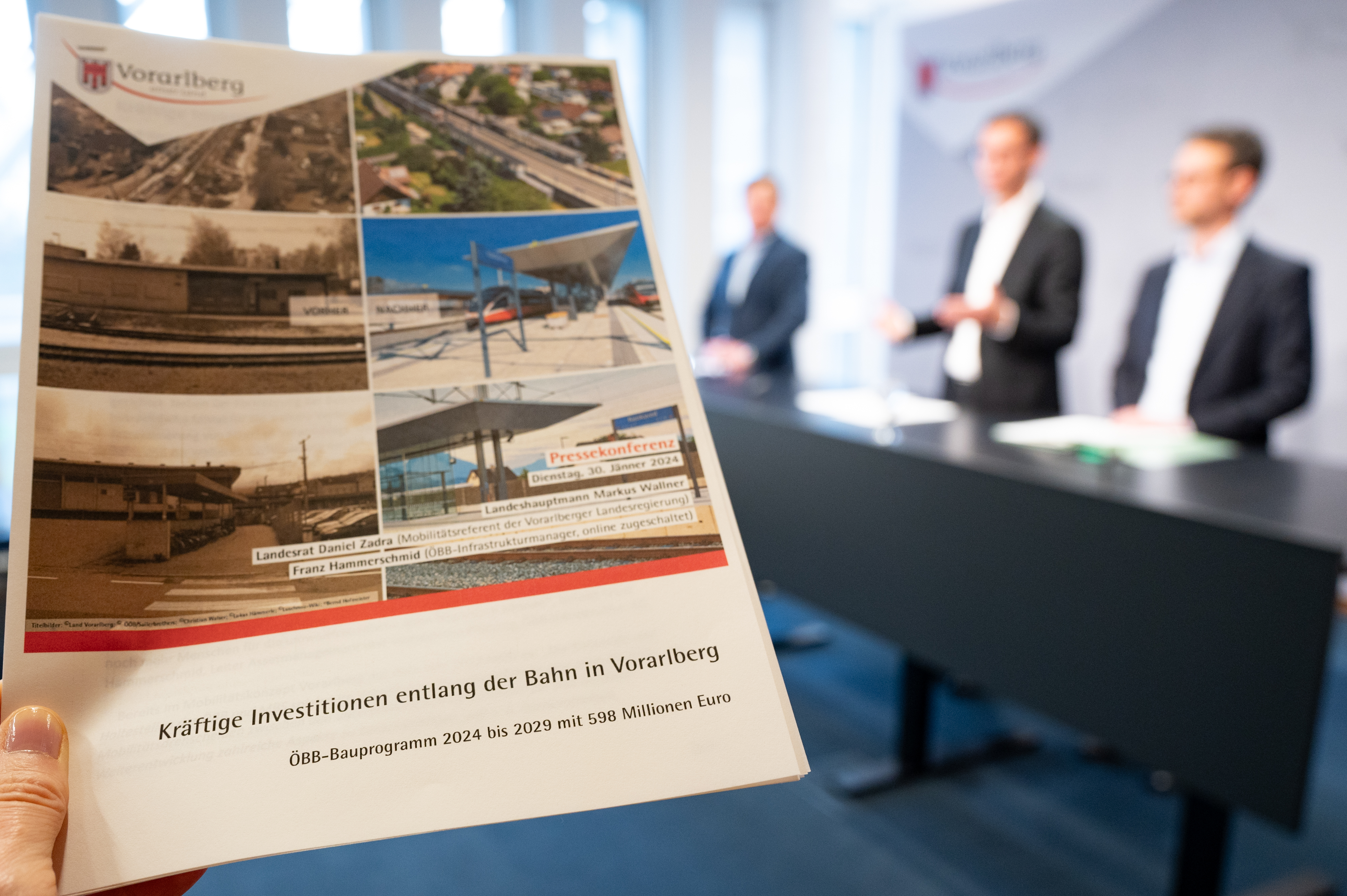 Bregenz (VLK) – Die ÖBB und das Land Vorarlberg haben die Weichen gestellt, um in den kommenden Jahren das Bahnangebot weiter auszubauen und noch attraktiver zu gestalten, informierten Landeshauptmann Markus Wallner und Mobilitätslandesrat Daniel Zadra gemeinsam mit ÖBB-Infrastrukturmanager Franz Hammerschmid im heutigen (Dienstag, 30. Jänner) Pressefoyer. Die ÖBB-Infrastruktur AG plant für ihr Bauprogramm 2024 bis 2029 in Vorarlberg Investitionen von insgesamt 598 Millionen Euro, das Land wird zu diesen Projekten einen Zuschuss in der Höhe von voraussichtlich 47,5 Millionen Euro leisten.