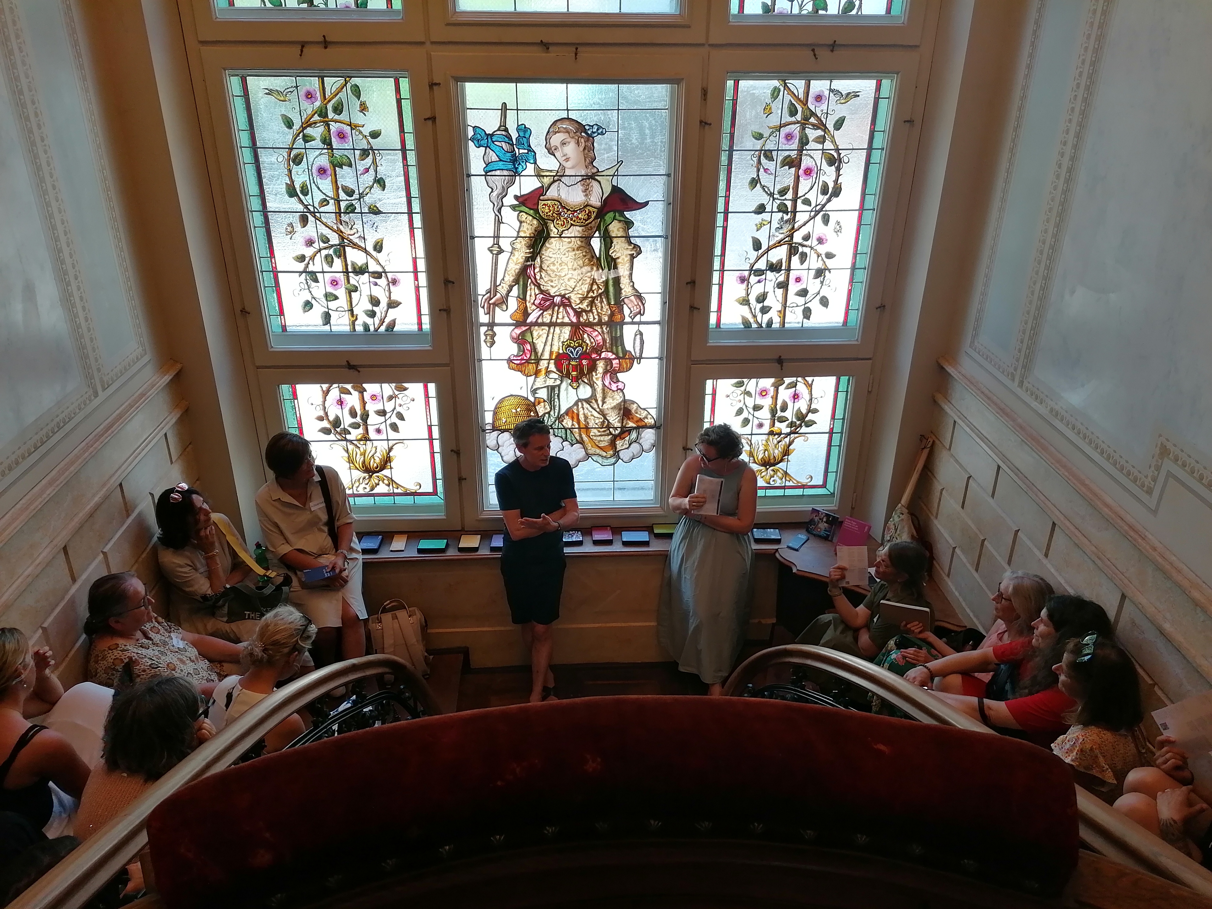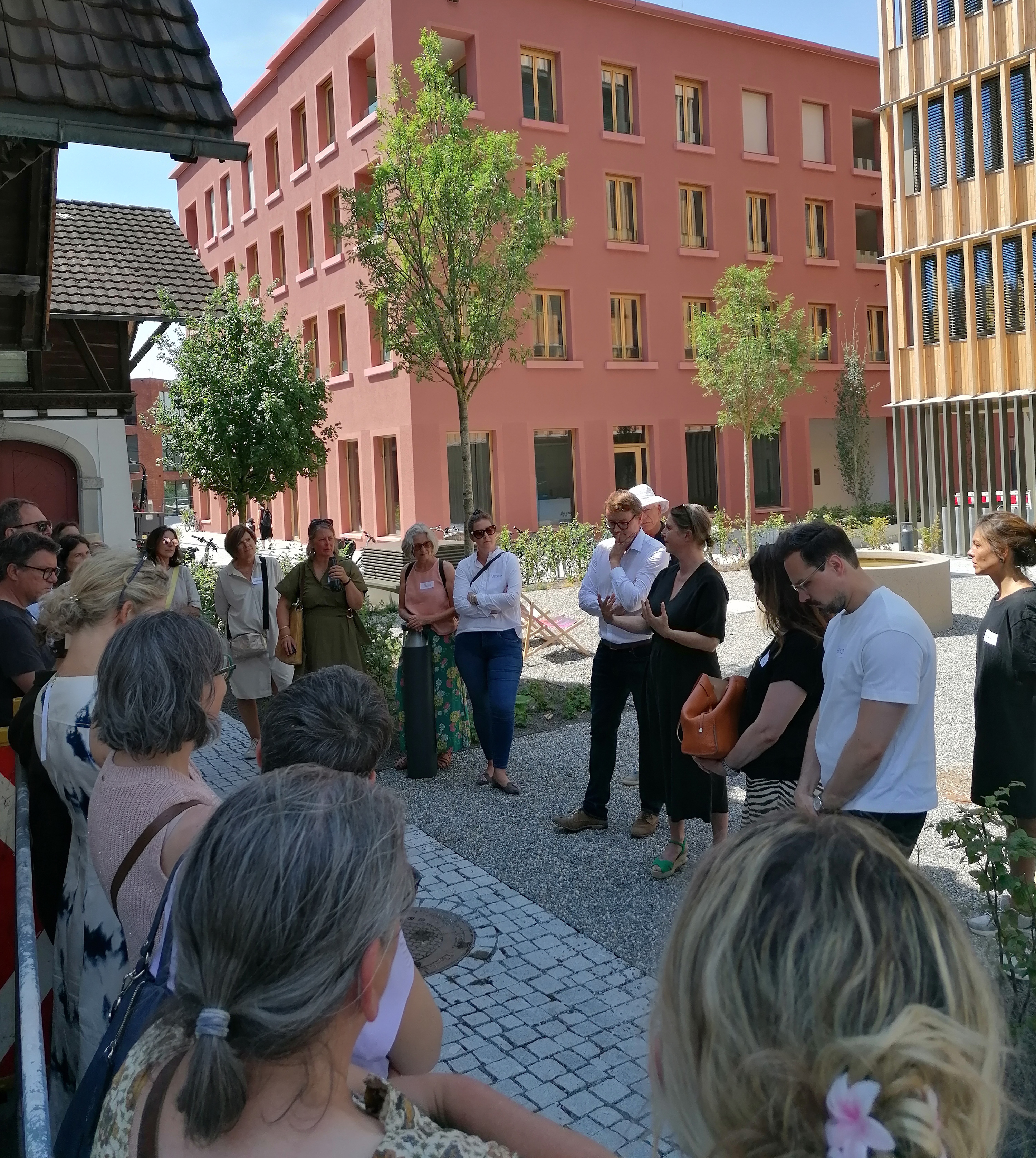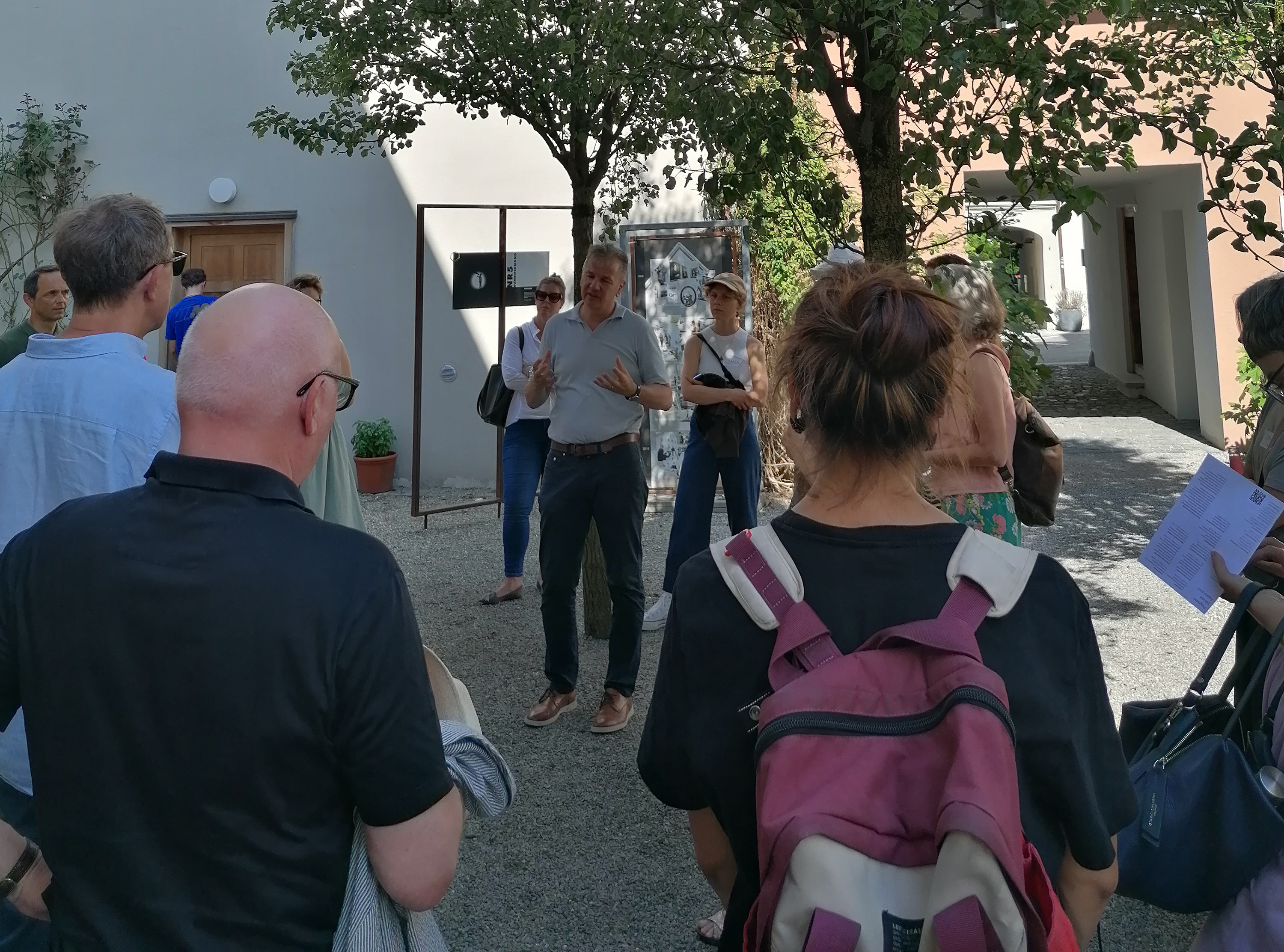 Erste Station der Exkursion war das Literaturhaus Vorarlberg. Dessen Mitbegründer, der Schriftsteller Wolfgang Mörth, führte durch die Räume und Programmschienen und erzählte von persönlichen Erfahrungen beim Kooperieren von Kulturschaffenden und Gastgebenden. Stadtentwickler Markus Schadenbauer berichtete beim Gang durch die Marktgasse über das kreative Geschehen und aktuelle Entwicklungen in Hohenems. Danach zeigte die Künstlerin Nina Teresa Feuerstein den Besucherinnen und Besuchern ihr Atelier in der alten Kanzlei. Zum Abschluss ging es bei Stefanie Brugger im Moritz Bio-Restaurant darum, welche noch ungenutzten Kooperationspotenziale zwischen Kultur und Gastgebenden es gibt.
