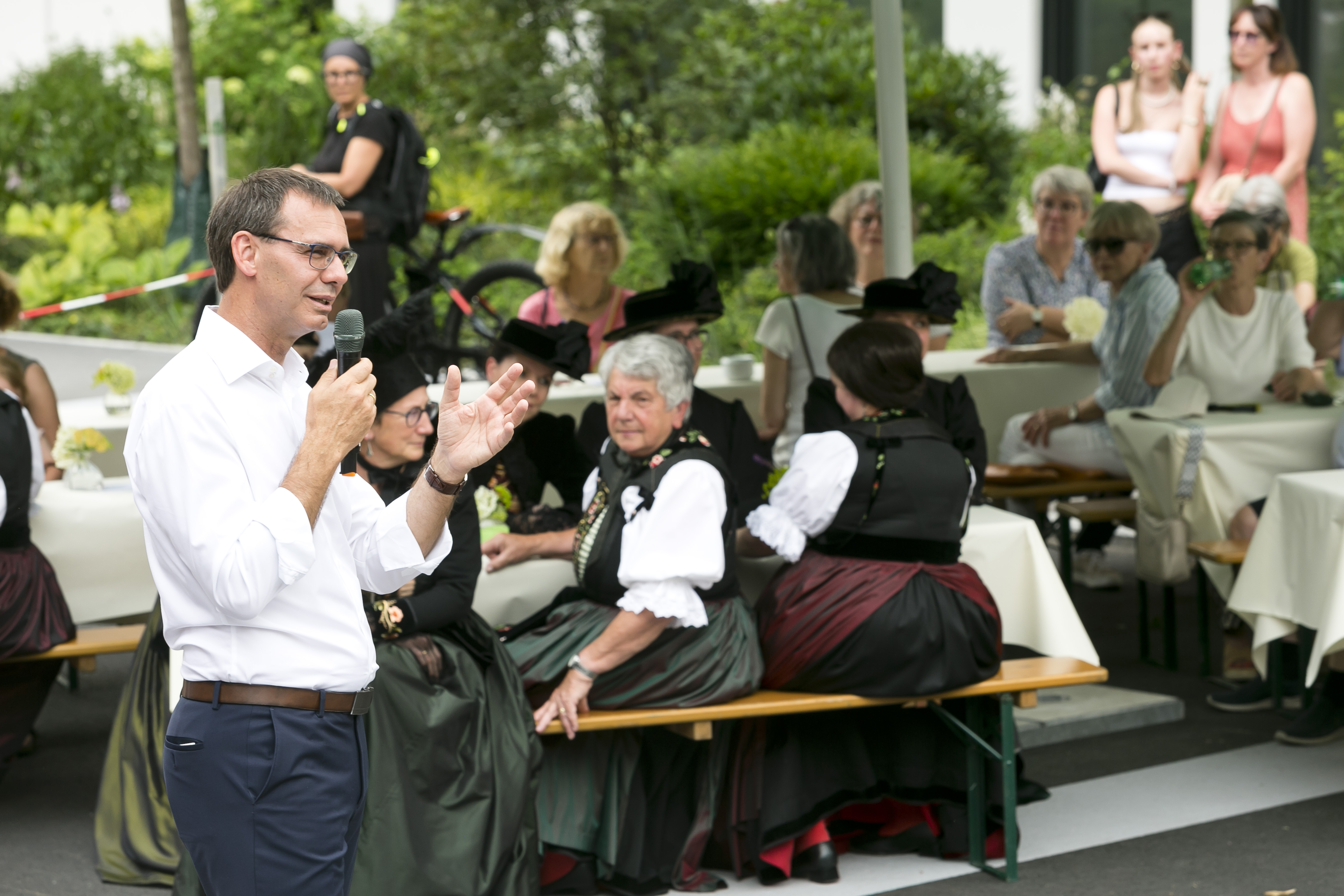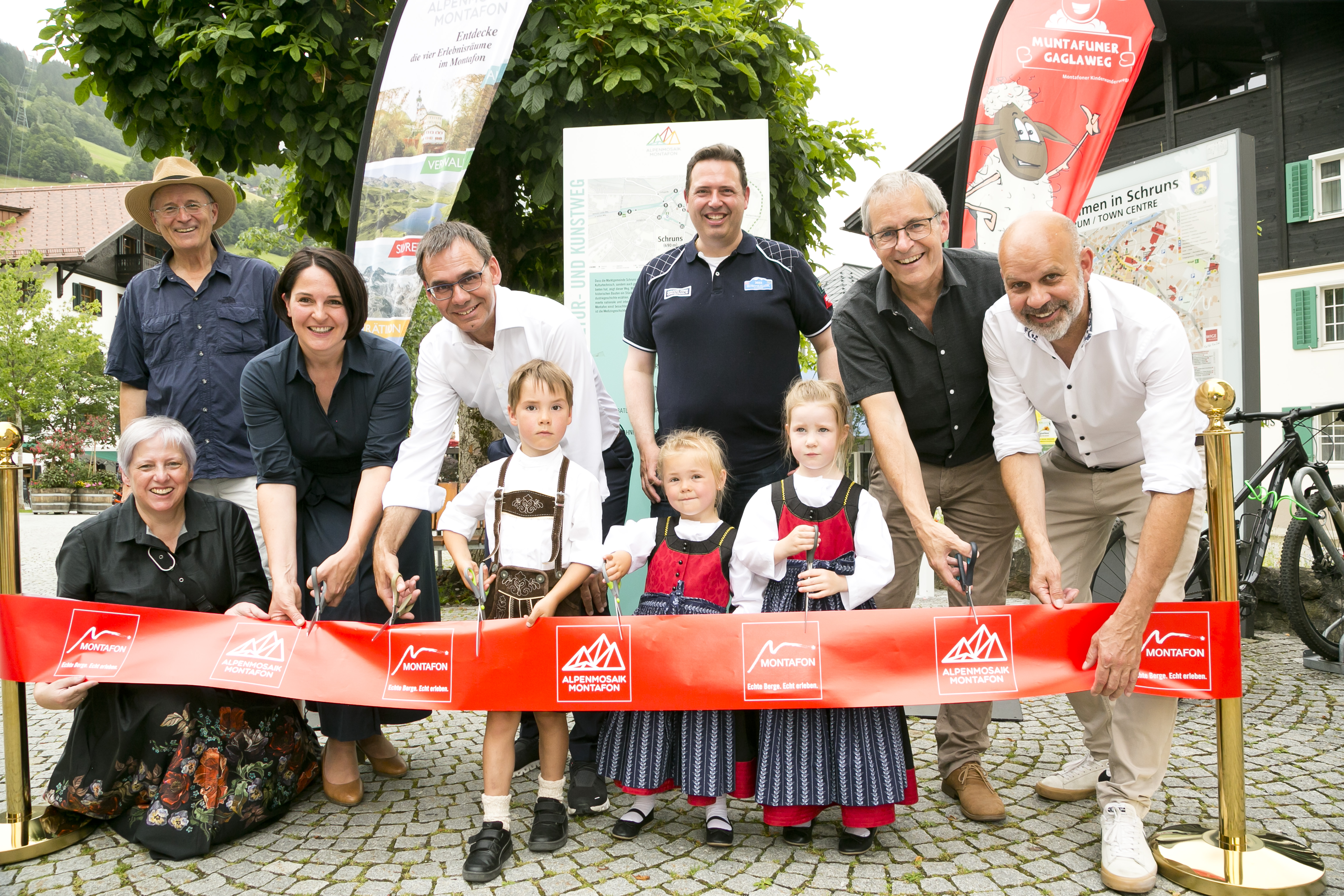 Zahlreiche Gäste kamen zum Straßenfest, um sich ein Bild von der neuen Begegnungszone und dem Kultur- und Kunstweg von Montafon Tourismus zu machen und sich auszutauschen. Der Landeshauptmann bedankte sich bei allen Beteiligten und lobte das Ergebnis: „Ich bin überzeugt, die neue Begegnungszone wird genau das: Ein Ort, an dem sich die Schrunserinnen und Schrunser begegnen, an dem man zusammenkommt.“