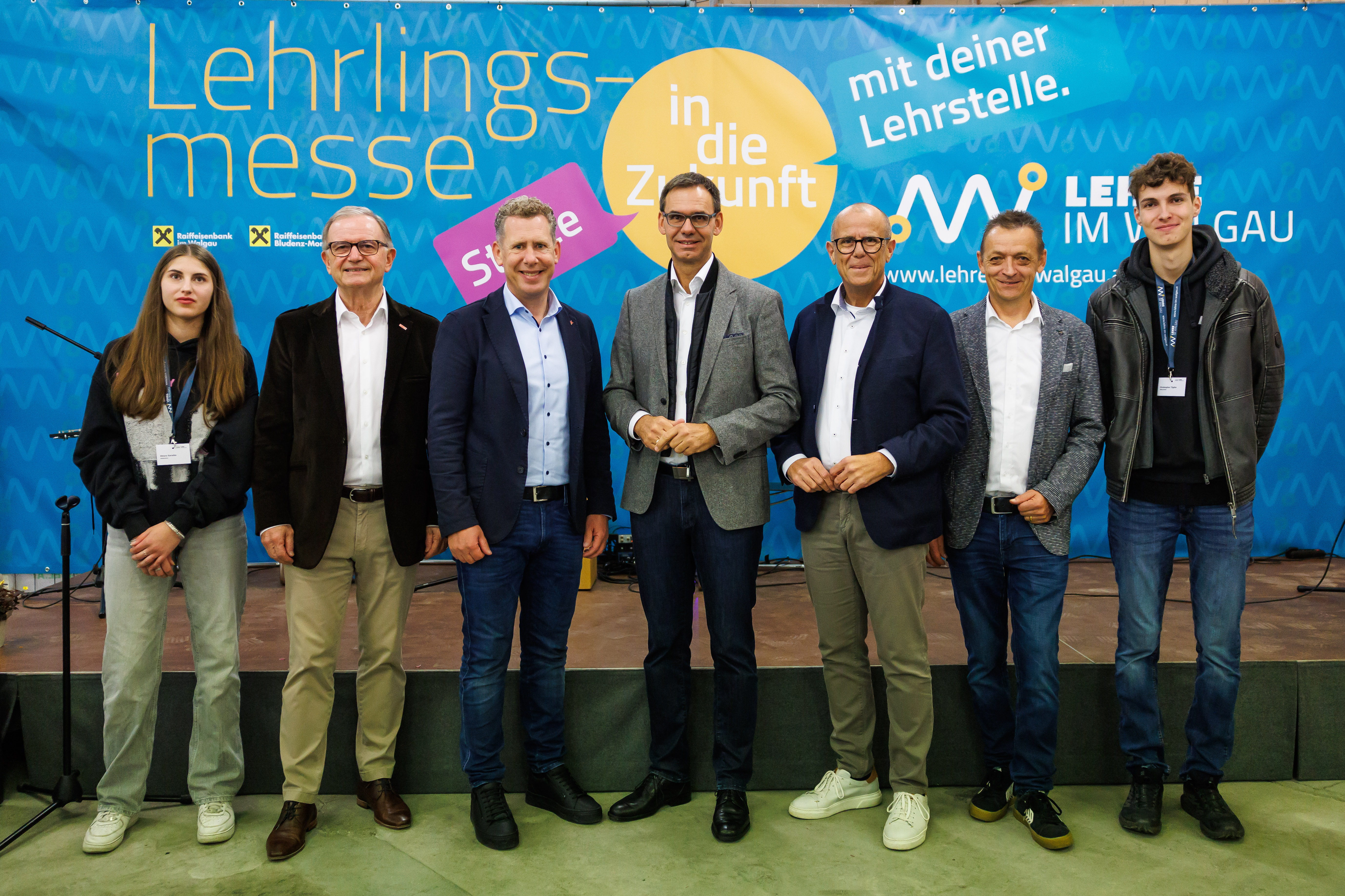 Lehrlings-Moderatorin Meyra Karadas, WK-Präs. Karlheinz Kopf, AK-Präs. Bernhard Heinzle, Landeshauptmann Markus Wallner, Bürgermeister Walter Gohm, Geschäftsführer der Wirtschaft im Walgau Georg Geutze, Lehrlings-Moderator Christopher Töpfer.