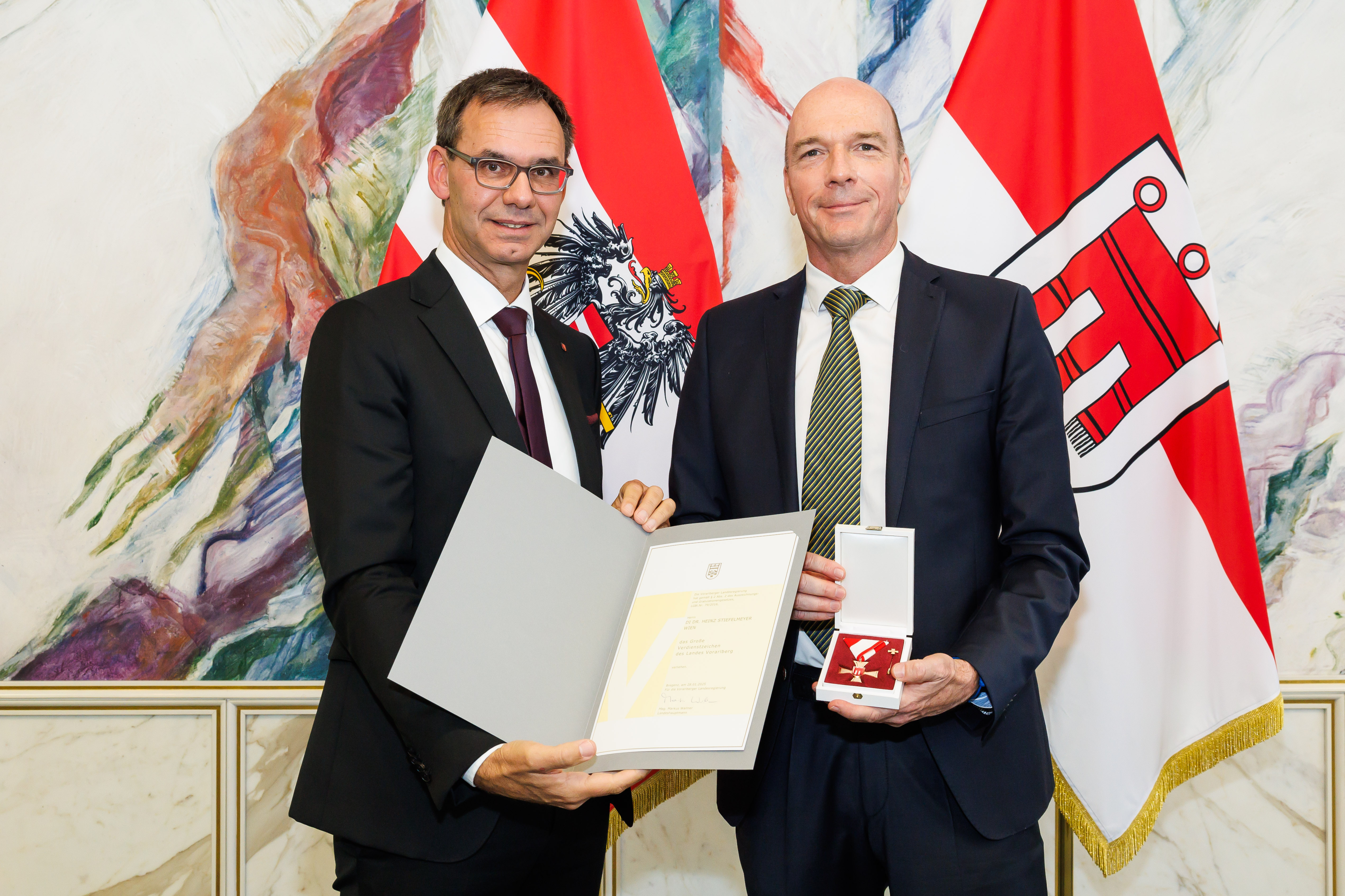 Matthias Ammann aus Nüziders, Wolfgang Burtscher aus Brüssel, Benjamin Lack aus Wolfegg in Deutschland, Heinz Stiefelmeyer aus Wien und Dietmar Summer aus Weiler erhielten von Landeshauptmann Markus Wallner jeweils das Große Verdienstzeichen des Landes.