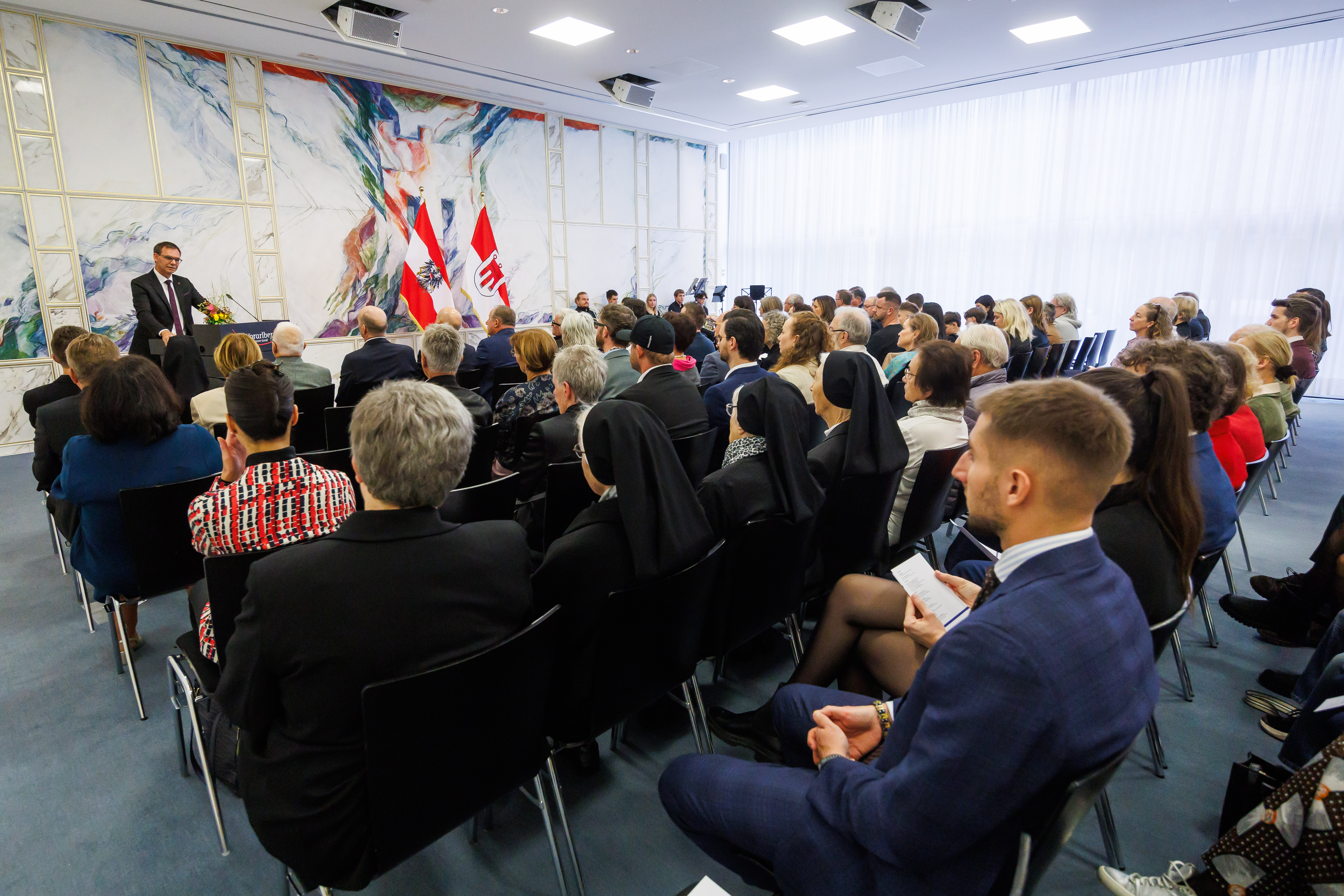Musikalisch umrahmt wurde der Festakt im Montfortsaal des Landhauses in Bregenz von einem Hornensemble der Privathochschule Stella Vorarlberg. Die Laudationes wurden von Augustin Jagg, dem künstlerischen Leiter des Theater KOSMOS in Bregenz, vorgetragen.