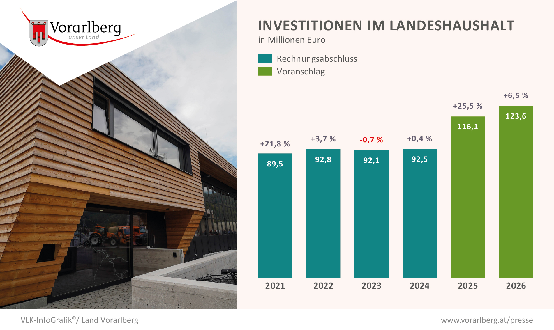 Die vergangenen Krisenjahre zeigen in vielen Lebens- und Arbeitsbereichen noch ihre Auswirkungen, beispielsweise belastet die anhaltende Rezession weiterhin den Arbeitsmarkt. Diese Rahmenbedingungen machen es umso nötiger, den Blick klar nach vorne zu richten und Antworten zu geben. Für 2026 steht daher im Zentrum, die sich vorsichtig ankündigenden Aufschwungstendenzen aufzugreifen und zu unterstützen. „Am Weg raus aus der Rezession kann es nur um zwei Dinge gehen: Erstens um den verantwortungsvollen Umgang mit den eigenen Ressourcen und zweitens darum, mit gezielten Investitionen Signale an die Wirtschaft zu senden. In wirtschaftlich schwierigen Zeiten ist es essentiell, Investitionsimpulse zu setzen, die Arbeitsplätze schaffen und den Standort Vorarlberg stärken“, so Landeshauptmann Markus Wallner. Insgesamt sind im Landesvoranschlag 2026 Investitionen in das Landesvermögen in Höhe von 123,6 Millionen Euro vorgesehen. Das ist eine erneute Steigerung um 7,0 Prozent, nachdem bereits im Jahr 2025 ein Rekord aufgestellt wurde.
