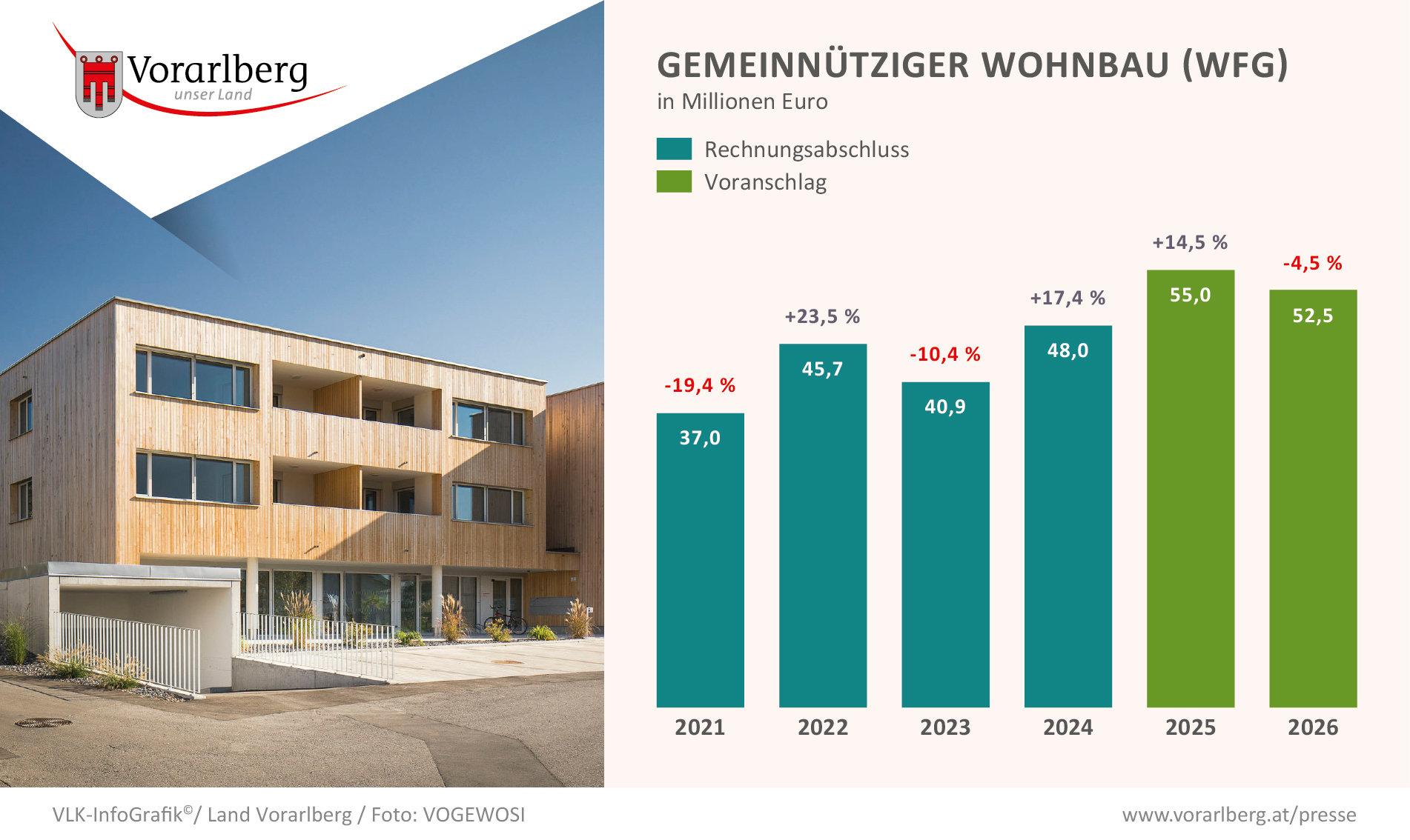 Rund 98 Prozent der Vorarlbergerinnen und Vorarlberger leben in einer Gemeinde, in der gemeinnütziges Wohnen angeboten wird. Zum Stichtag 31. Dezember 2024 waren bei den Gemeinden 6.126 Anträge auf eine gemeinnützige Miet- bzw. Kaufanwartschaftswohnung oder „betreutes Wohnen“ vorgemerkt. Diese Zahlen belegen die Bedeutung des gemeinnützigen Wohnbaus als eine wichtige Säule neben dem privaten freifinanzierten oder auch geförderten Wohnbau zur bedarfsgerechten Versorgung mit Wohnraum. Im Landeshaushalt 2026 sind dafür 52,5 Millionen Euro veranschlagt. Zu den Schwerpunkten zählen weiterhin das Sonderwohnbauprogramm „WOHNEN550®“, die Sanierungsoffensive sowie Nachverdichtung und das Mietkauf-Modell.