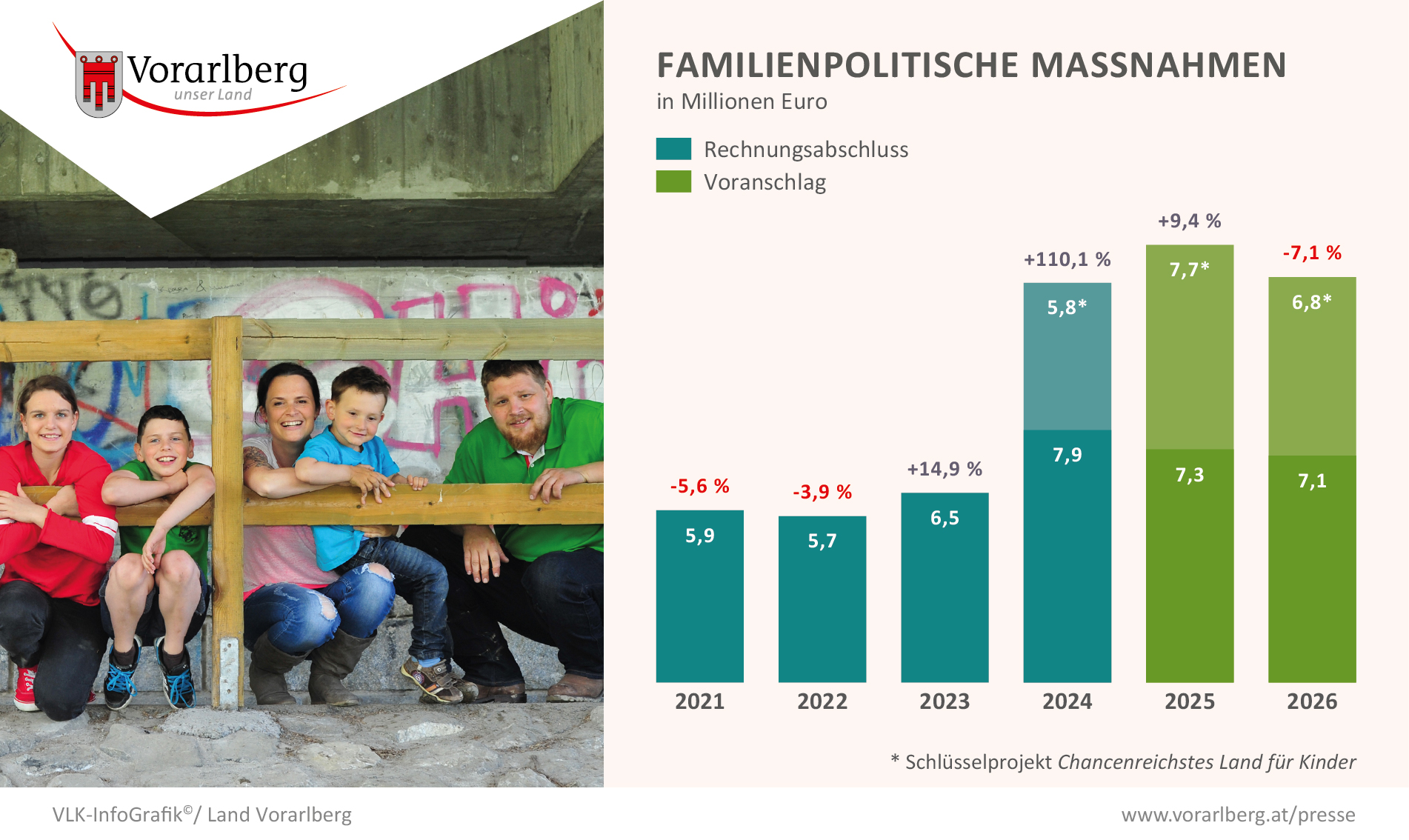 Die Mittel für Familienförderung bzw. familienpolitische Maßnahmen (ohne Kinder- und Schülerbetreuung) bleiben weiterhin hoch und inkludieren das Schlüsselprojekt „Chancenreichstes Land für Kinder“ der Marke Vorarlberg.