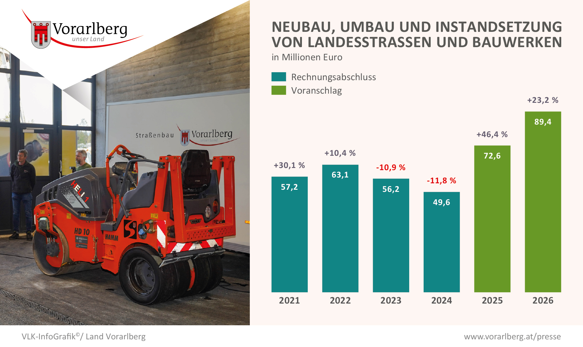 Der Landesstraßenbau ist im Voranschlagsentwurf 2026 des Landes Vorarlberg mit insgesamt 118,9 Millionen Euro dotiert (ohne Personalkosten). 21,6 Millionen Euro entfallen auf den Betrieb und die Instandhaltung des Landesstraßennetzes. In die Bau- und Instandsetzungsmaßnahmen der Landesstraßenanlagen (inkl. Projektierung und Kauf von Grundstücken) sowie in Maßnahmen zur Erhöhung der Verkehrssicherheit werden 89,4 Millionen Euro investiert. Beim Großprojekt Stadttunnel Feldkirch soll im 1. Quartal 2026 der Tunnelanschlag (Start Vortrieb Haupttunnel) stattfinden, für dieses Projekt werden 48 Millionen Euro bereitgestellt.