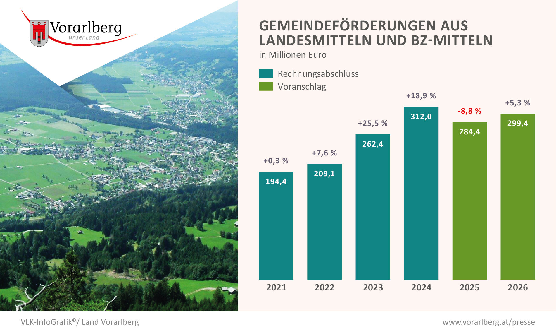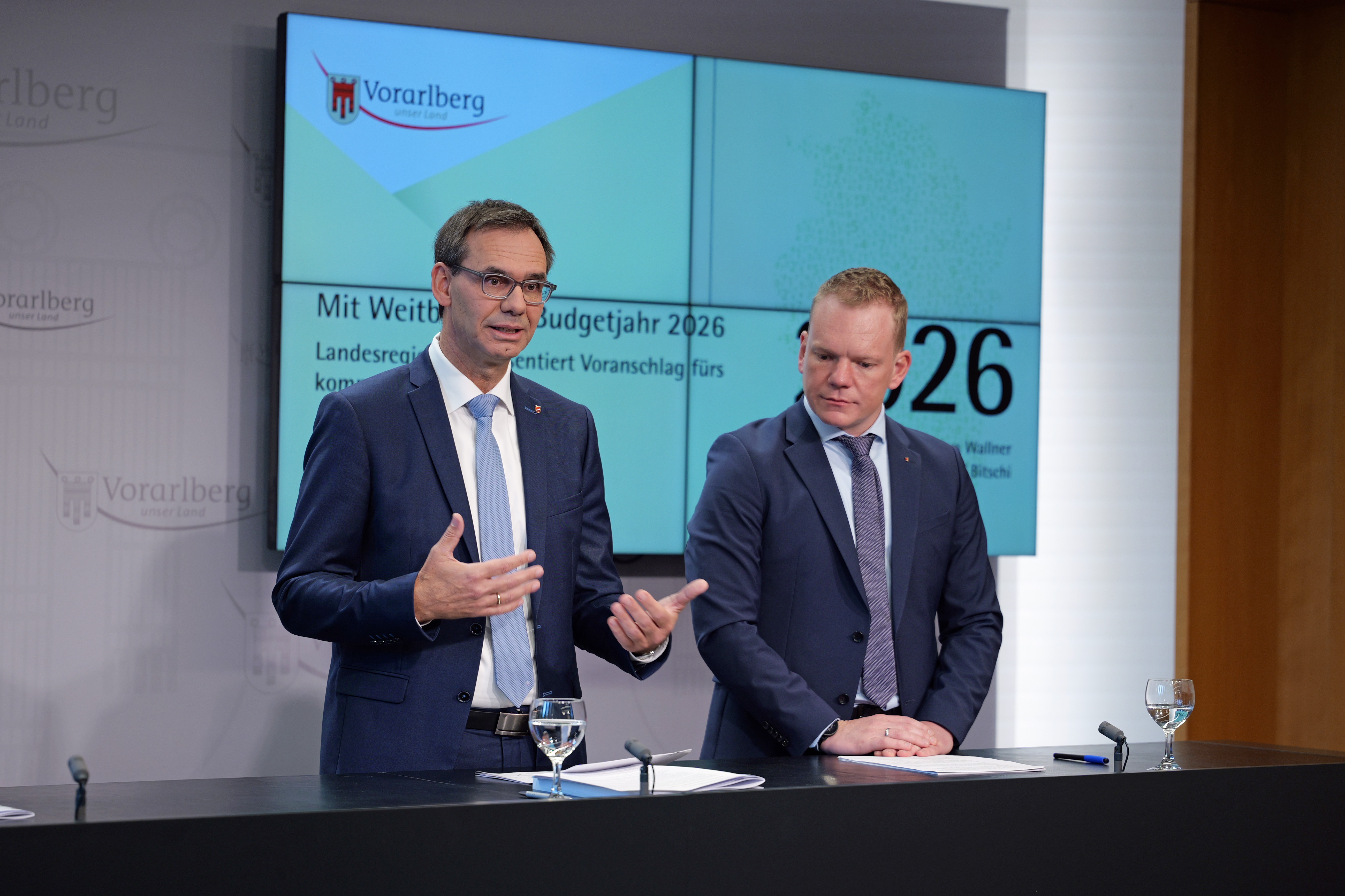 Im von der Vorarlberger Landesregierung einstimmig beschlossenen und dem Landtag zur Beschlussfassung übermittelten Budgetentwurf 2026 stehen (inkl. Aufnahme eines Darlehens i.H.v. 200 Mio. Euro) Einzahlungen in Höhe von 2.826.534.800 Euro, Auszahlungen in Höhe von 2.840.973.900 Euro gegenüber. Durch strikte Budgetdisziplin soll die Neuverschuldung auf unter 200 Millionen Euro gedrückt werden.