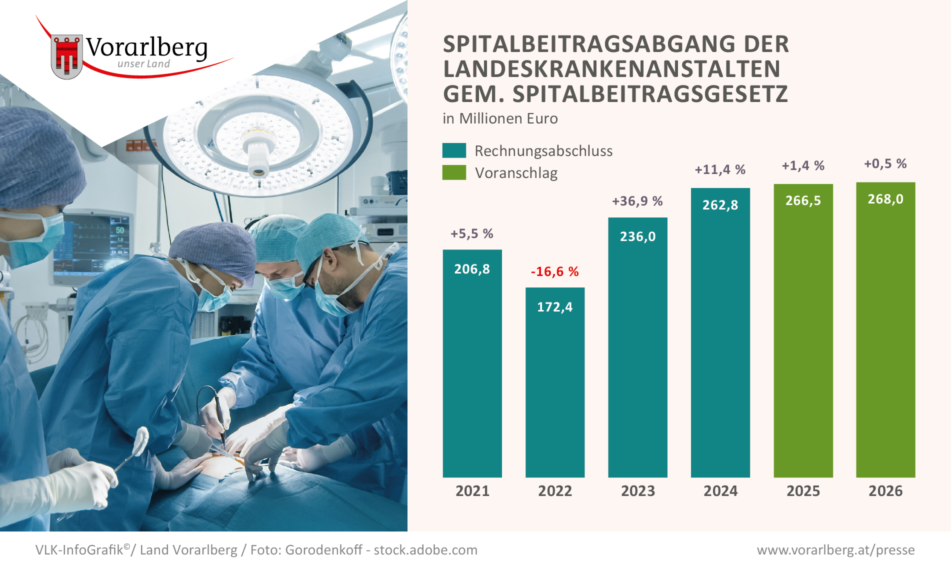 Der Voranschlag der Krankenhausbetriebsgesellschaft (KHBG) für das Wirtschaftsjahr 2026 sieht einen Spitalsbeitragsabgang für die Landeskrankenanstalten in Höhe von 268 Millionen Euro vor. Das ist eine Steigerung um 0,5 Prozent, die im Wesentlichen durch die steigenden Personal- und Sachkosten der KHBG begründet ist.